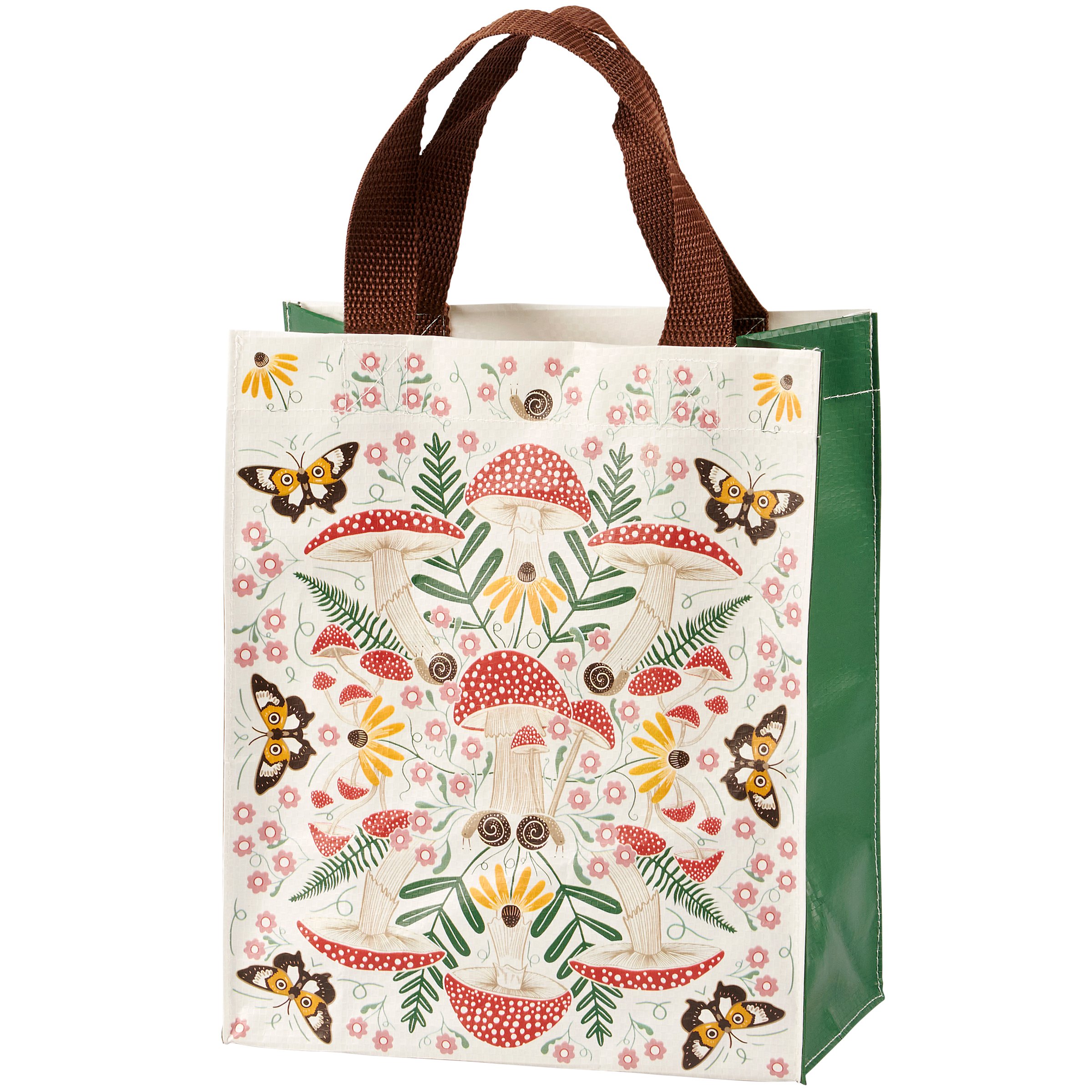 A double-sided daily tote from our Cottagecore Collection displaying a folk art inspired pattern of mushrooms, wildflowers, and butterflies replicated from original hand illustrated art. Mushroom tote gussets display a coordinating green color. Our Mushroom Art tote bag is made from eco-friendly post-consumer material and includes complementing brown nylon straps. Tote bag folds flat for convenient storage. A nature-themed accessory perfect for everyday use or for premium gift wrapping.