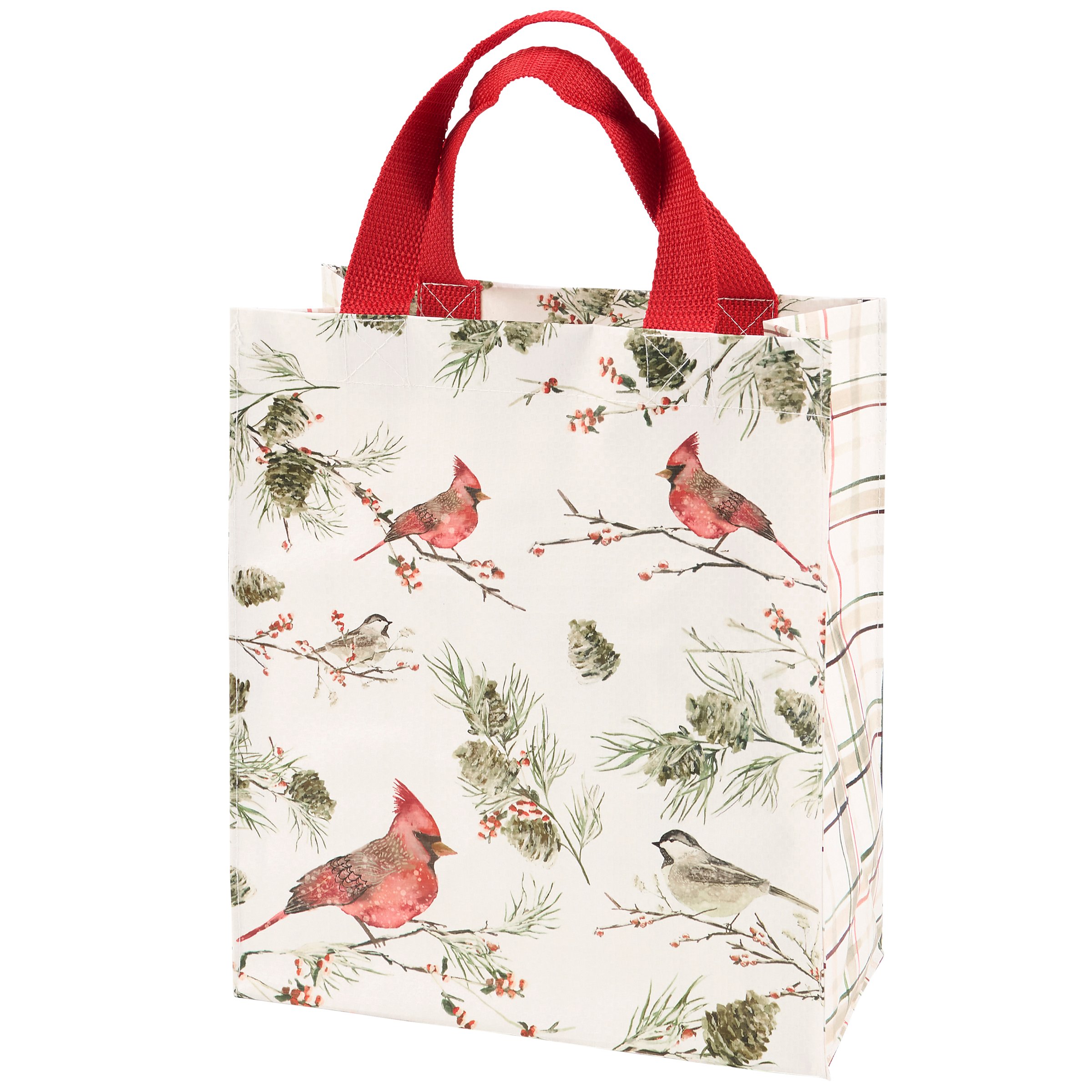 A double-sided daily tote from our Christmas Collection displaying a pattern of winter birds on branches replicated from original artwork hand painted in a unique watercolor style. Winter tote gussets feature a coordinating winter inspired plaid pattern. Our Winter Birds daily tote is made from eco-friendly post-consumer material and includes complementing red nylon straps. Seasonal tote folds flat for compact storage. A charming winter-themed tote perfect for a seasonal accessory or great for reusable gift wrapping.