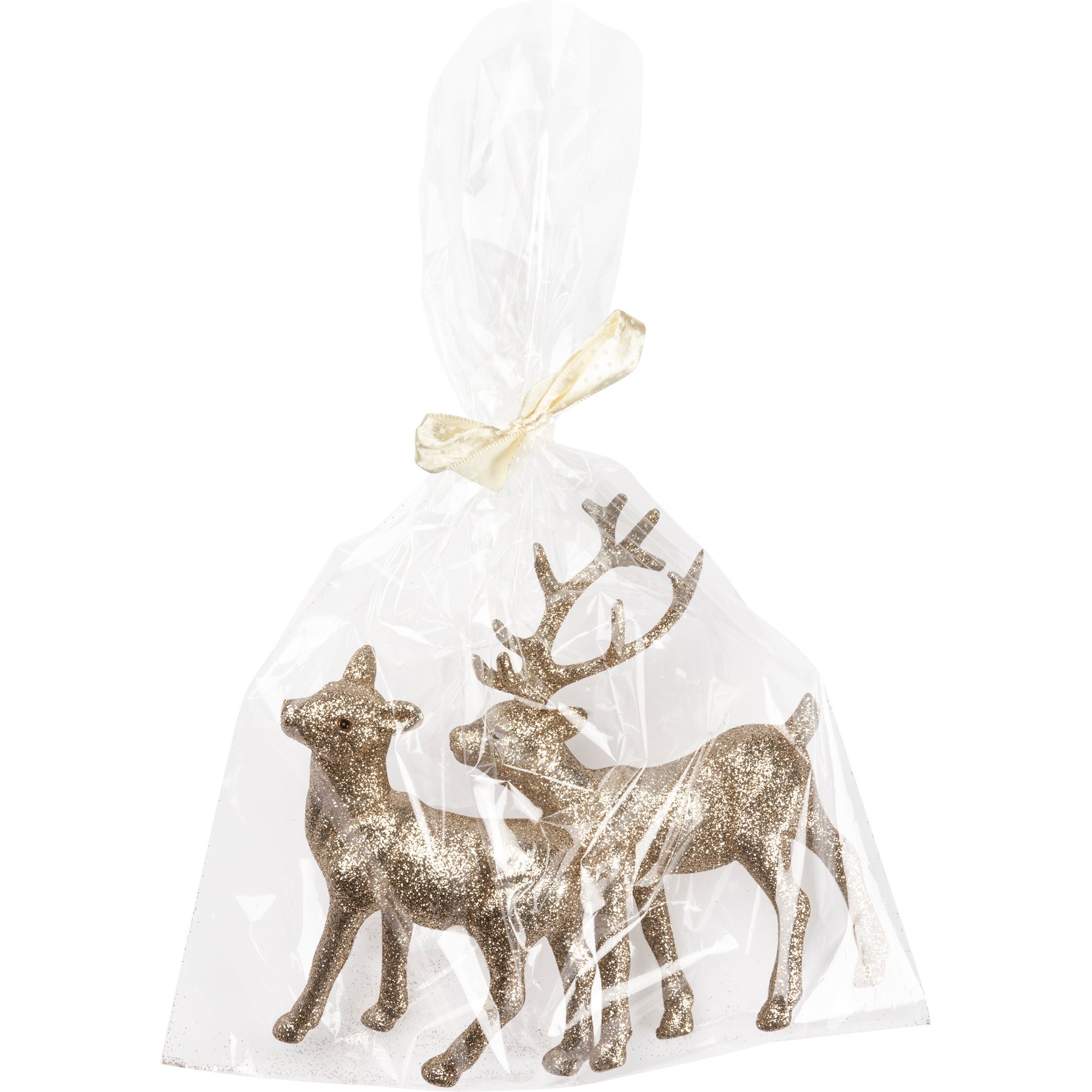 A set of two plastic deer figurines, including a doe and a buck, featuring an all-over champagne-colored glitter coating. Neatly packaged in a polybag and tied with ribbon.