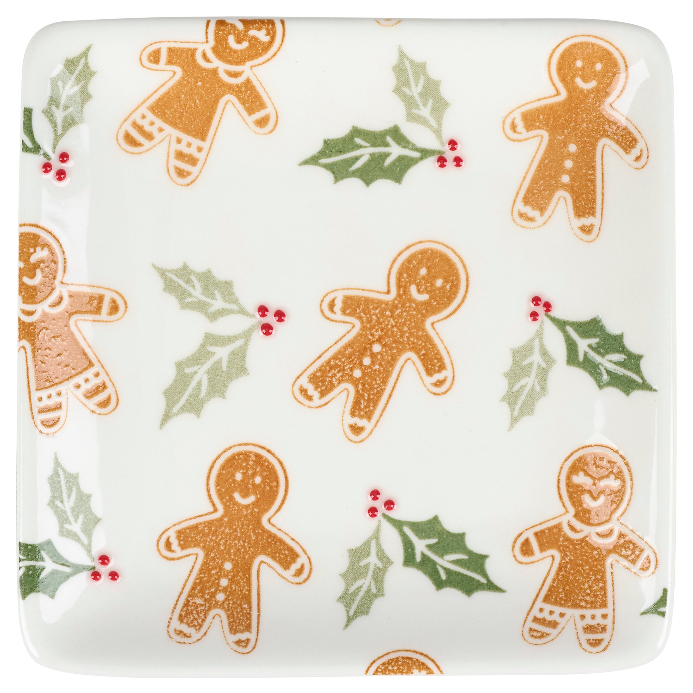 A durable ceramic dessert plate from our Gingerbread Collection featuring a gingerbread man and holly pattern on the serving area of the plate. Our Gingerbread dessert plate is conveniently microwave, oven, dishwasher, and food safe for easy use. A piece of seasonal dishware perfect for gingerbread themed tablescapes.