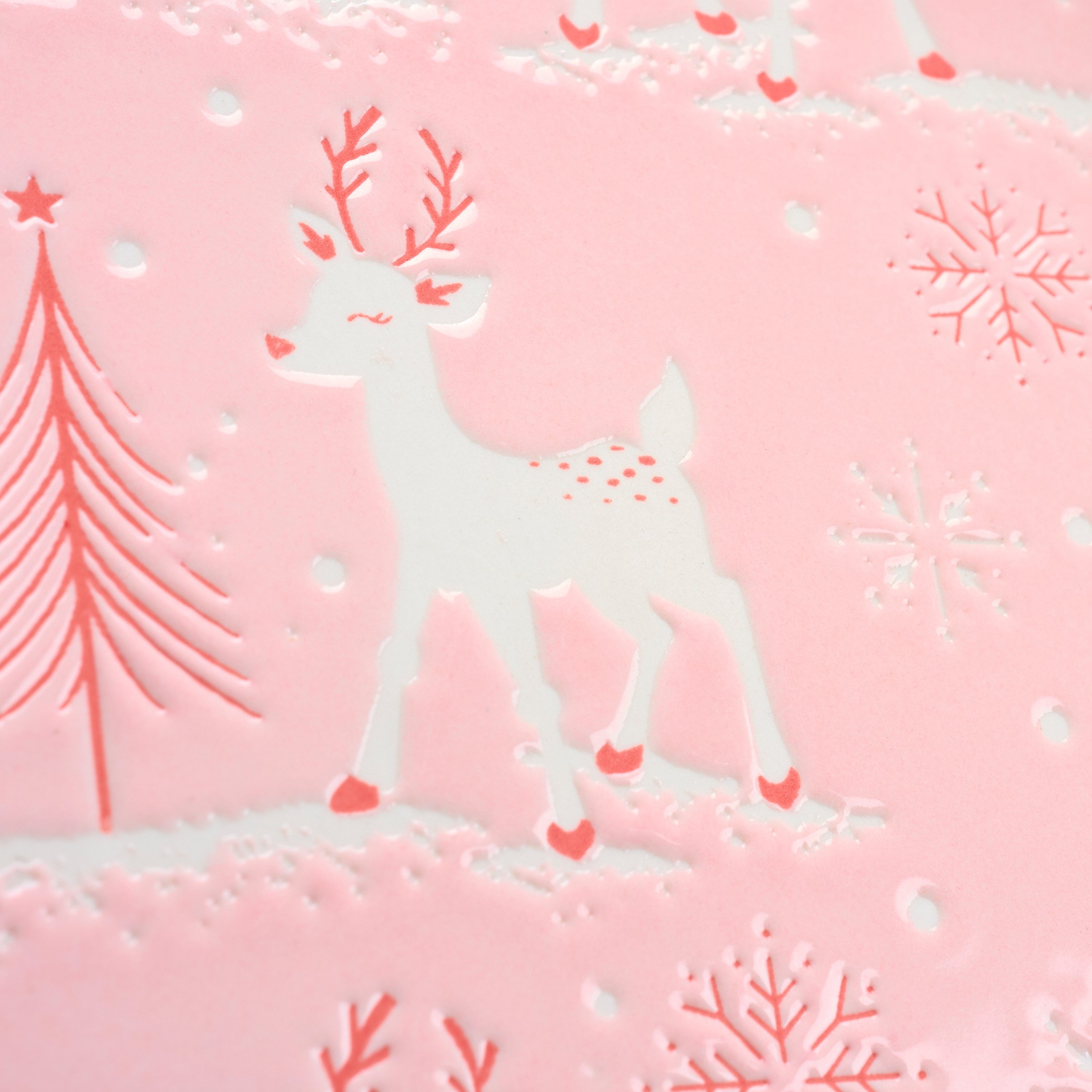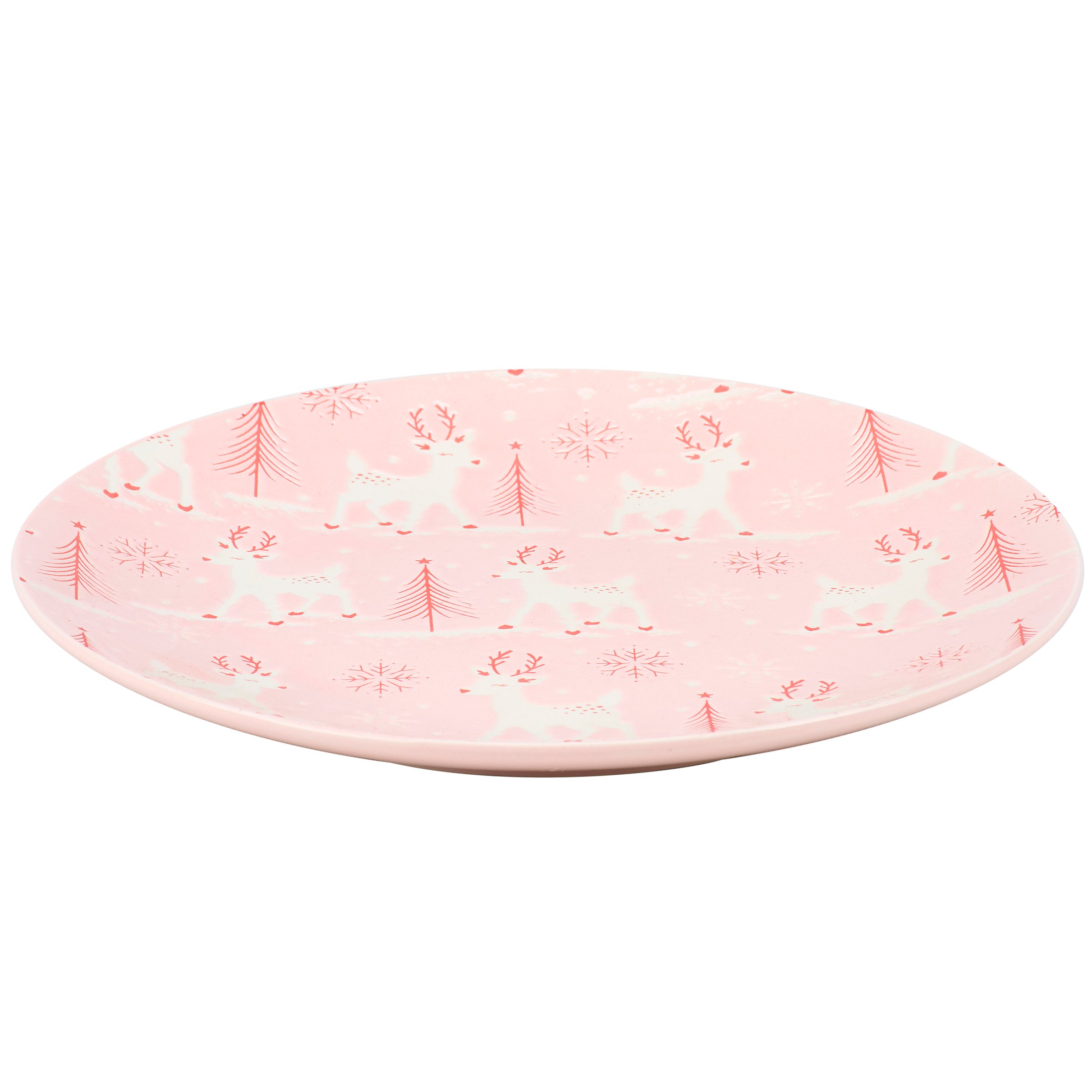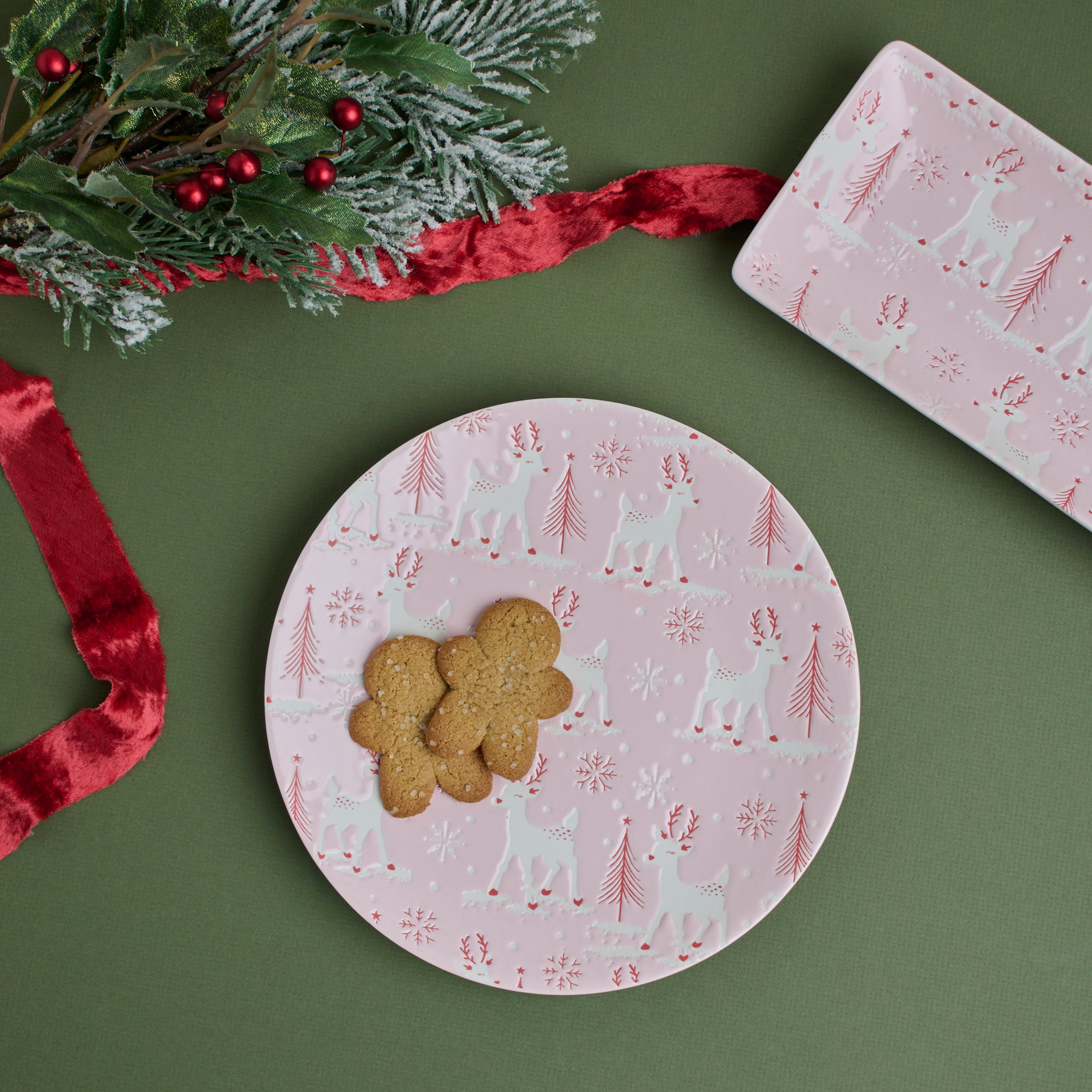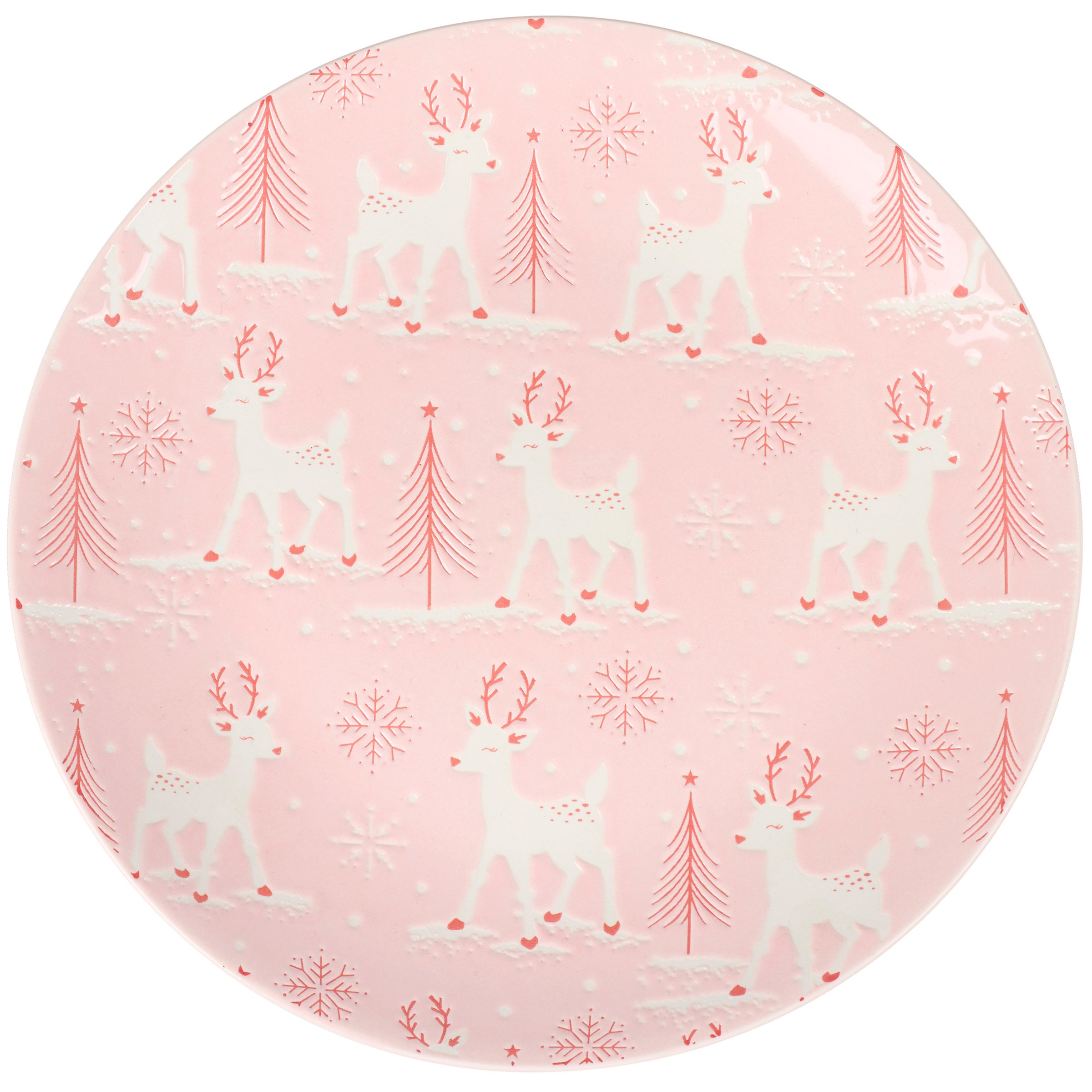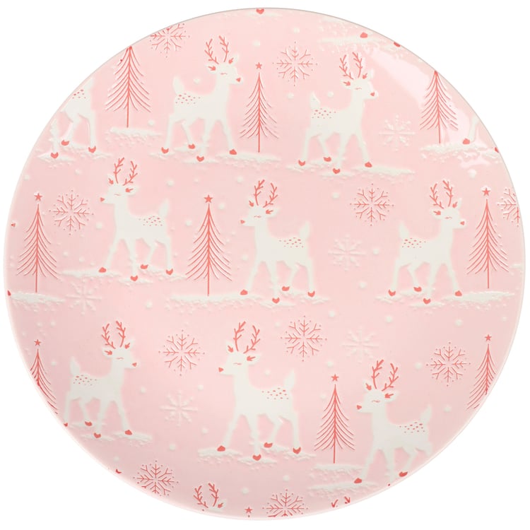 A durable ceramic dinner plate from our Christmas Collection featuring a holiday pink pastel color with debossed patterns of reindeer, snowflakes, and Christmas trees on the serving area of the plate. Our Pink Reindeer dinner plate is conveniently microwave, oven, dishwasher, and food safe for easy use. A piece of seasonal dishware perfect for pastel Christmas tablescapes.