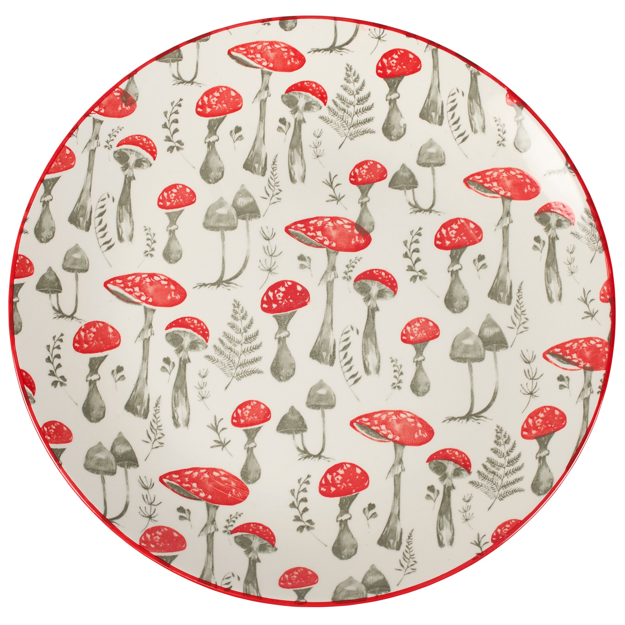 A durable stoneware dinner plate from ourĀ Cottagecore Collection displaying a wild mushroom pattern on the inside of the plate with red accent on the rim. Our Red Mushroom dinner plate is conveniently microwave, oven, dishwasher, and food safe for easy use. A piece of rustic dishware perfect for nature-themed tablescapes.
