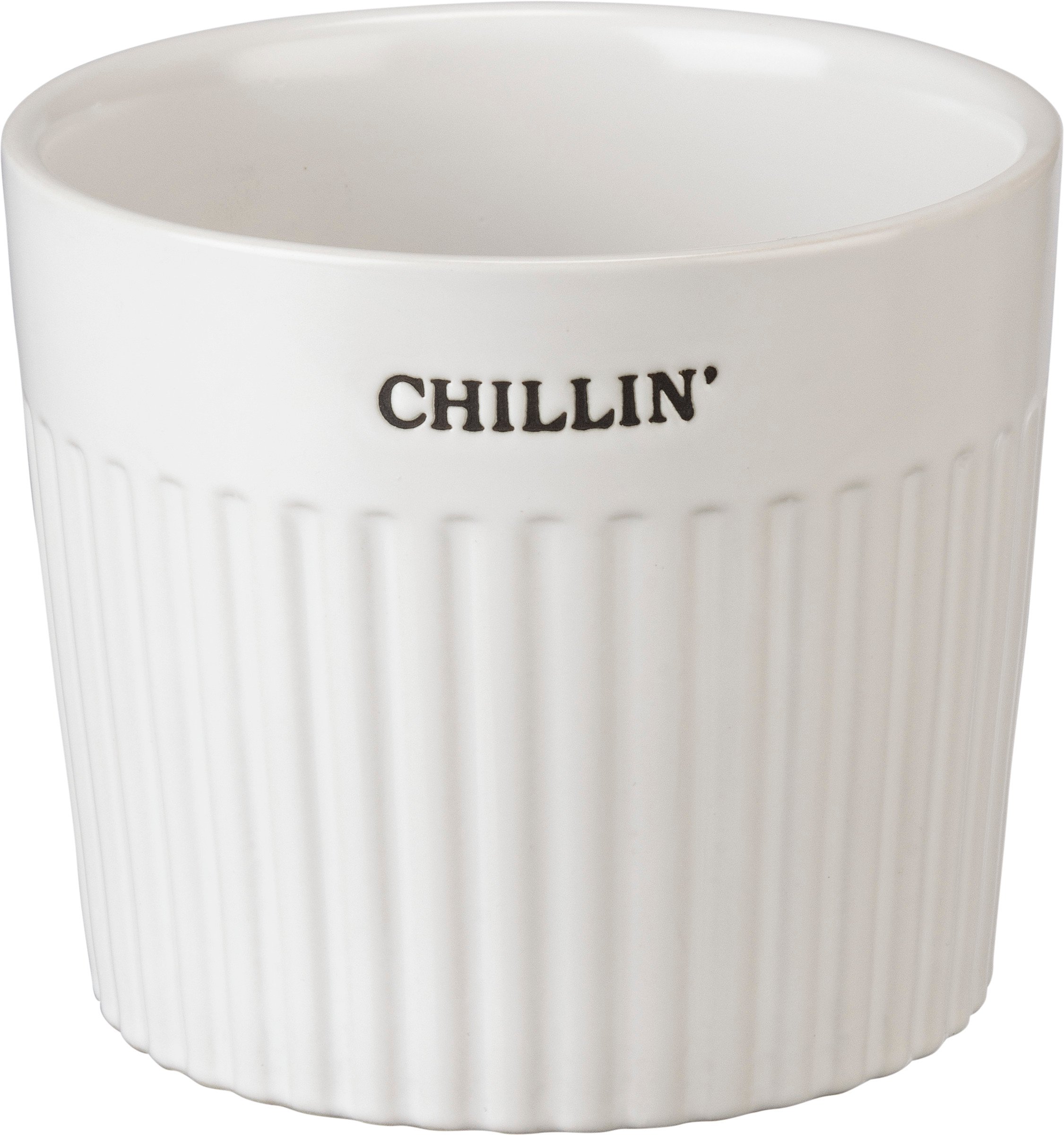 A two piece stoneware dip chiller lending a "Chillin'" sentiment. Ice goes into base and removable dip dish nests inside to keep dip cool. Set features white color and ribbed texture on base with slate gray text. Microwave, oven, dishwasher and food safe. This item makes a perfect addition to a farmhouse aesthetic and coordinates well with other pieces in collection!