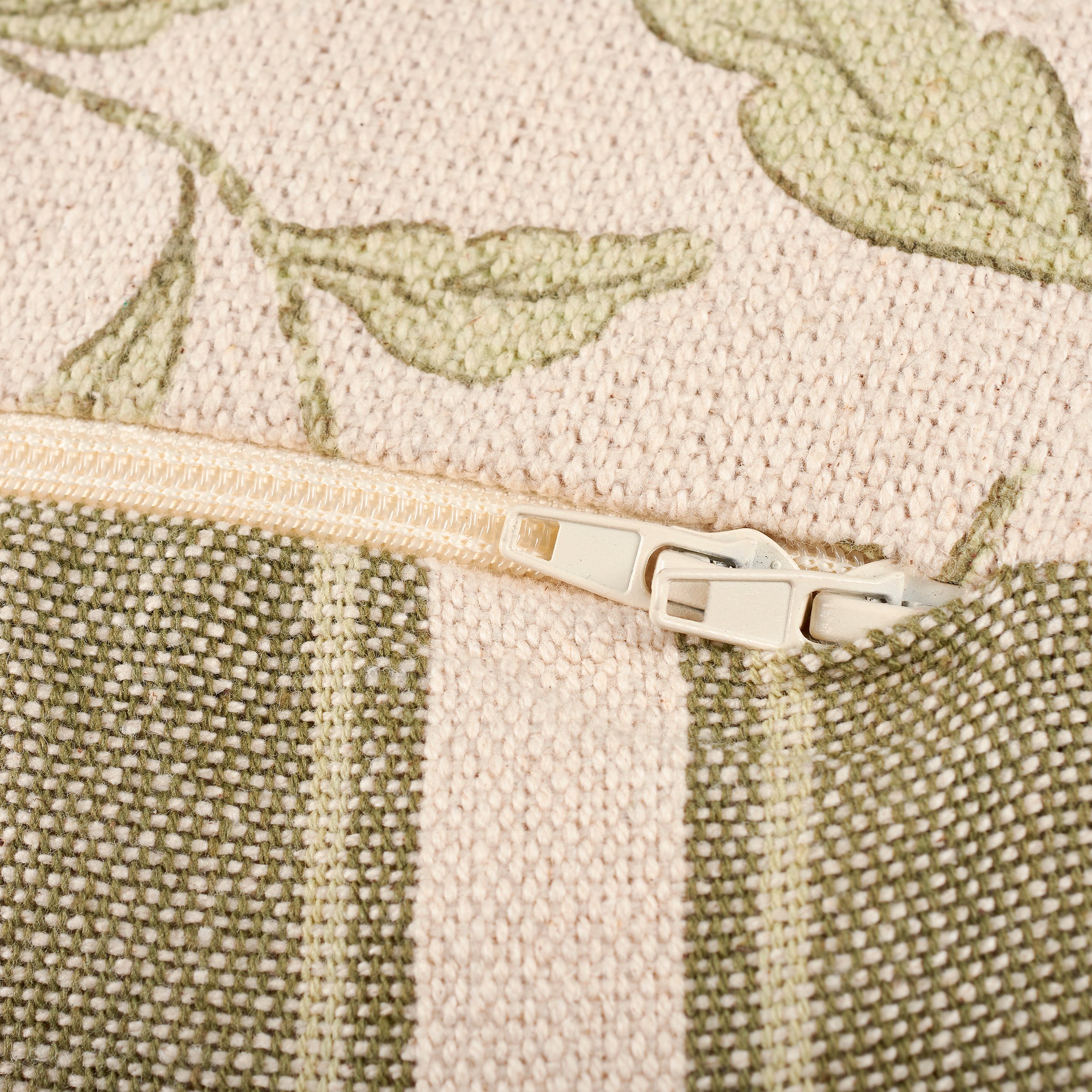 A large cotton dog bed from our Pet Collection displaying a double-sided design of a botanical inspired pattern in a vintage green color palette with a coordinating stripe pattern along the sides. Our X-large Green Botanical dog bed includes a zipper to easily remove and clean the machine-washable cover. Comfy dog bed contains polyester filling and is shipped vacuum-sealed for protection and easy storage. A stylish pet accessory that easily coordinates with home decor adds functional style to any room.