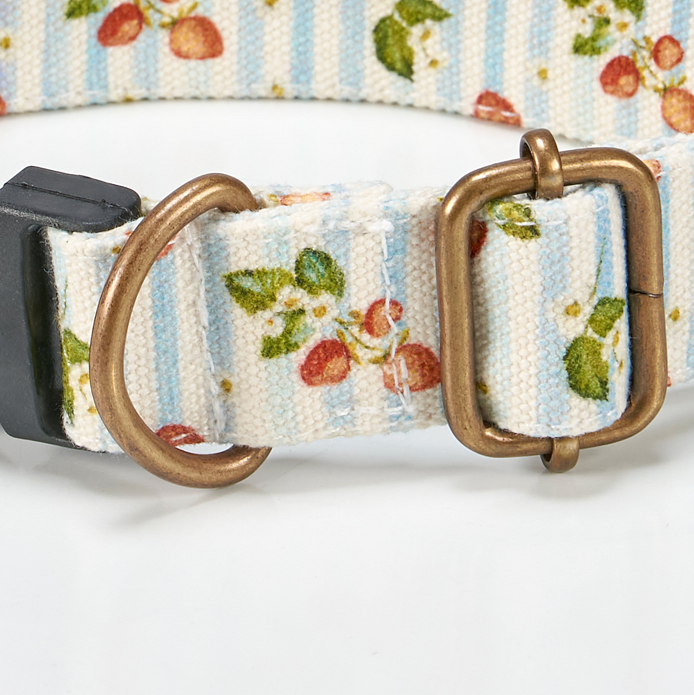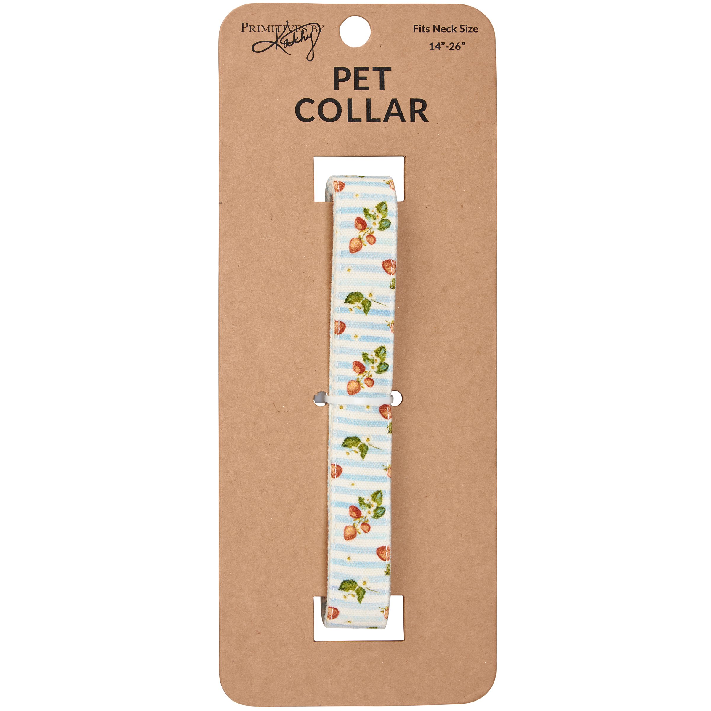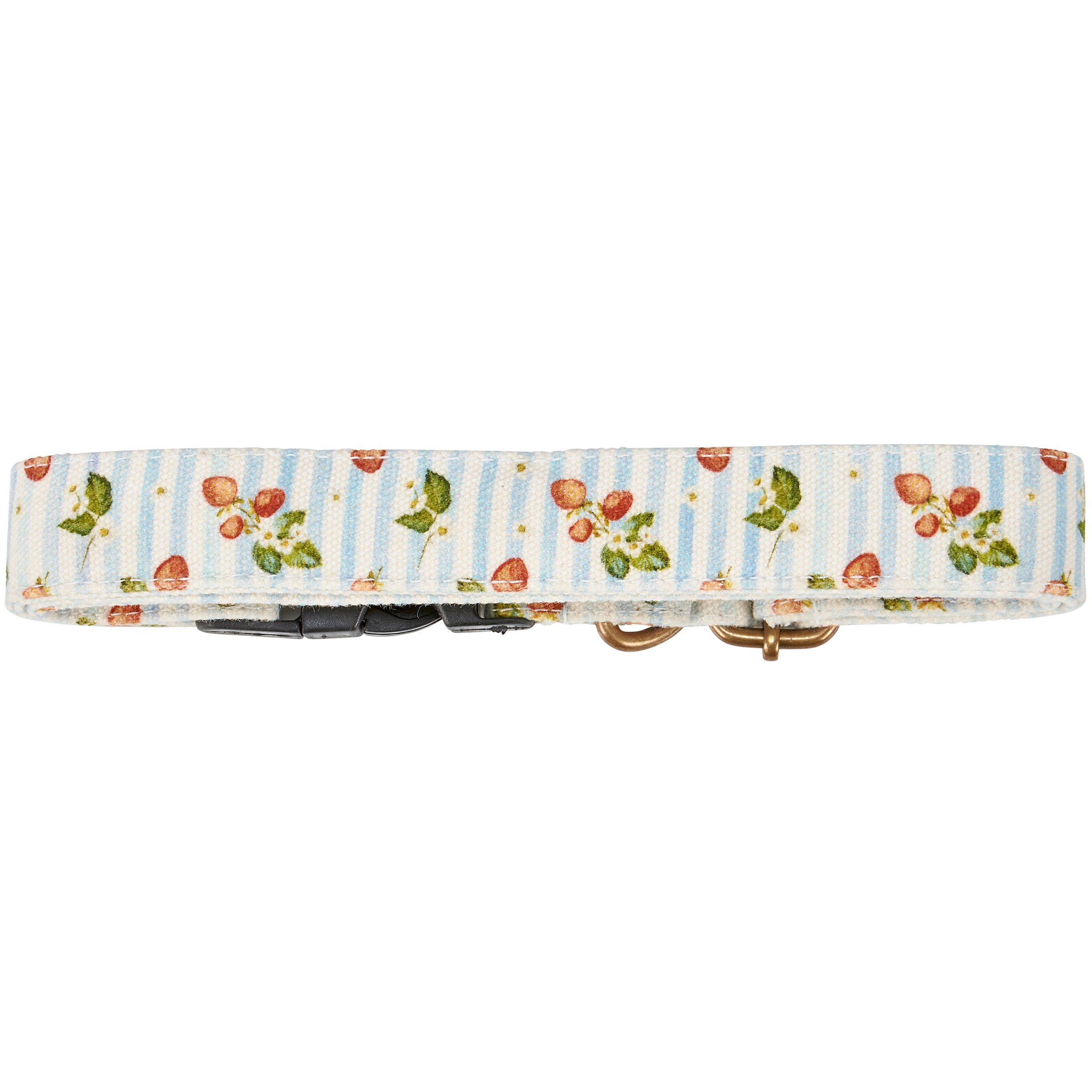 A canvas dog collar from our Pet Collection displaying hand painted designs of strawberries with complementing light stripe pattern. Collar features antique metal hardware for adjusting and attaching leash. Our Strawberries dog collar fits necks from 14 inches to 26 inches. Dog collar is packaged on a cardboard hanger with hole for easy display on rack. A fun strawberry-themed pet accessory perfect for everyday use.