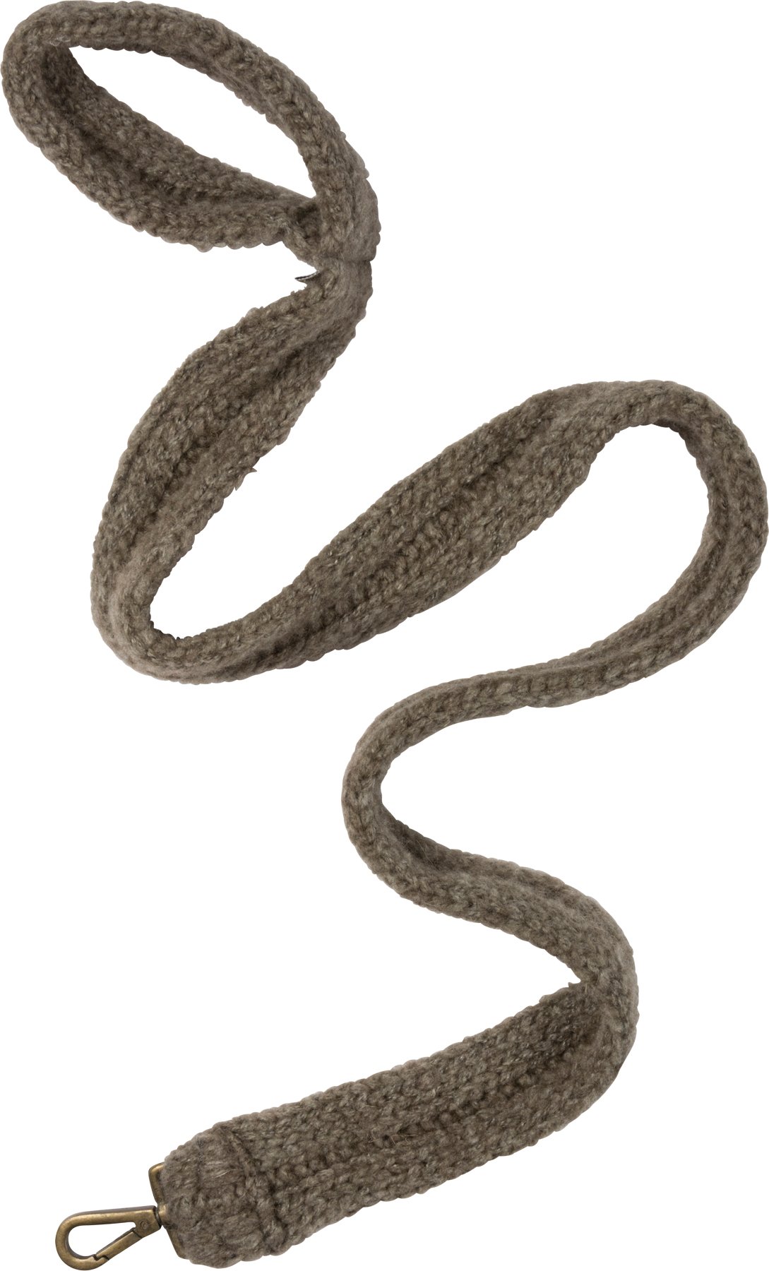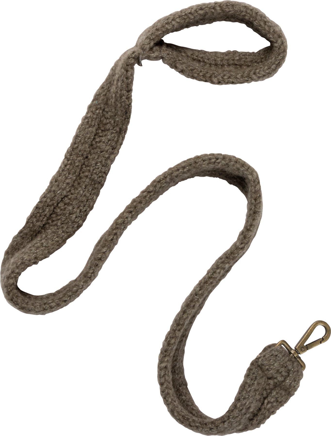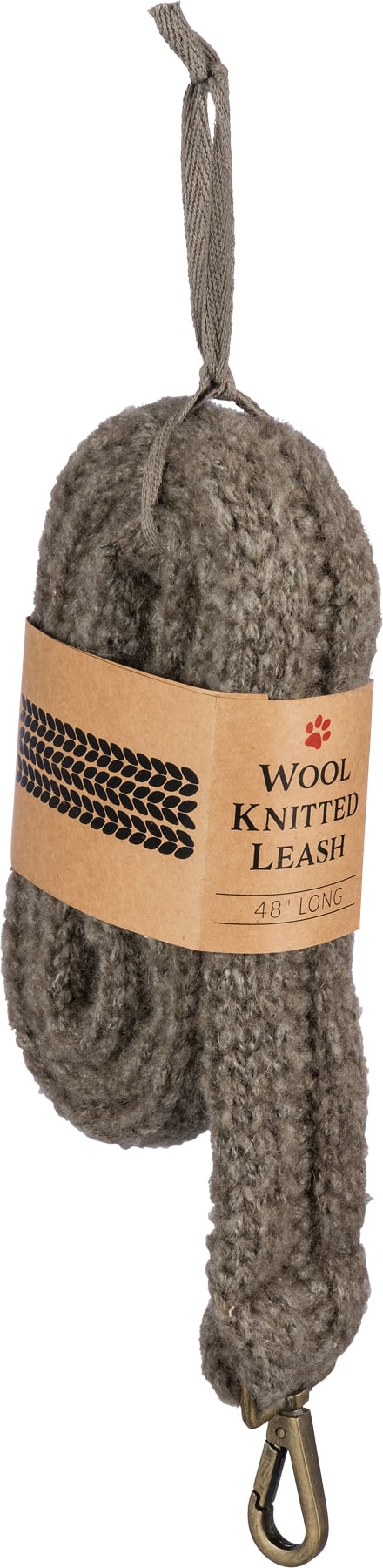 Cozy, durable, and soft, a wool cable knit leash with an antiqued metal clasp for affixing to any collar.