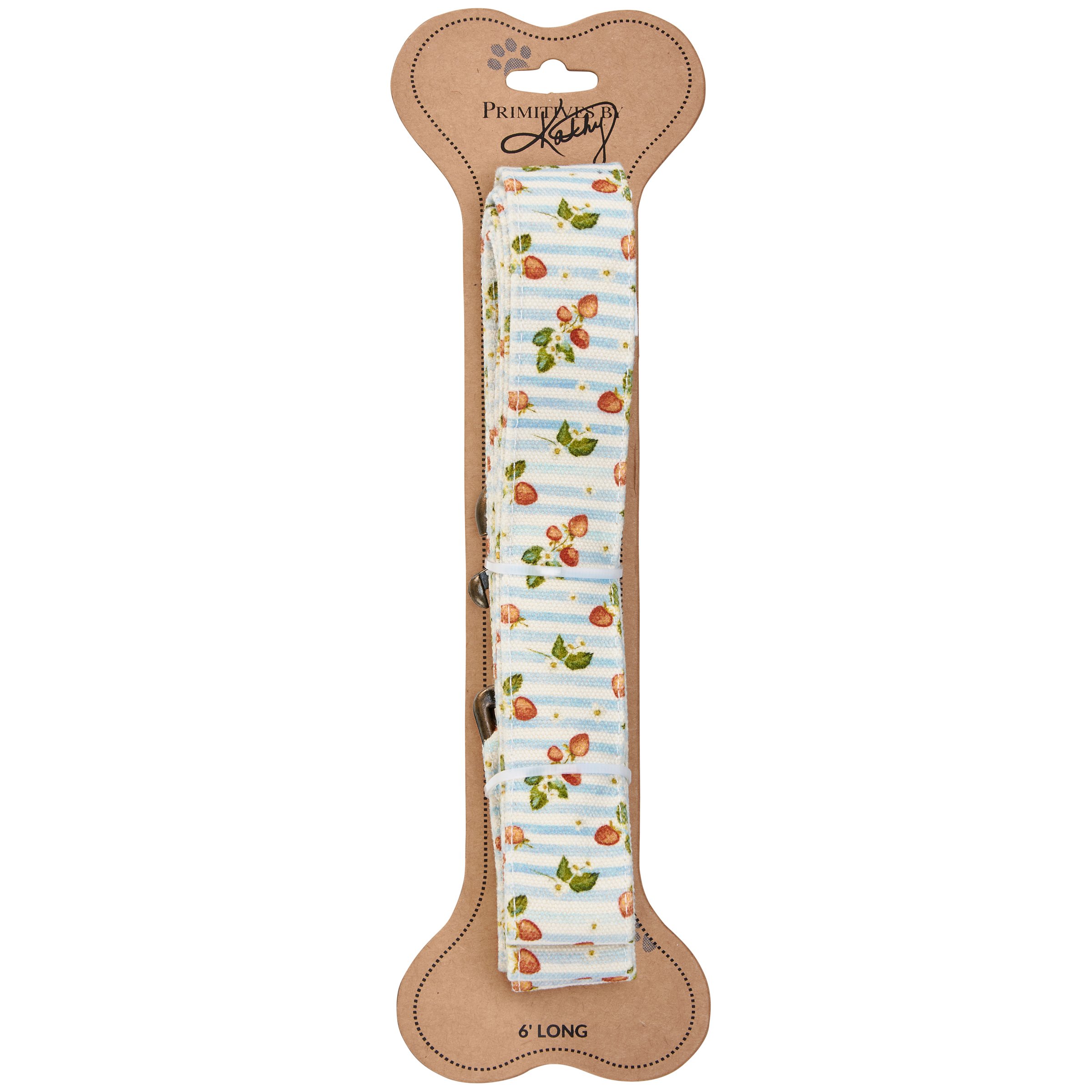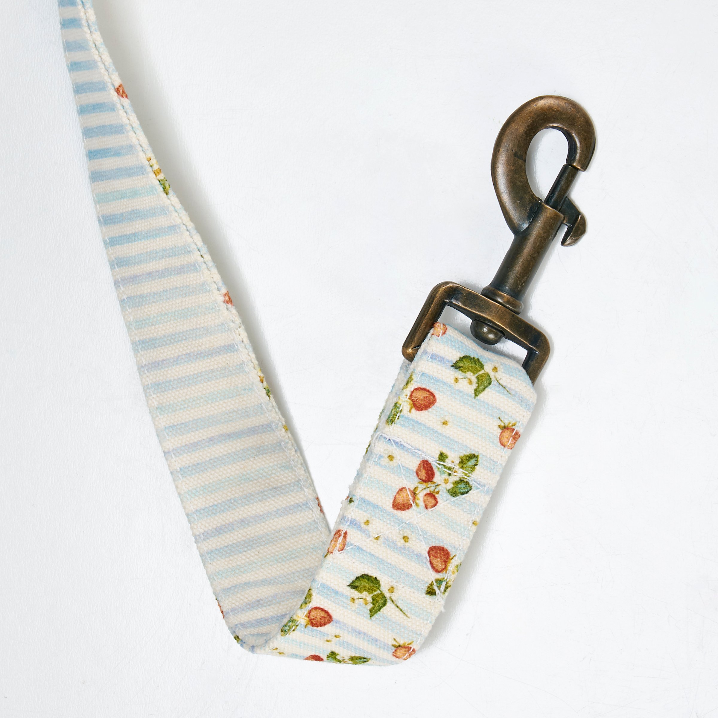 A canvas dog leash from our Pet Collection displaying hand painted designs of strawberries with complementing light stripe pattern. Leash features 72 inches of length and antique metal hardware for attaching leash to collar. Our Strawberries dog leash is packaged on a cardboard hanger with hole for easy display on rack. A fun strawberry-themed pet accessory perfect for everyday use.