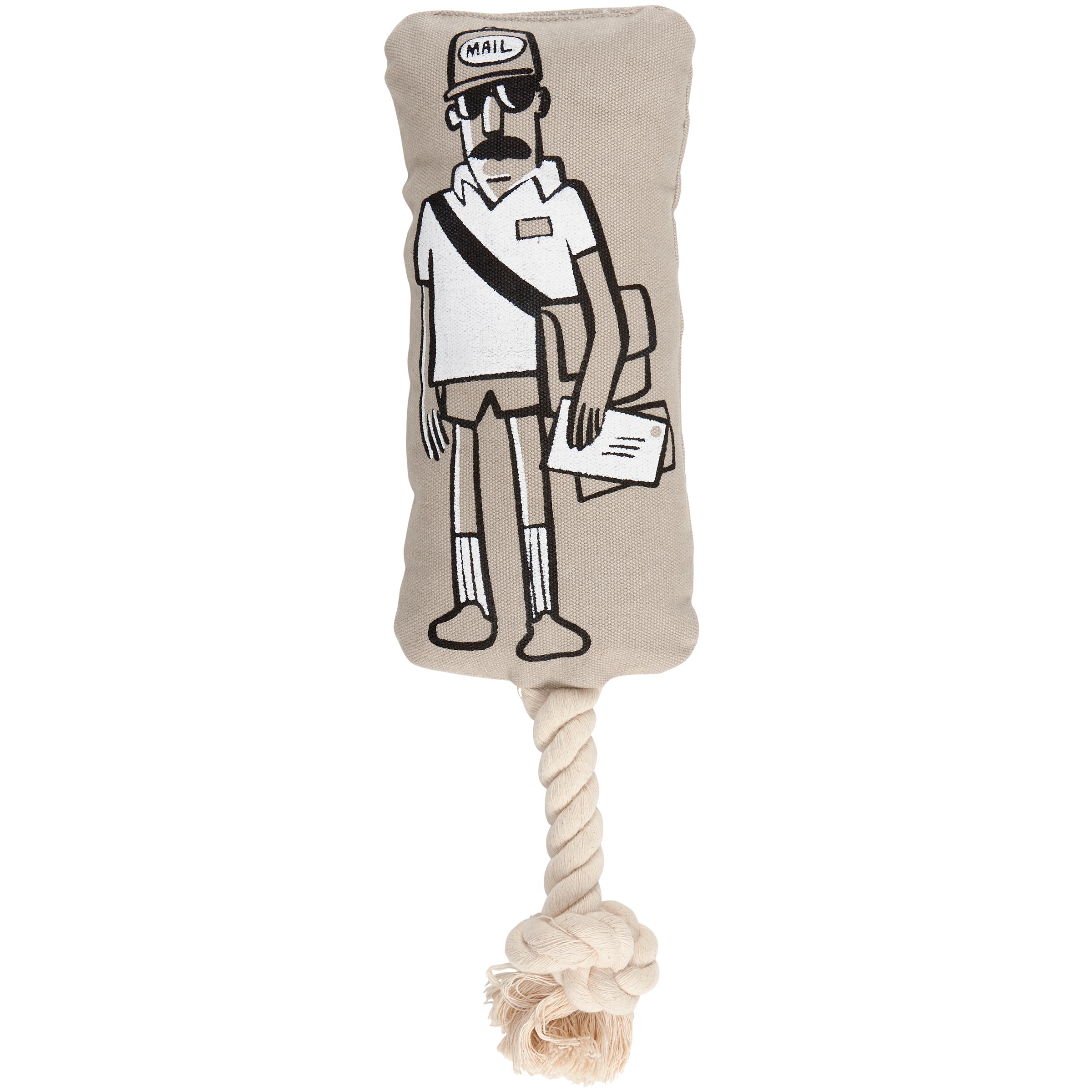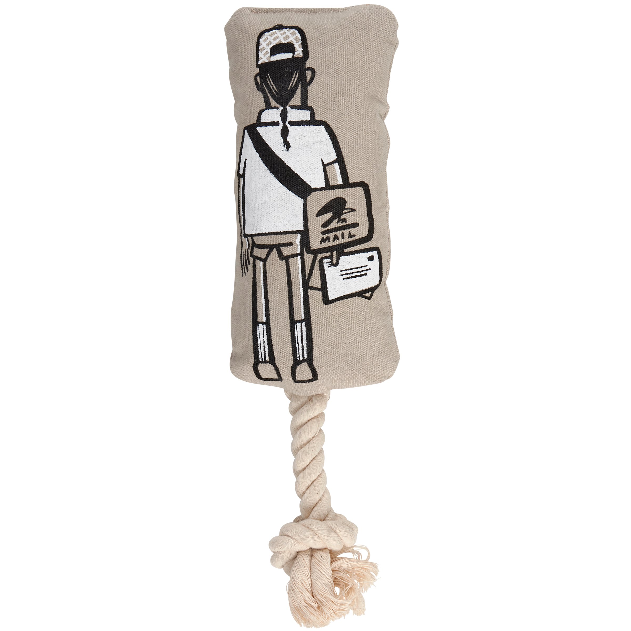 A dog toy from our Pet Collection in the shape of the fun mailman design displayed on the toy. Cotton dog toy features a double-sided design of a mailman delivering mail showing the front and back on each side with unique hand illustrated details. Our Mailman dog toy includes crinkle paper inside and a thick braided rope at the bottom to entice play. Dog toy is intended for fetching, chewing, and is not meant for rough play. A fun everyday pet accessory great for gifting.
