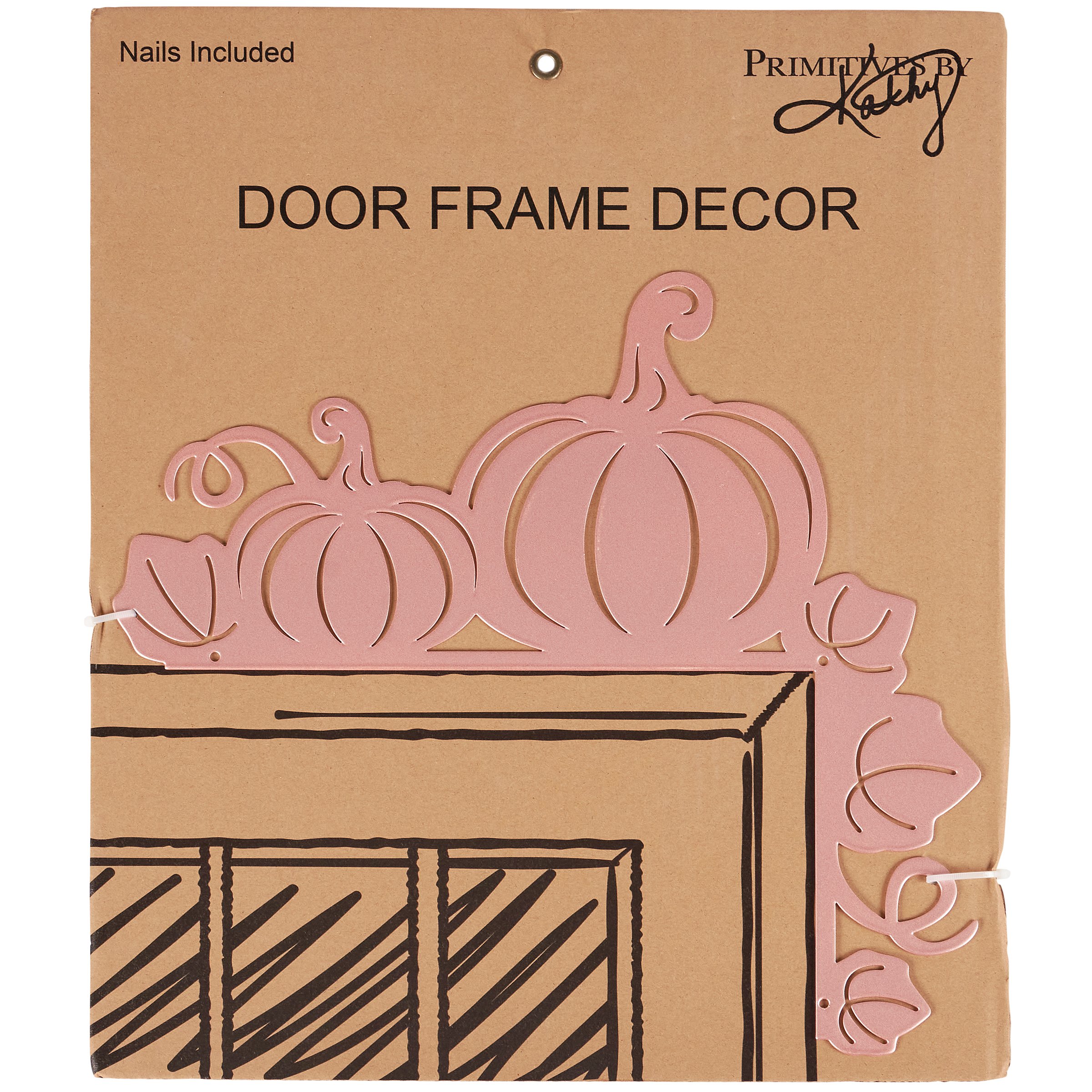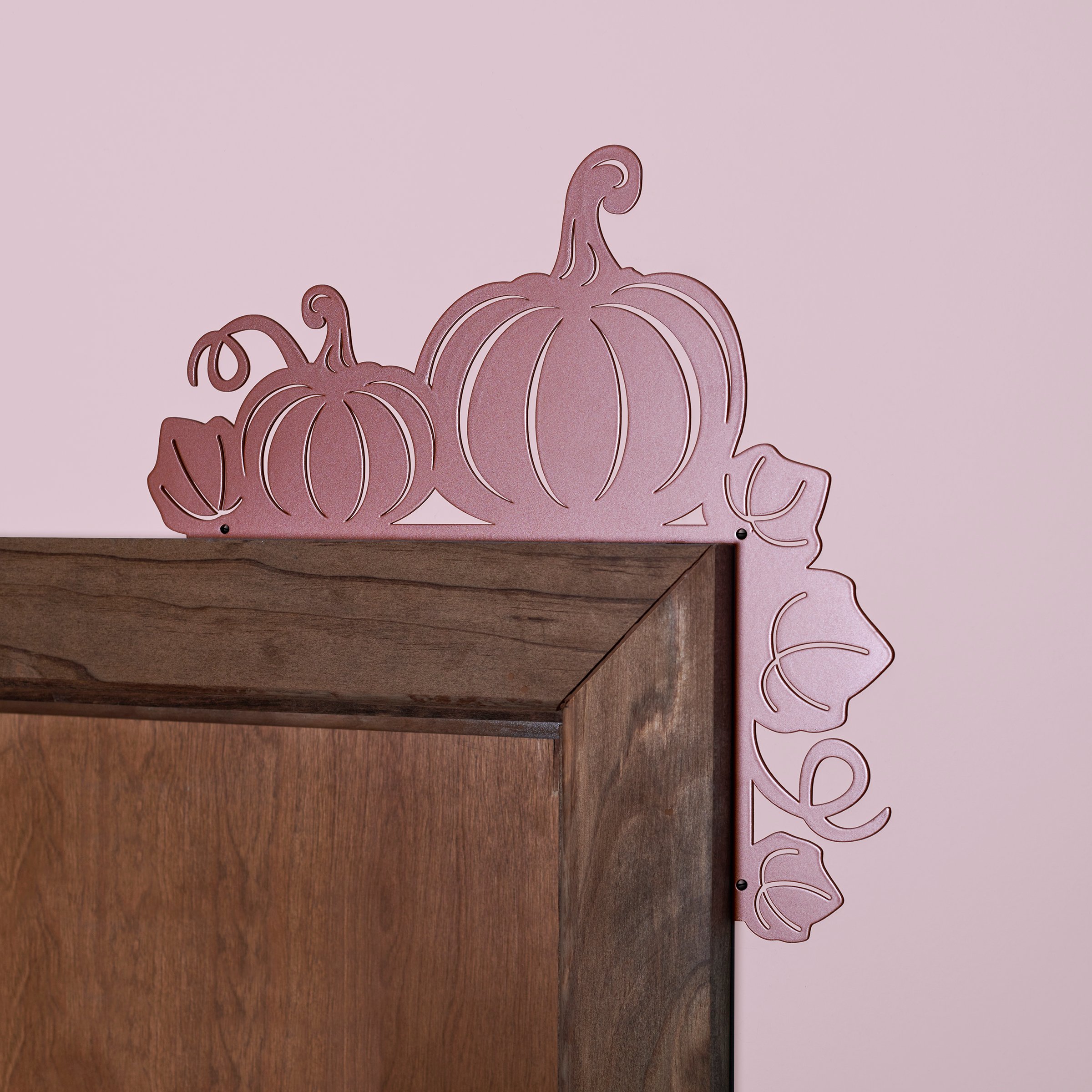 A metal décor piece from our Fall & Harvest Collection displaying a blush inspired fall design of pumpkins and vines with a stylish metallic blush color. Pumpkin décor is designed to sit on the corner of a door frame adding seasonal style to any entryway. Our Pumpkins door frame décor includes nails to secure in place using the 3 predrilled holes. Seasonal door frame décor comes packaged on carboard backing displaying illustration of a door to conveniently show use. A stylish piece of fall home décor perfect for seasonal display.
