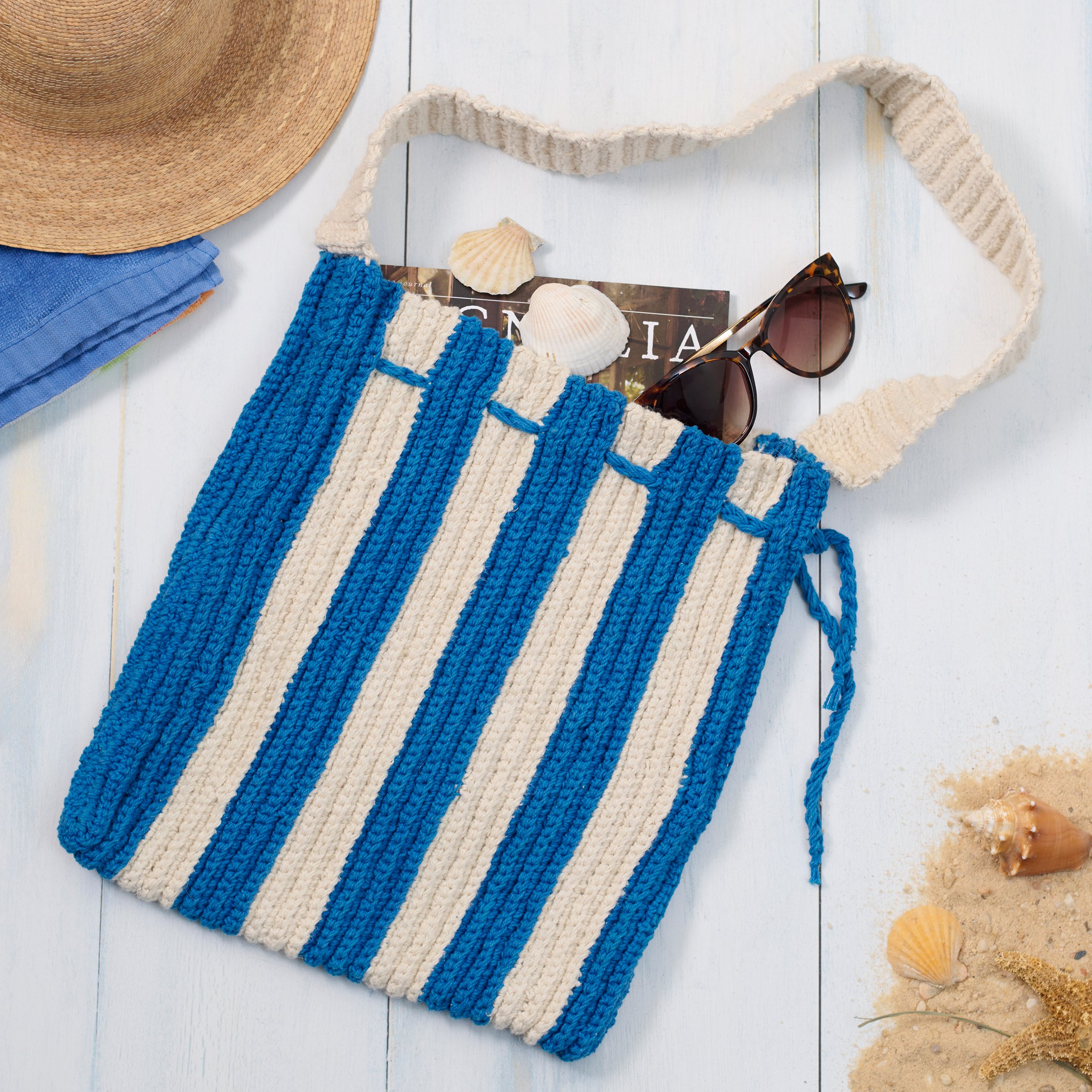 A cotton drawstring bag from our Beach Collection displaying a blue and white stripe pattern inspired by Italian coastal style. Coastal drawstring bag features a unique knit design for the shoulder strap and bag for a handmade aesthetic. Our Blue Stripe drawstring bag includes a 12 inch handle and 14 inch pouch perfect for storing everyday items when on the go. Spot clean only. A stylish everyday accessory great for gifting.