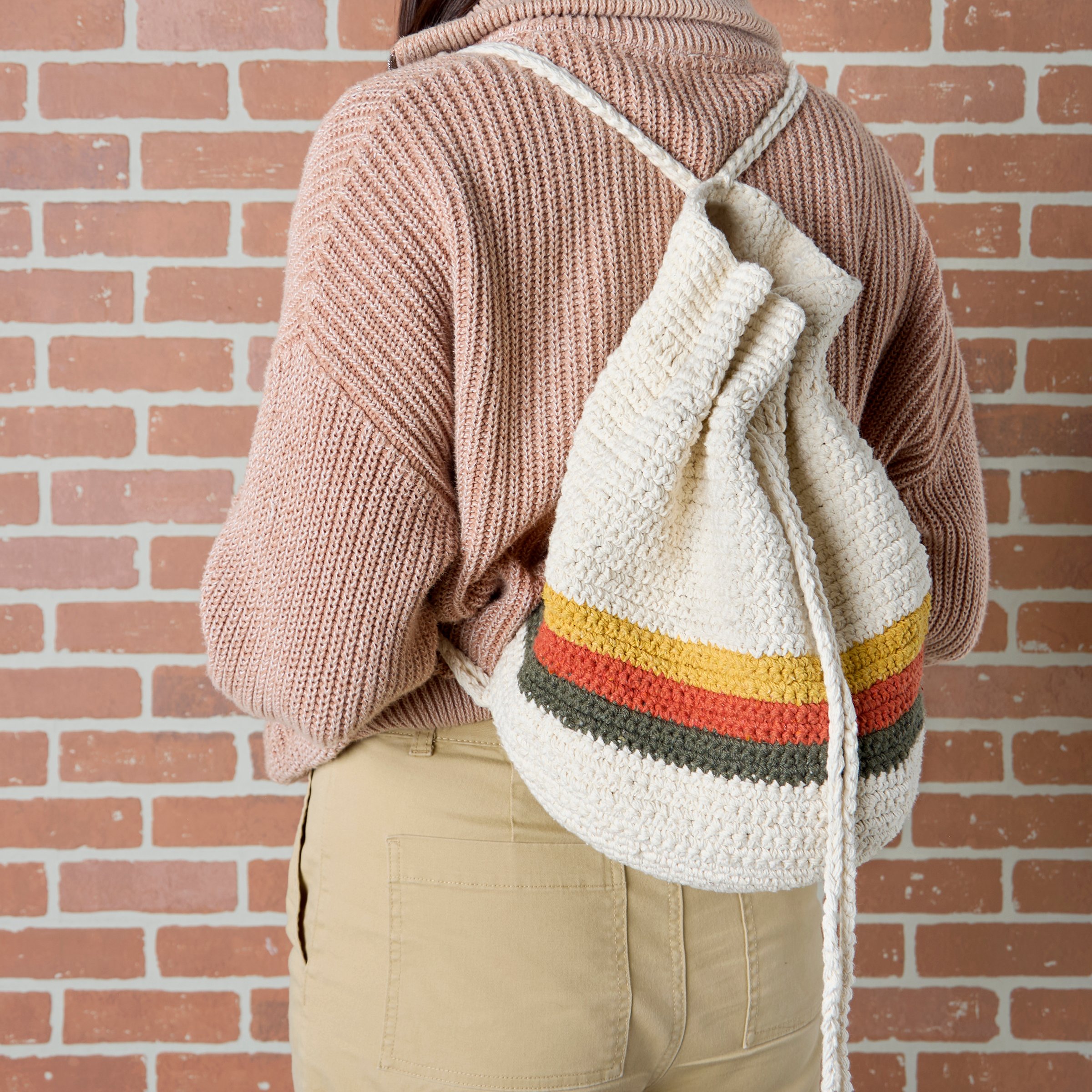 A cotton drawstring bag from our Cottagecore Collection displaying a boho inspired stripe pattern. Boho drawstring bag features a unique crochet style for the shoulder straps and bag design. Our Boho Stripe drawstring bag includes a fully lined pouch perfect for storing everyday items when on the go. Spot clean only. A stylish everyday accessory great for gifting.