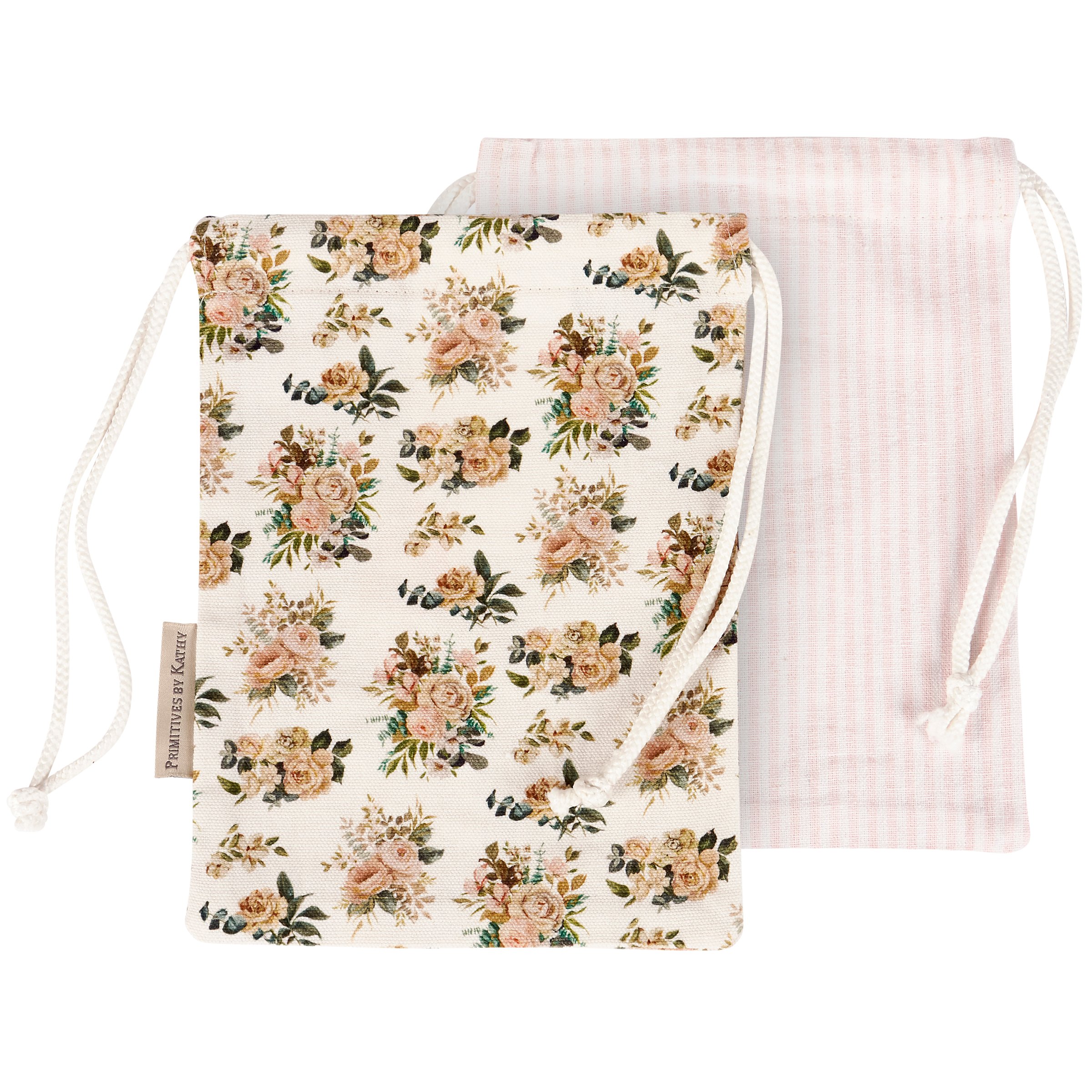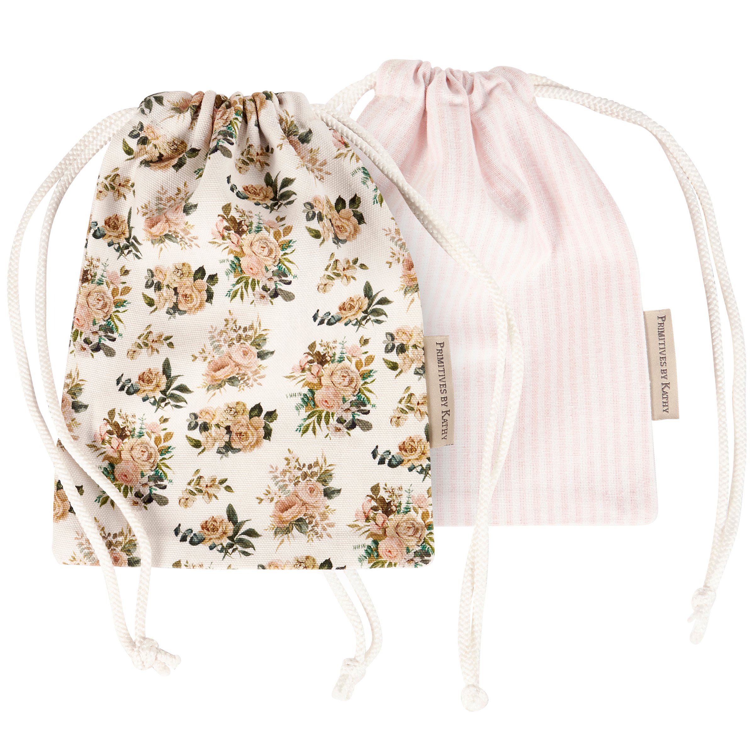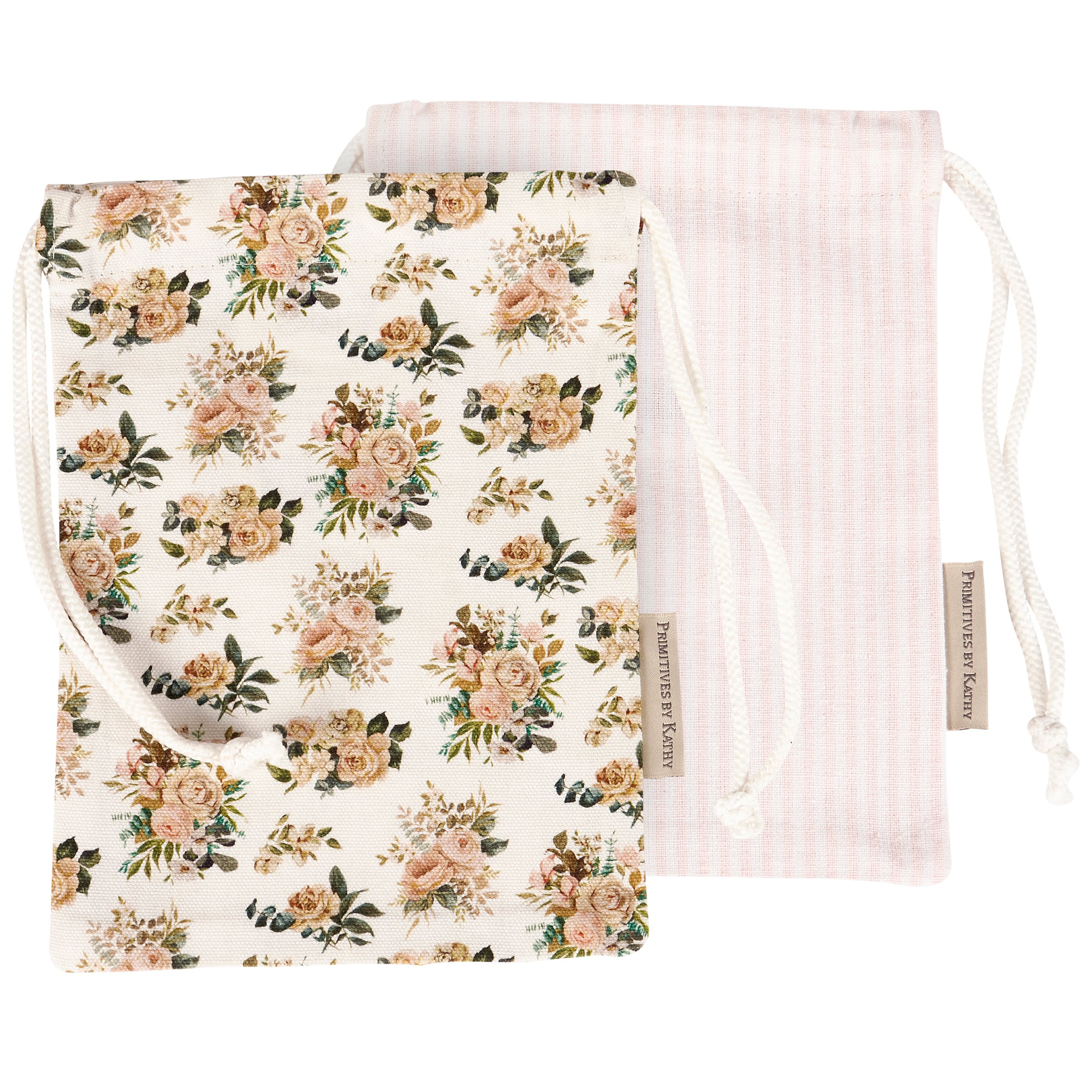 A set of 2 cotton-linen drawstring pouches from our Watercolor Collection displaying all-over designs including a stylish pattern of cabbage roses on one pouch and light pink stripe pattern on the other pouch. Pouch set features drawstring closures for easy gift wrapping with a premium touch. Our Cabbage Rose drawstring pouches are conveniently machine washable for easy cleaning and re-use. A stylish set of accessories perfect for elevating gift giving.