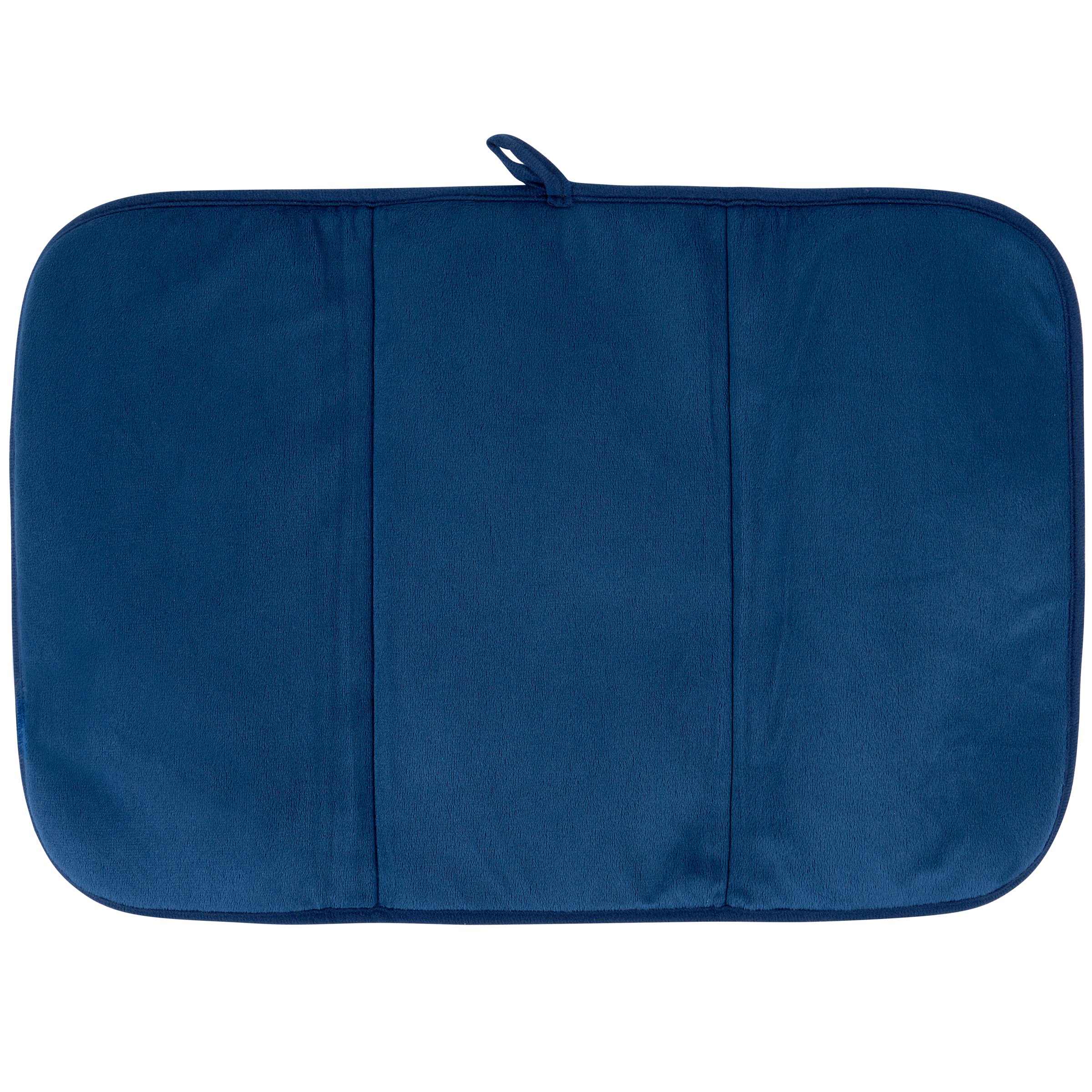An ultra-absorbent drying mat from ourĀ Indigo Collection displaying an ornate pattern of blue florals. Ornate florals design is replicated from original artwork hand painted in a unique watercolor style. Floral drying mat features a full color design on the 21 inch by 14 inch space to place items to dry with coordinating blue color on the back and trim. Our Blue Florals drying mat includes a hanger at the top to display design or to air dry when not in use. Drying mat is conveniently machine-washable for easy cleaning and folds up for easy storage. A stylish kitchen accessory perfect for everyday use.