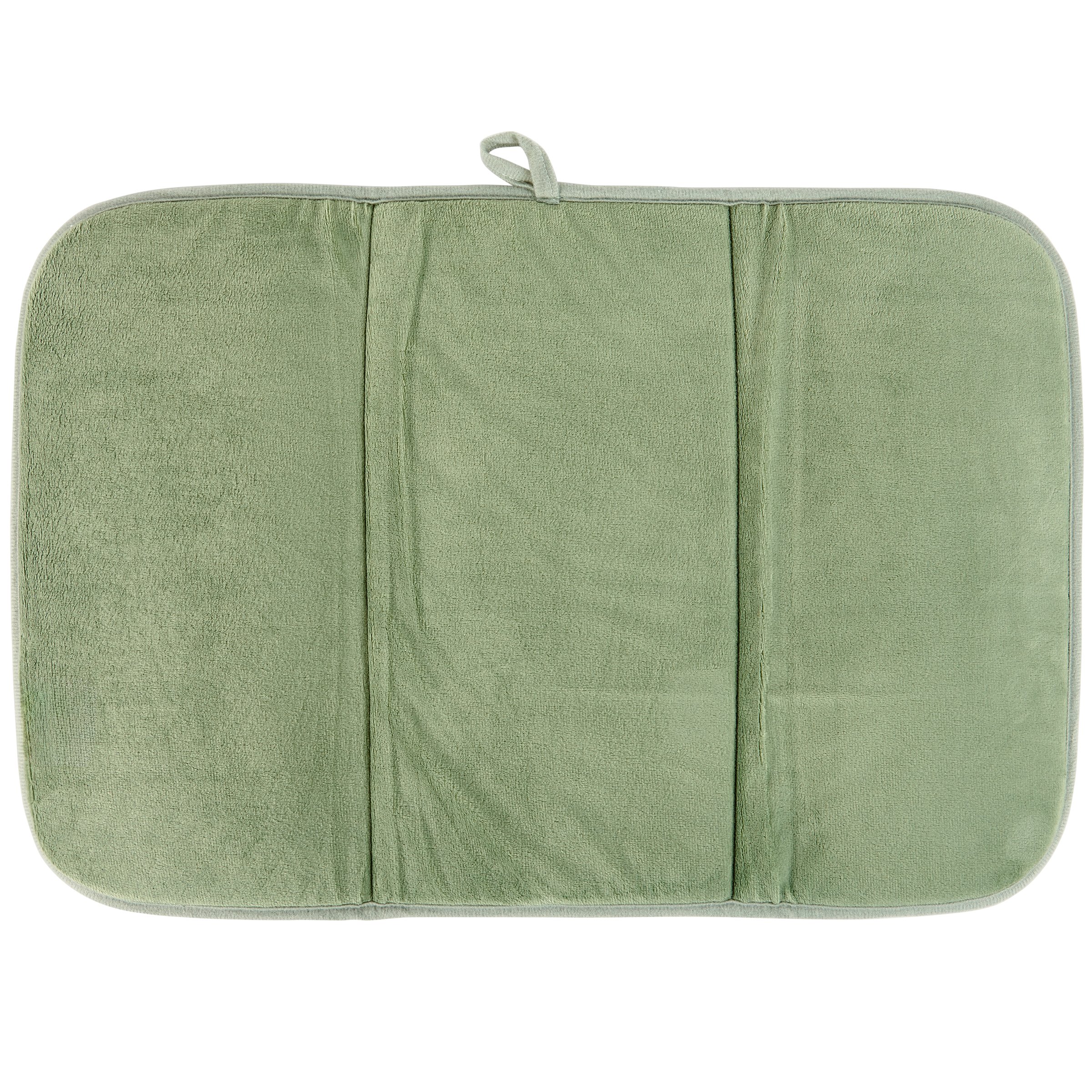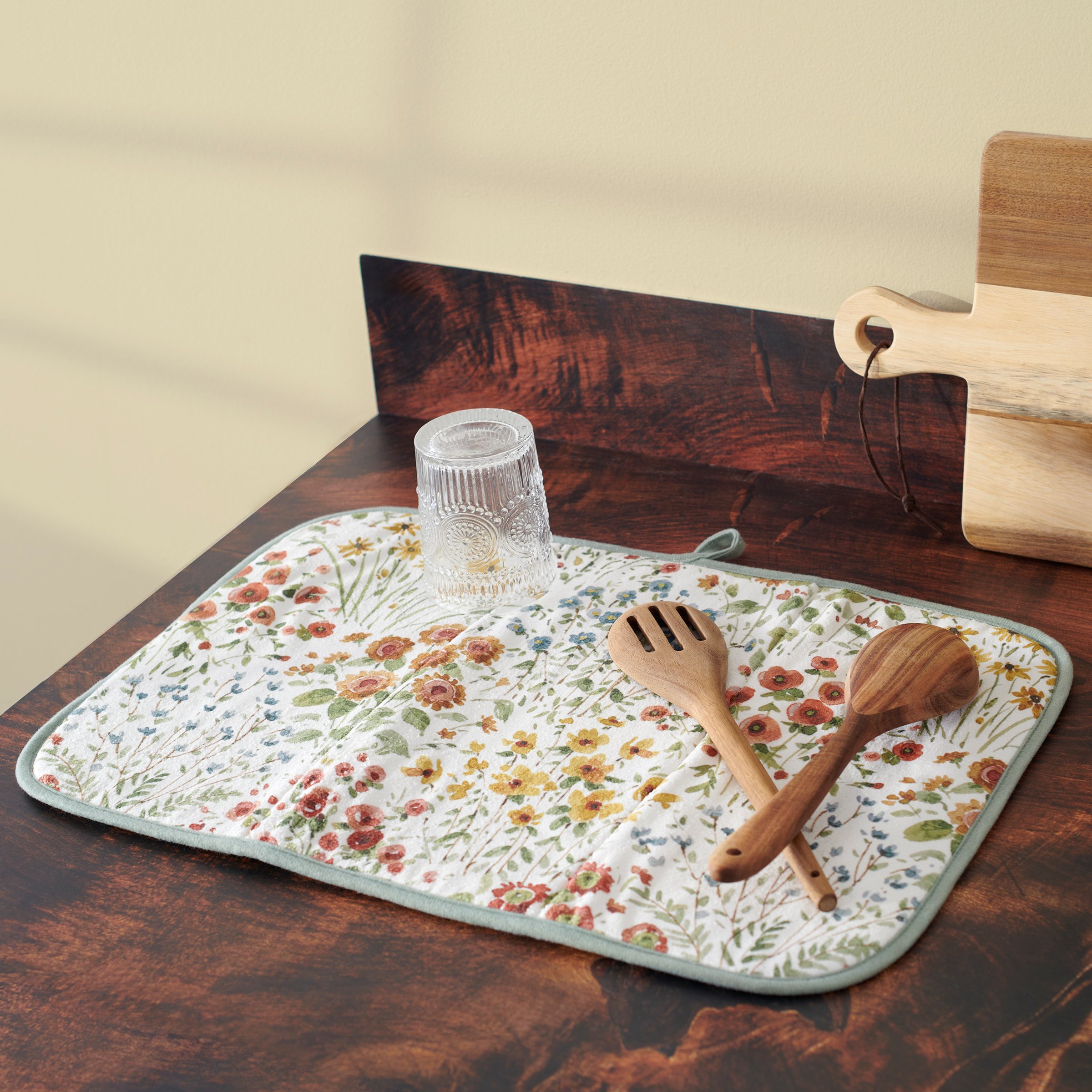 An ultra-absorbent drying mat from our Fall & Harvest Collection displaying a colorful pattern of fall wildflowers replicated from original artwork hand painted in a delicate watercolor style. Fall flowers drying mat features a full color design on the 21 inch by 14 inch space to place items to dry with coordinating green color on the back and trim. Our Fall Wildflowers drying mat includes a hanger at the top to display design or to air dry when not in use. Seasonal drying mat is conveniently machine-washable for easy cleaning and folds up for easy storage. A stylish fall kitchen accessory perfect for seasonal use.