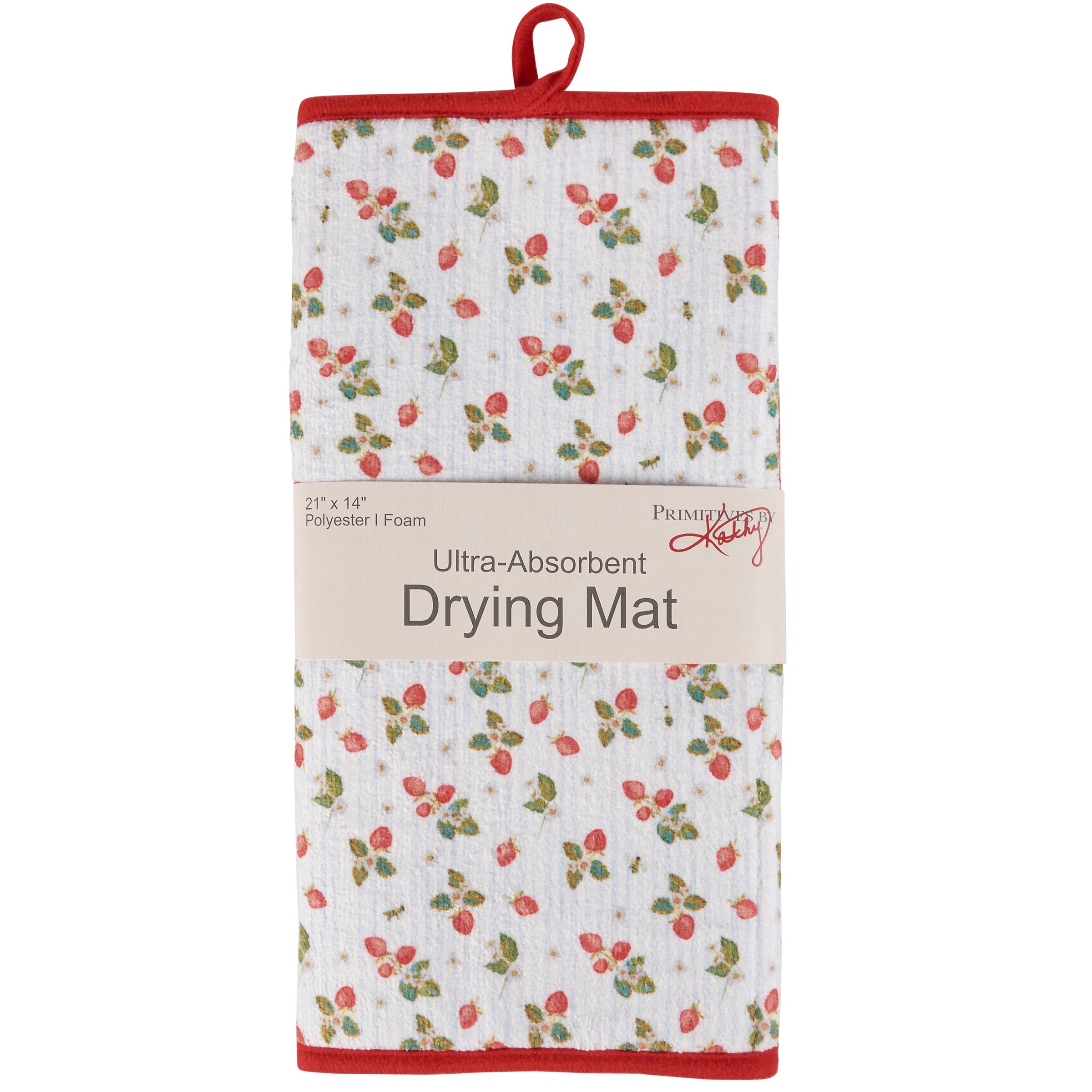An ultra-absorbent drying mat from our Garden Collection displaying a vibrant pattern of wild strawberries with light blue stripe background. Design is replicated from original artwork hand painted in a unique watercolor style. Drying mat features full color design on the 21 inch by 14 inch space to place items to dry with coordinating red color on the back and trim. Our Strawberry drying mat includes a hanger at the top to display design or to air dry when not in use. Drying mat conveniently folds up for easy storage. Machine-washable for easy cleaning. A charming strawberry-themed kitchen accessory perfect for everyday use.