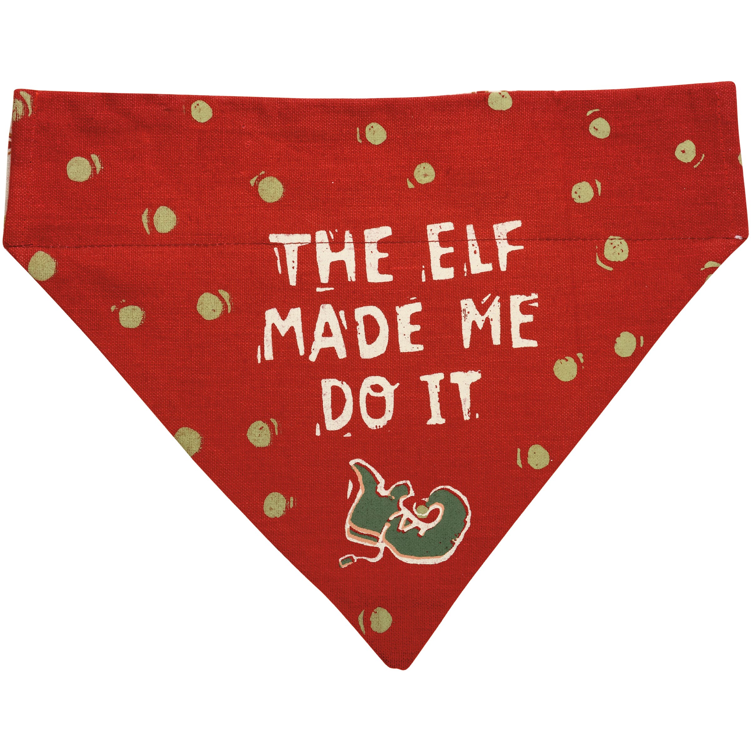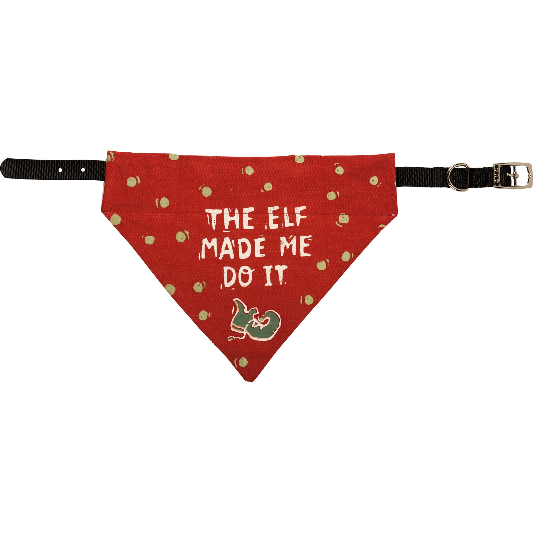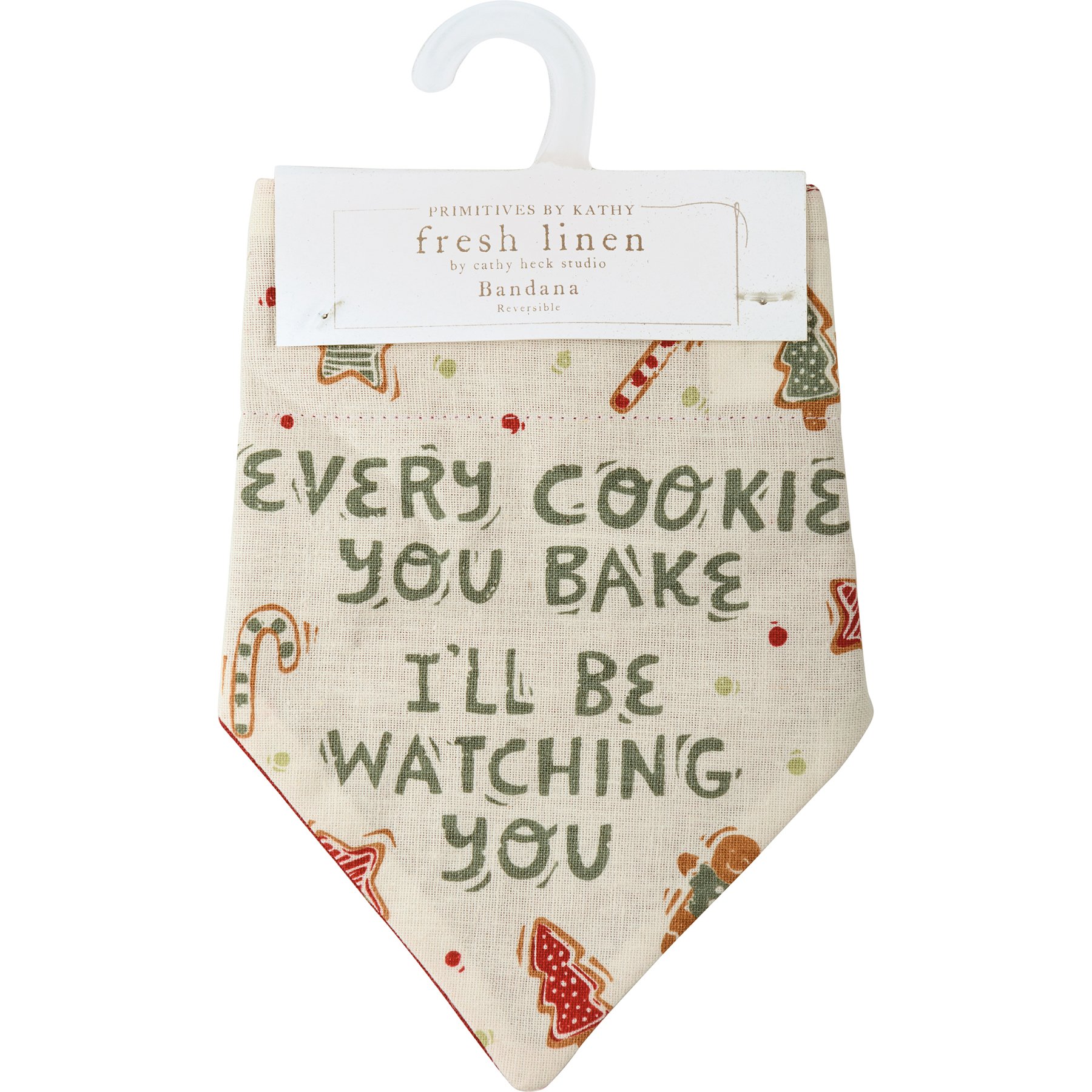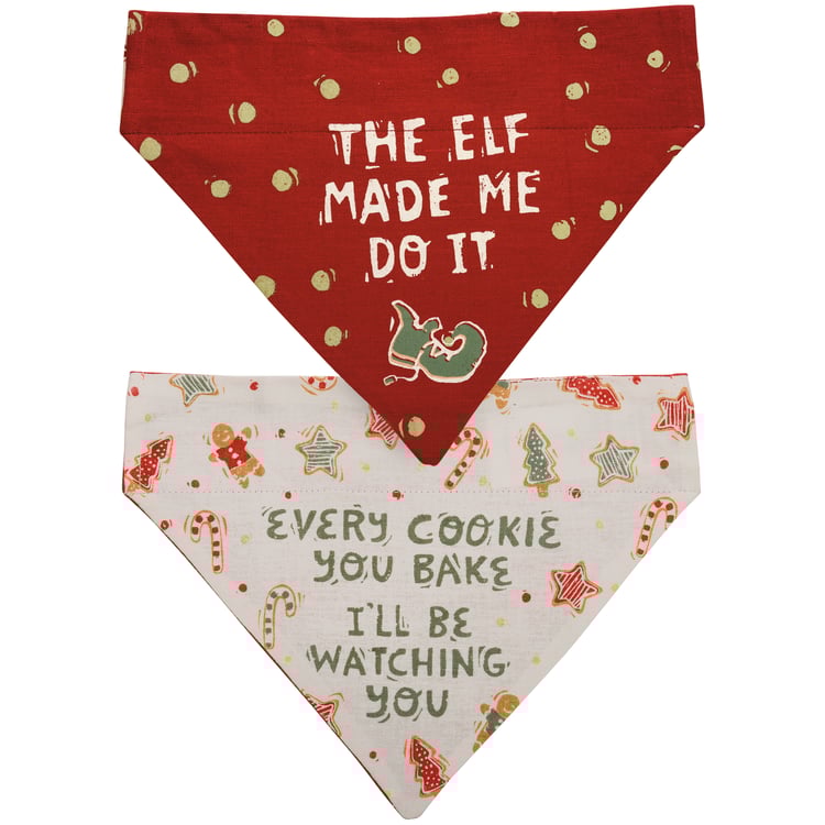 A large reversible cotton linen blend collar bandana. Features "Every Cookie You Bake I'll Be Watching You" sentiment and Christmas cookie designs on one side, and "The Elf Made Me Do It" sentiment with elf shoe and polka dot designs on the other. Bandana slides around standard collars to easily change designs. Machine-washable.