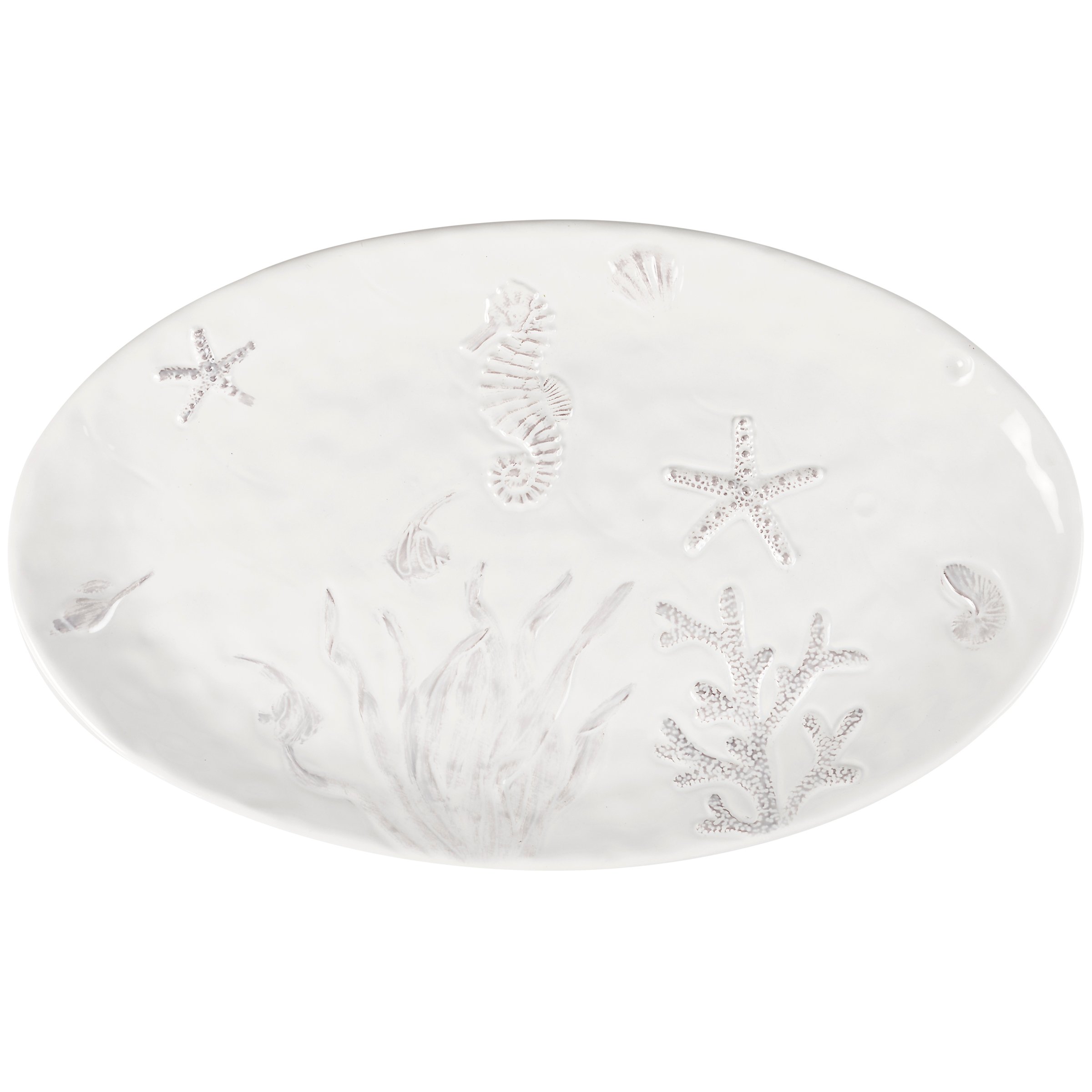 A lightweight, but durable ceramic platter from ourĀ Beach Collection displaying a clean white glaze finish with embossed designs of various sea life and ocean plants on the serving area. Embossed ocean designs feature textured detail. Our Beach platter is microwave, dishwasher, and food safe for convenient use. A piece of everyday tableware perfect for oceanic themed gatherings.