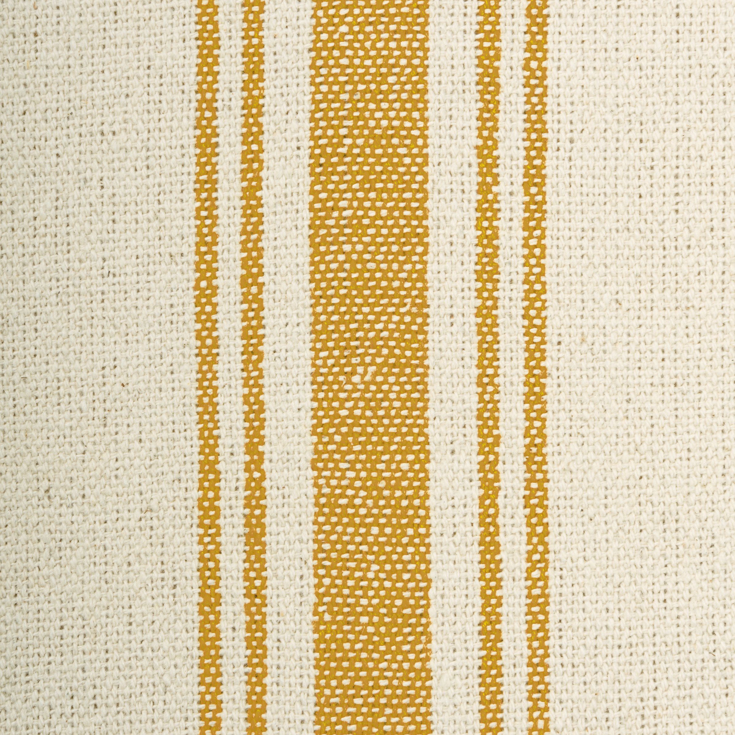A yard of cotton fabric from our Primitive Collection with a vintage inspired design displaying a cream color with a repeating pattern of gold stripes woven throughout. The gold stripe pattern repeats at 7.5 inches on center across a 54 inch width. Our Gold Stripe fabric bolt comes wrapped and finished with ties made from matching fabric strips.