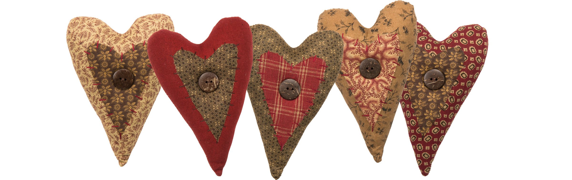 A set of 5 rustic stuffed hearts in an earthy palette of muted red, green and cream. Each heart features two complementing patterned fabrics--one for the base, and another for the front stitched heart panel--and includes a center button accent to add interest. Set complements well with other pieces in collection and existing decor.