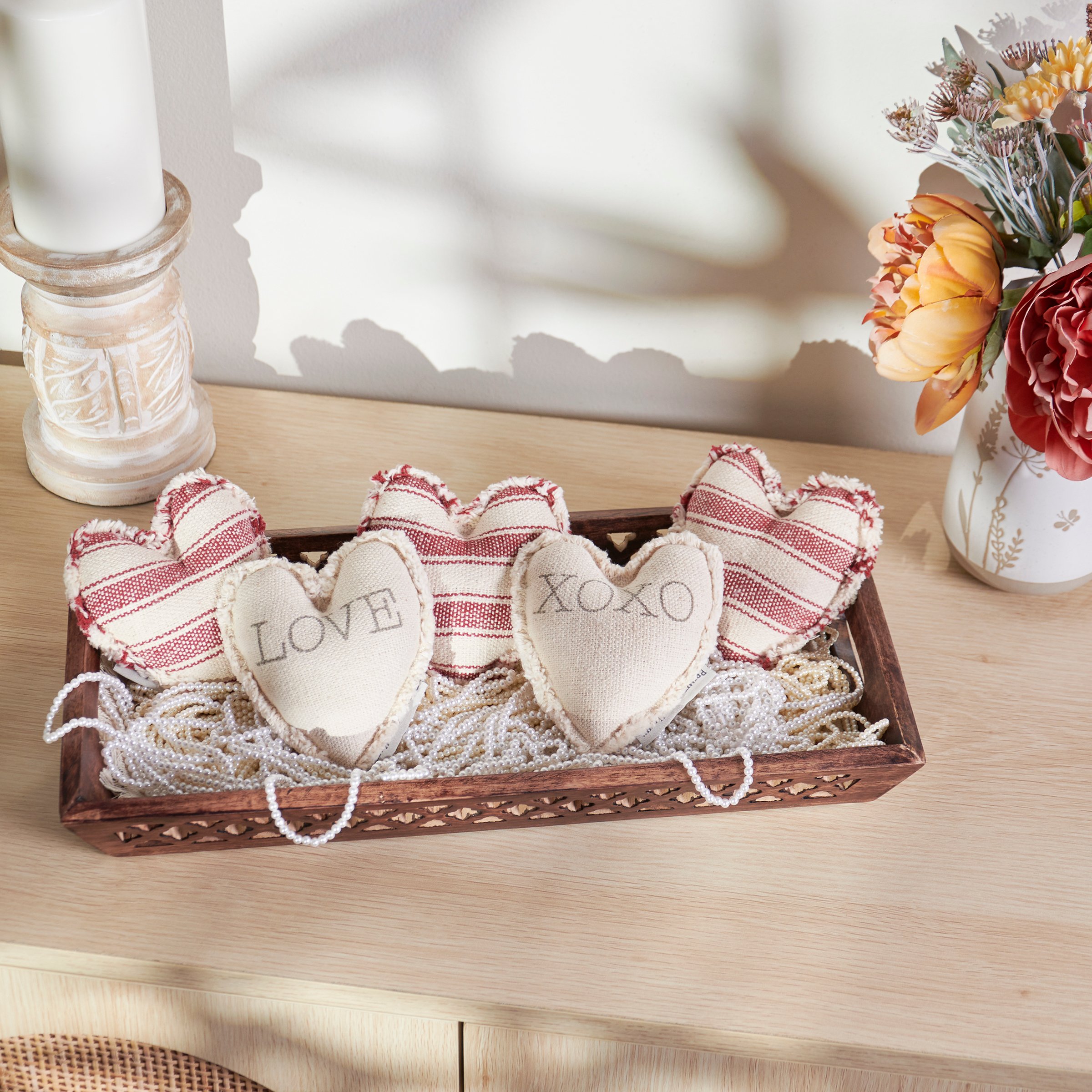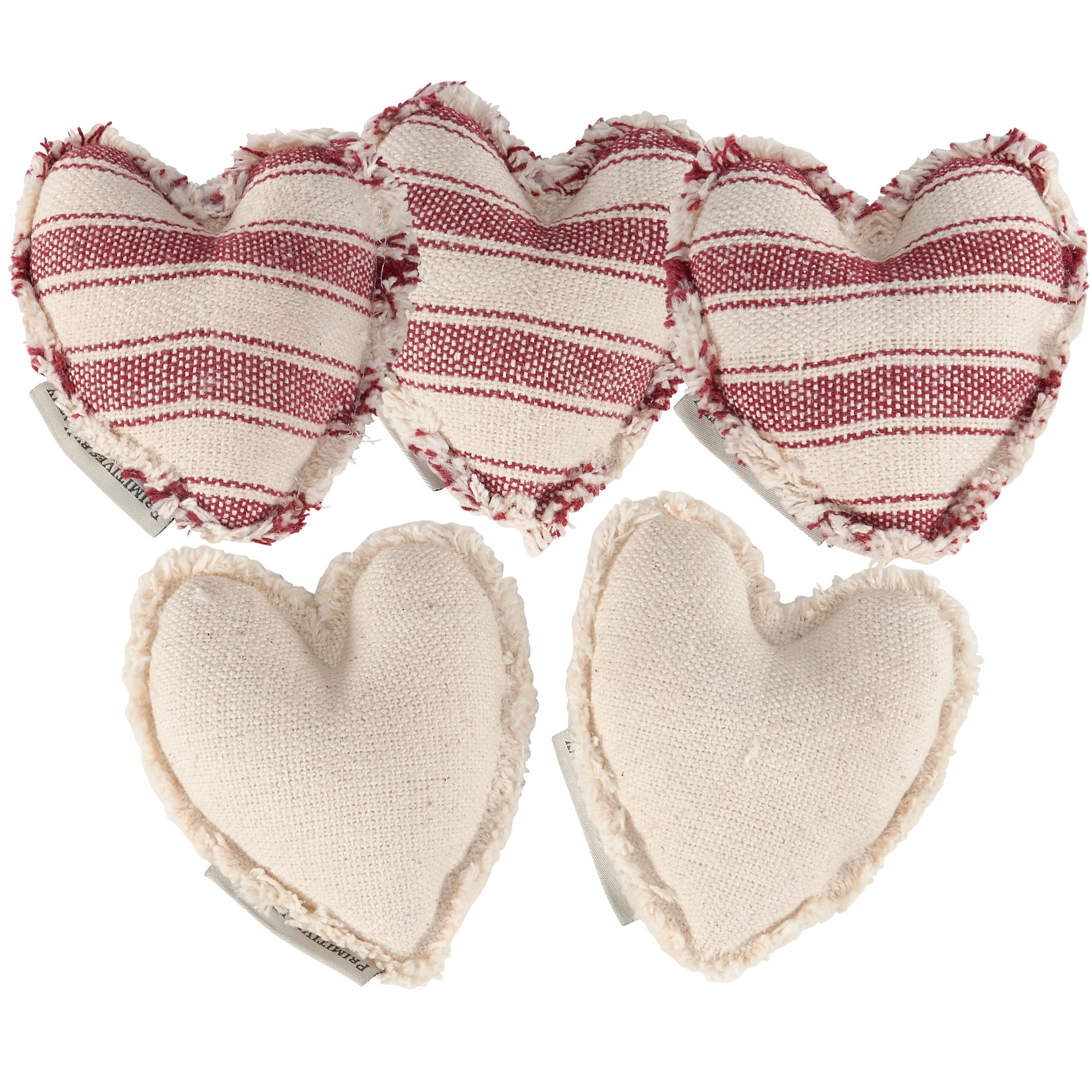 A set of five cotton fabric hearts from our Valentine's Day Collection displaying a rustic inspired handmade style and love-themed sentiments. Decorative heart set includes three hearts with deep red stripe designs and two with sentiments that read "Love" and "XOXO." Our Love fabric heart set is perfect for rustic Valentine's Day decorating and are easy to add to any seasonal display.