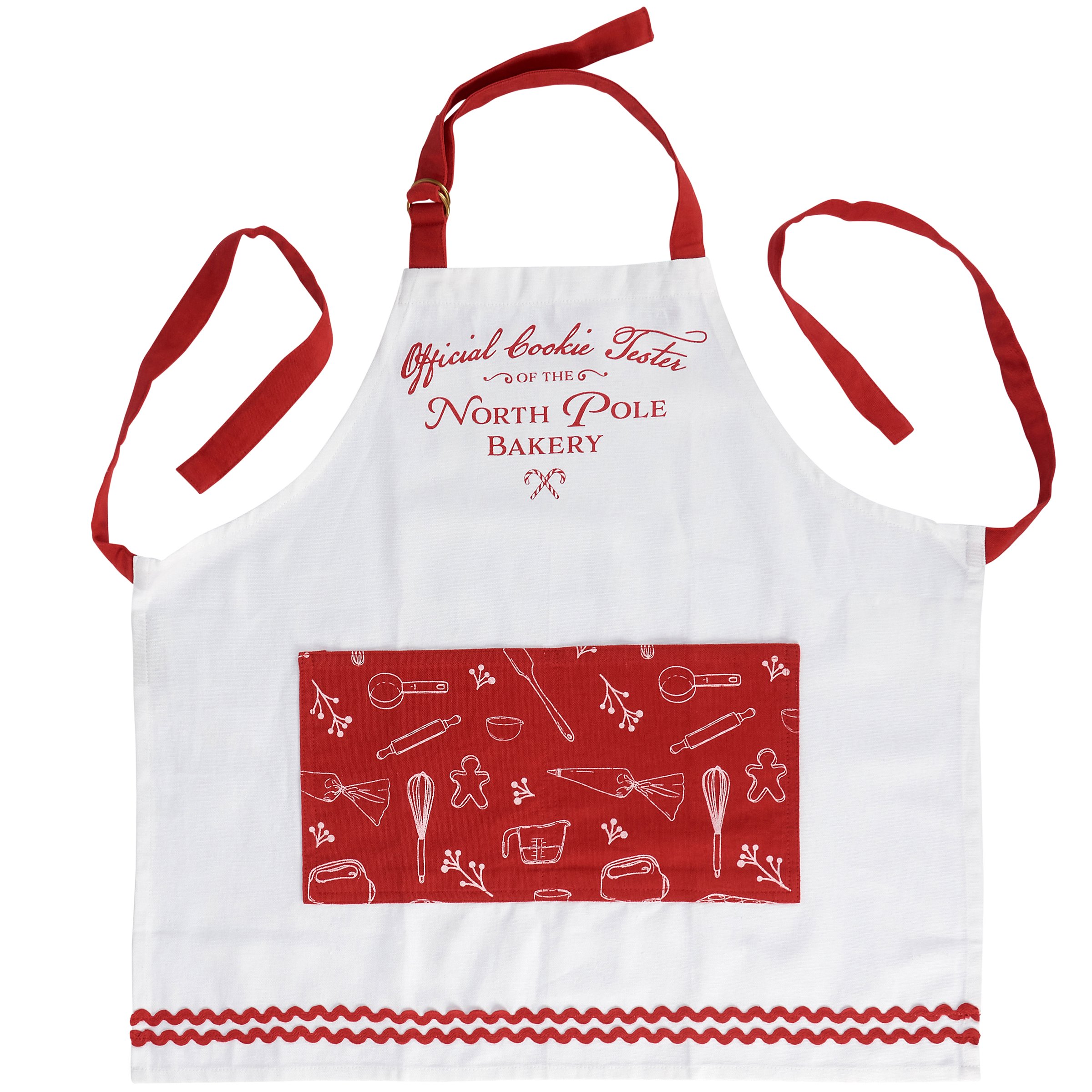 A seasonal apron set from our Christmas Collection including an adult size and child size apron with coordinating Christmas baking themed designs to add even more fun to holiday baking. Apron designs feature holiday red and white color with a fun hand illustrated pattern of Christmas baking items on the three pocket section and double ricrac ribbon trim accent at the bottom. Seasonal designs also feature coordinating Christmas themed sentiments that read "Official Cookie Baker Of The North Pole Bakery" on the adult apron and "Official Cookie Tester Of The North Pole Bakery" on the child apron. Family aprons each feature adjustable neck strap and waist ties to create the perfect fit. Our North Pole Bakery family aprons are packaged neatly folded together with cotton tape finish and tag displaying full designs making it great for gifting. Attached to a cardboard header with hole for easy rack display. Apron set is conveniently machine-washable for easy cleaning. Accessories pictured not included. A fun kitchen accessory perfect for seasonal use and holiday gifting.