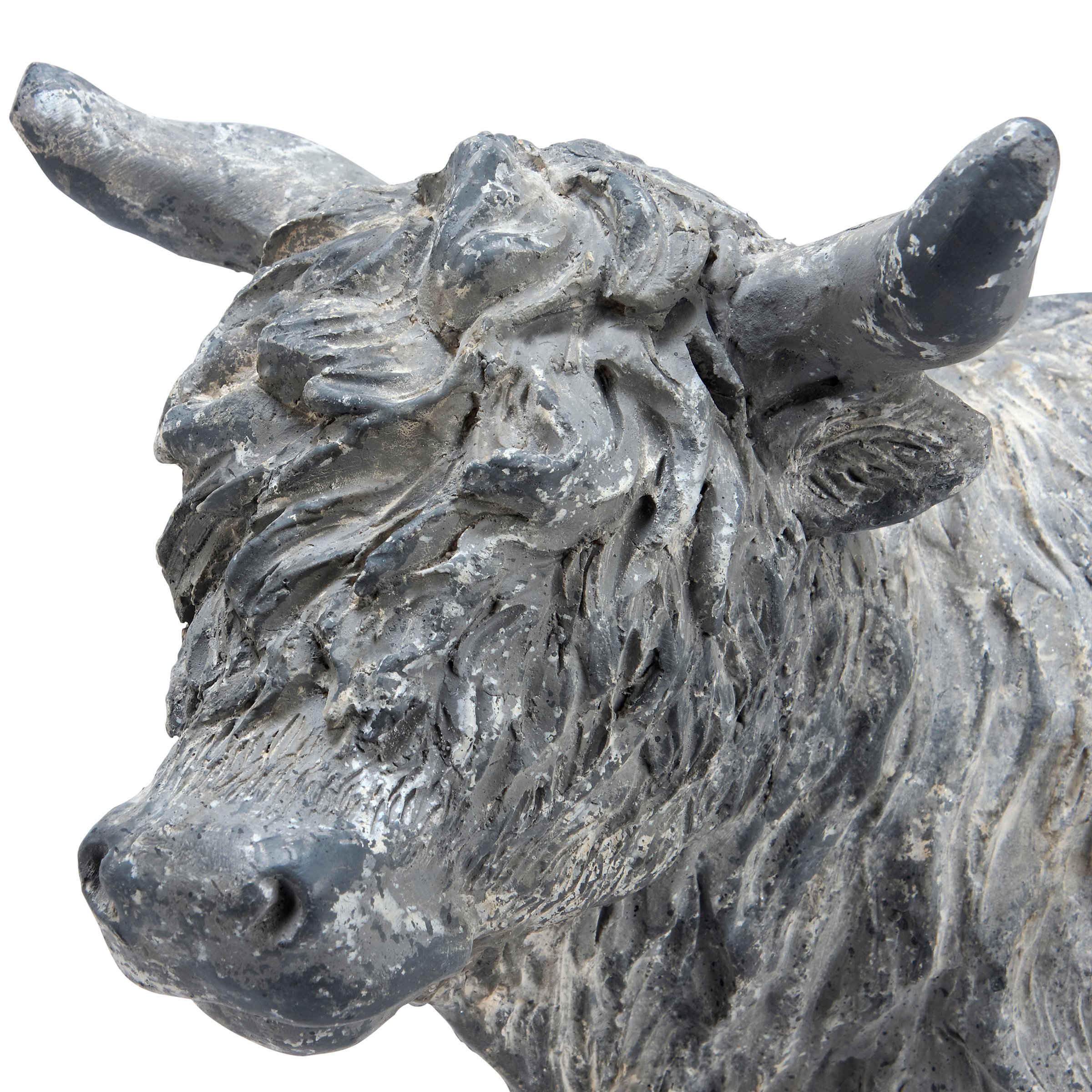 A decorative figurine from our Farmhouse Collection displaying a sculpted design of a highland cow that coordinates well with farmhouse decor. Highland cow figurine features stone-like finish to give appearance of a hand carved stone sculpture. Our Highland Cow figurine is designed to free-stand on any flat surface for display. A rustic farm-themed home accent that can be easily displayed in any indoor or outdoor space.
