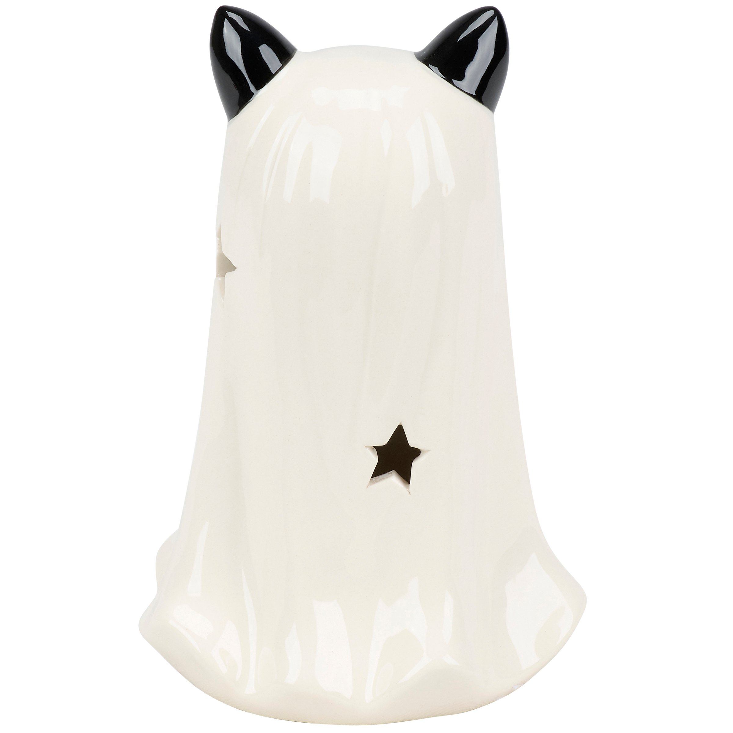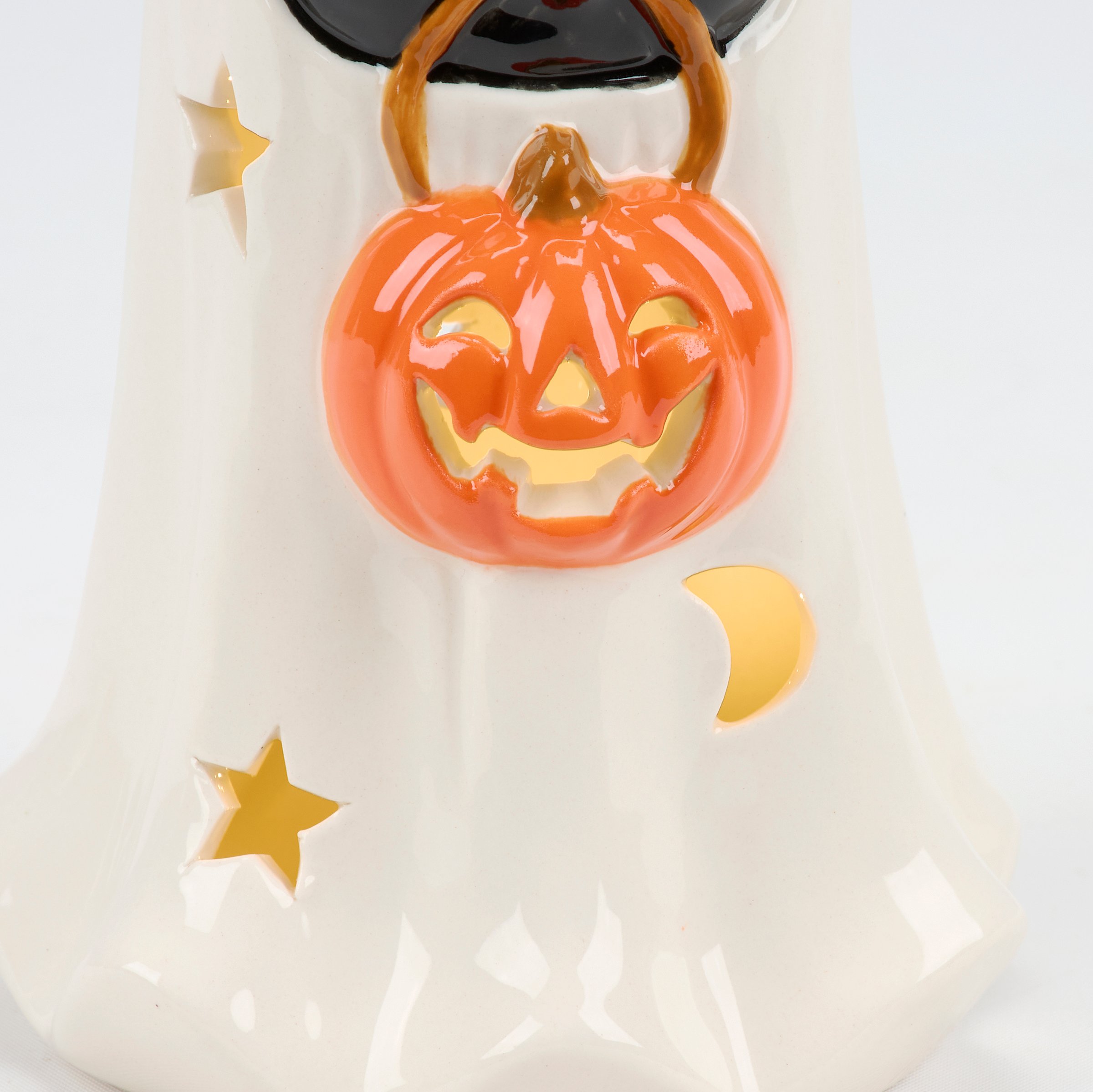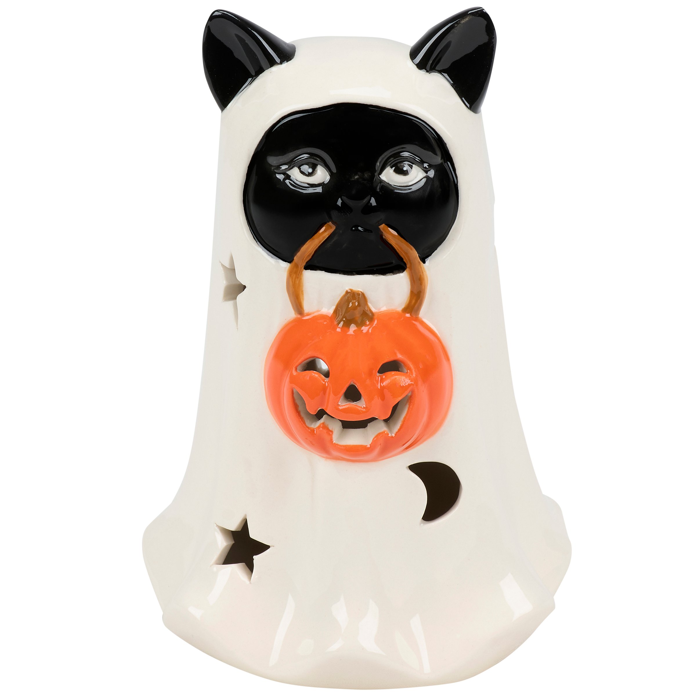 A decorative ceramic figurine from our Halloween Collection displaying a black cat wearing a ghost costume and holding a jack o'lantern with a colorful glaze finish. Ghost cat figurine features a light source inside that illuminates the jack o'lantern face and ghost sheet cutouts powered by 3 LR44 batteries with a convenient 6 hour timer. Our Lighted Ghost Cat figurine is designed to free stand on any flat surface to easily add personality to any home or work space. A fun Halloween home accent perfect for adding seasonal mood lighting to any room.