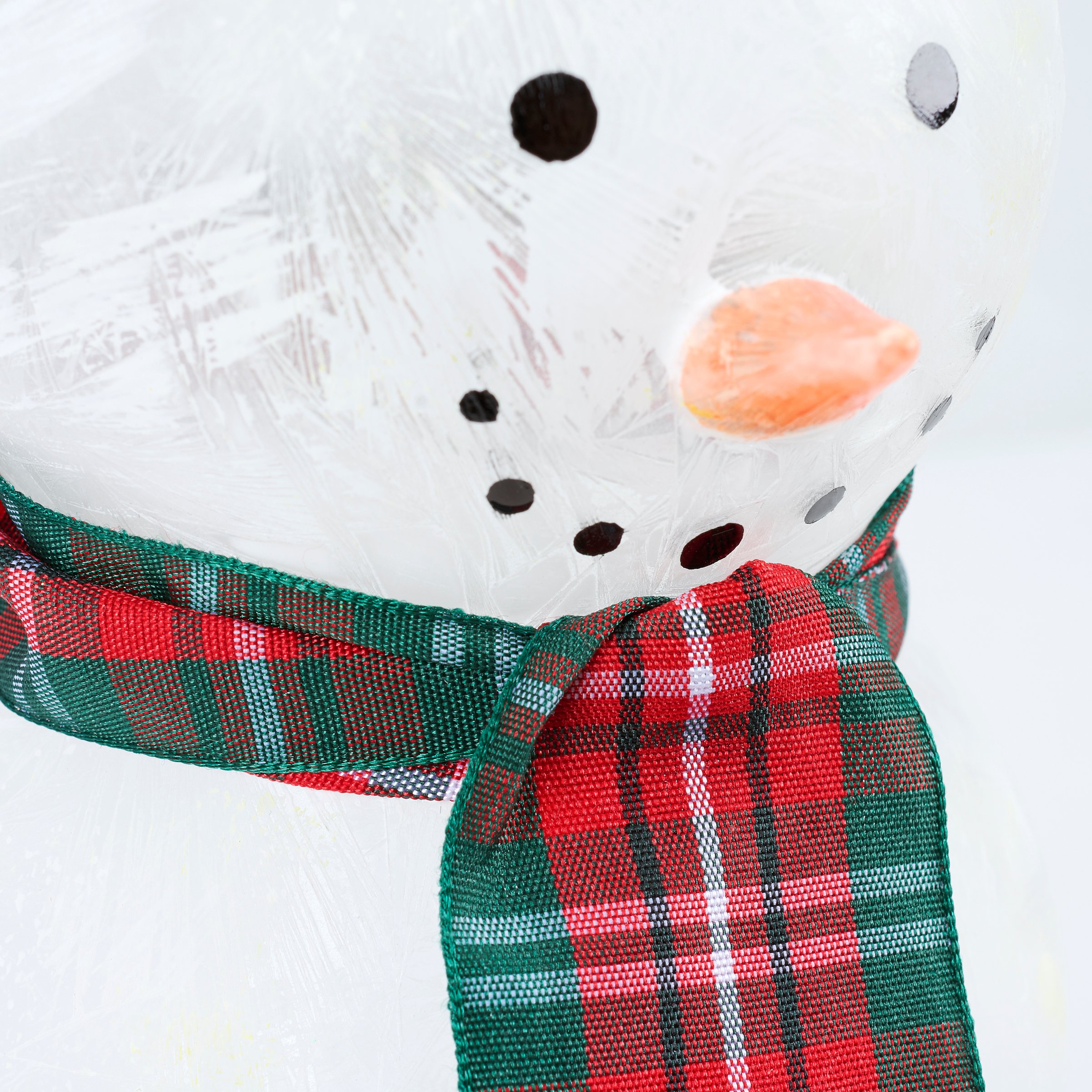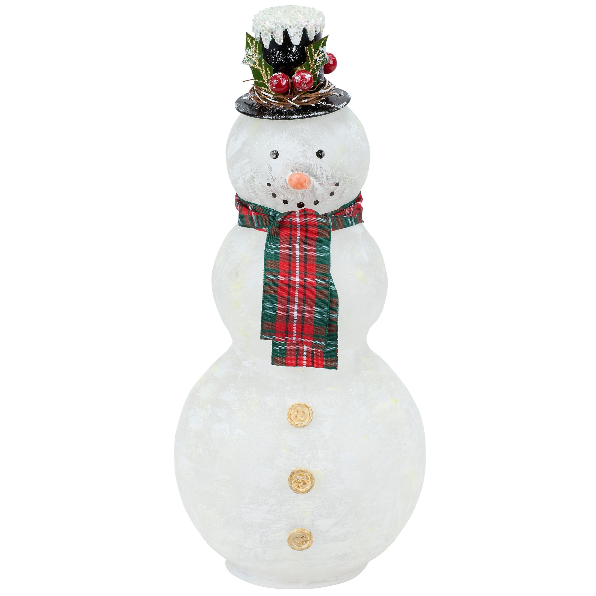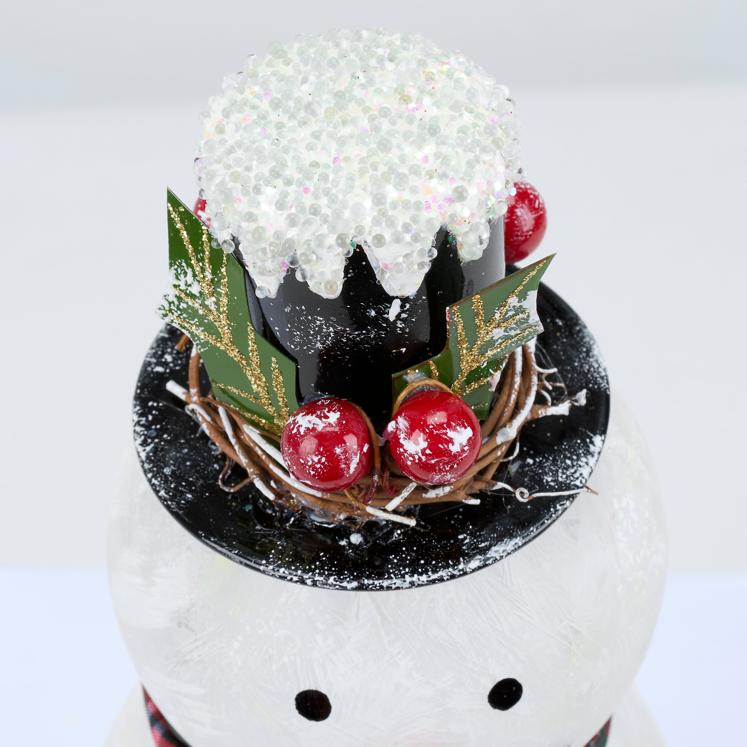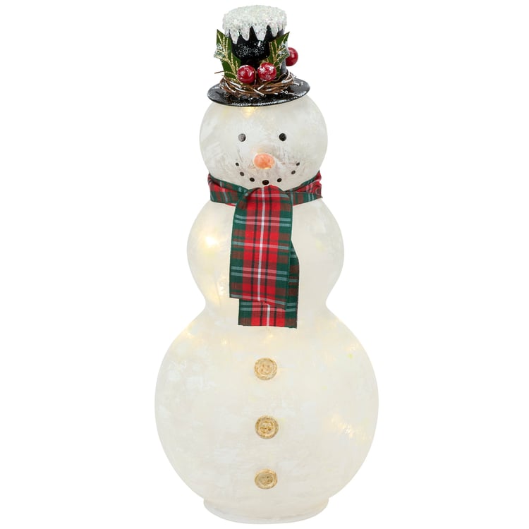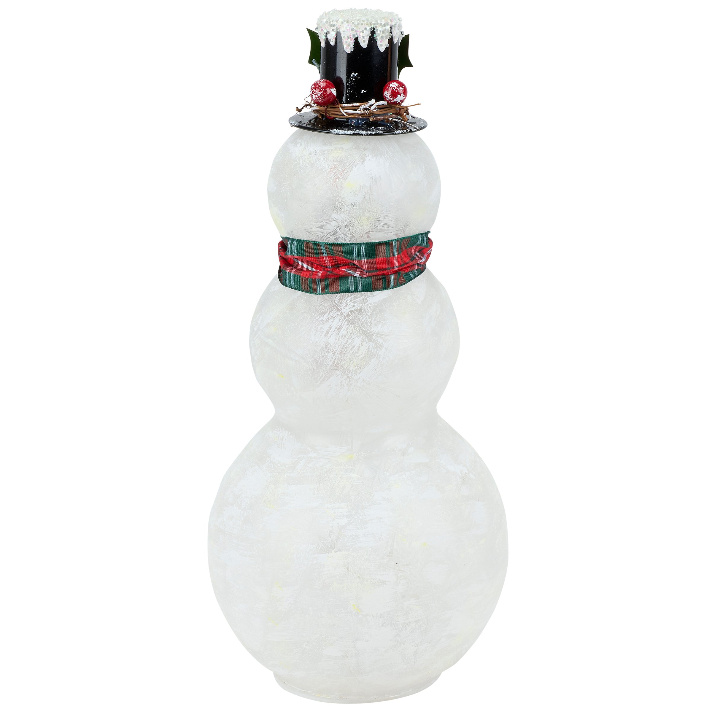 A decorative figurine from our Christmas Collection displaying a snowman design featuring a glass body with painted accents as well as detailed accessories including fabric scarf and snowy top hat. Snowman figurine features a light source inside that illuminates the painted glass body powered by 3 AAA batteries. Our Lighted Snowman figurine is designed to free stand on any flat surface to easily add personality to any home or work space. A fun Christmas home accent perfect for adding seasonal mood lighting to any room.