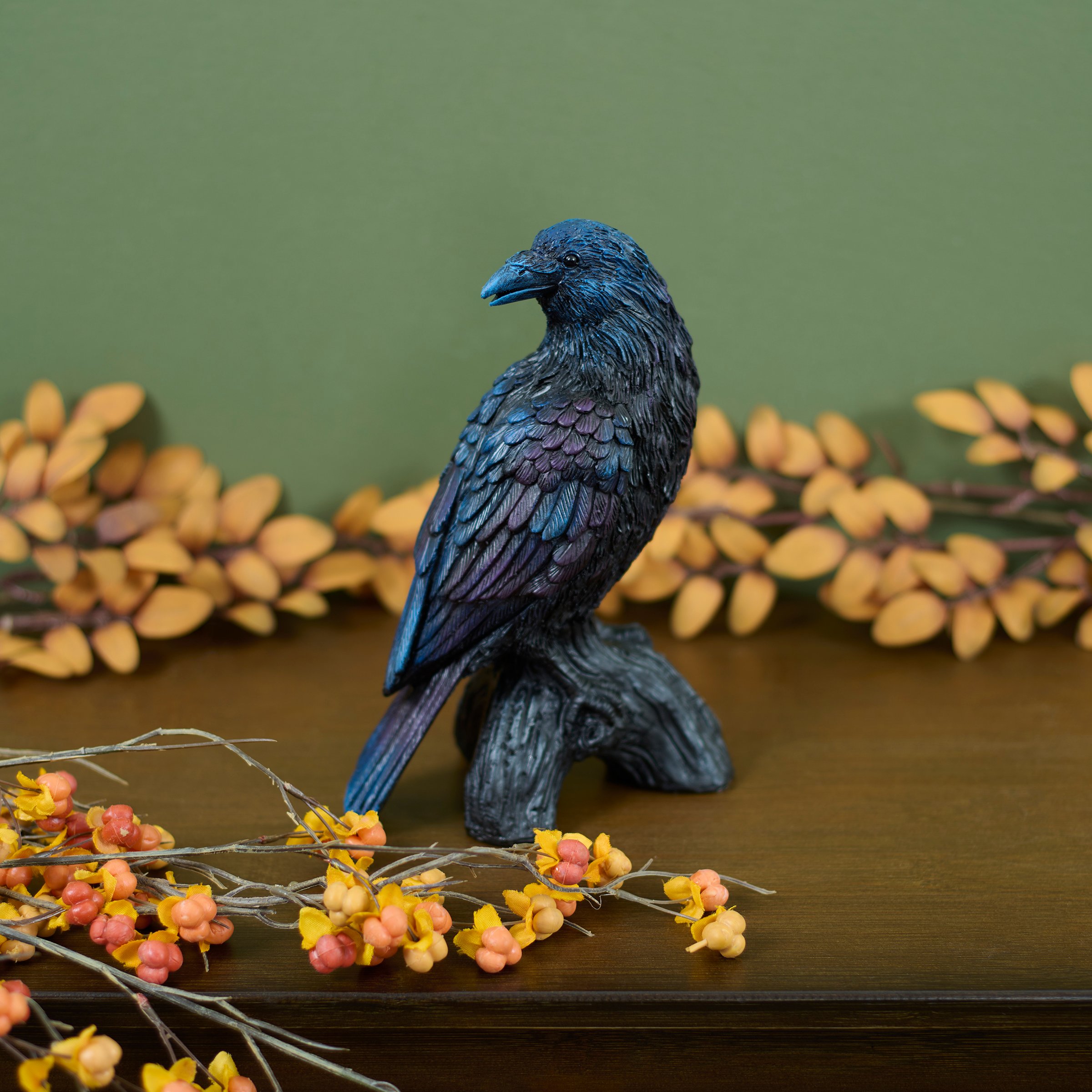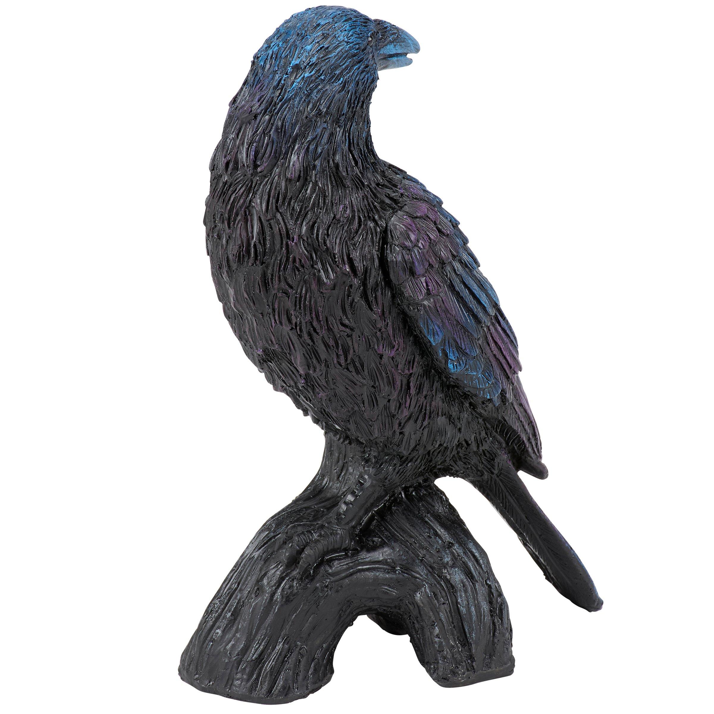 A decorative figurine from our Halloween Collection featuring a rustic design of a raven perched on a twisted tree branch with blue and purple painted accents that coordinates well with seasonal Halloween displays. Our Raven figurine is designed to free stand on flat surface to easily add personality to any home or work space. For decorative use only; this is not a toy. A rustic Halloween home accent with a variety of seasonal display options.