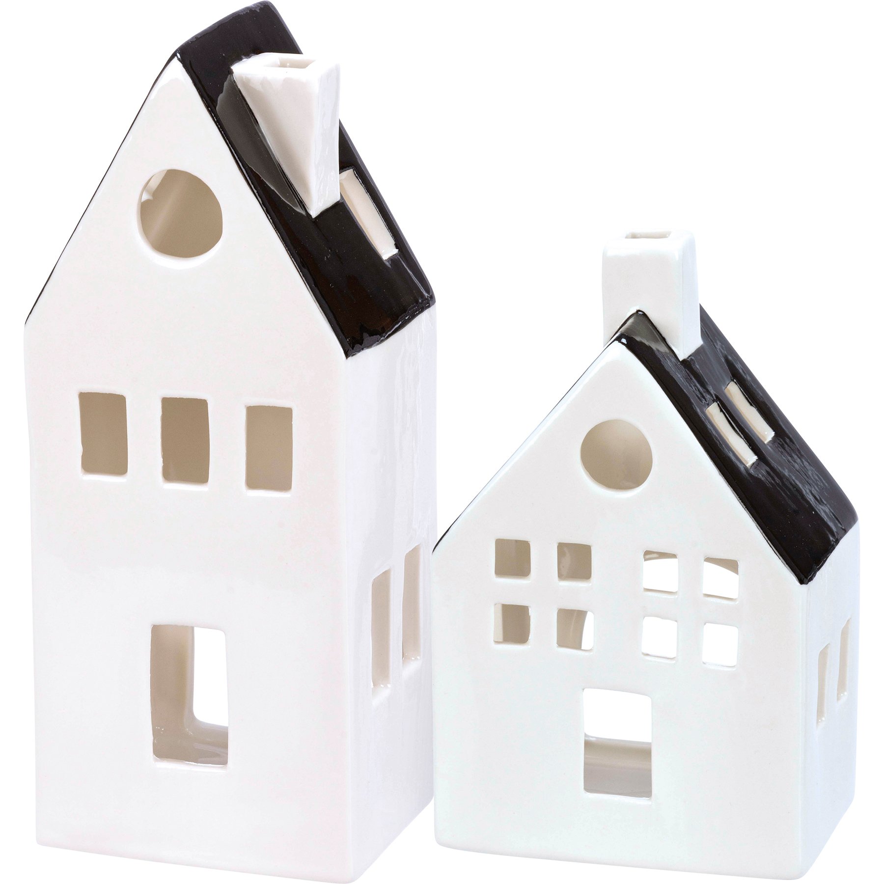 A set of two white ceramic houses from our Christmas Collection with black roof details and openings to display tea lights to create a charming ambience in any space. Tea lights not included.Our Black and White Houses Figurine Set holds one tea light in each house.