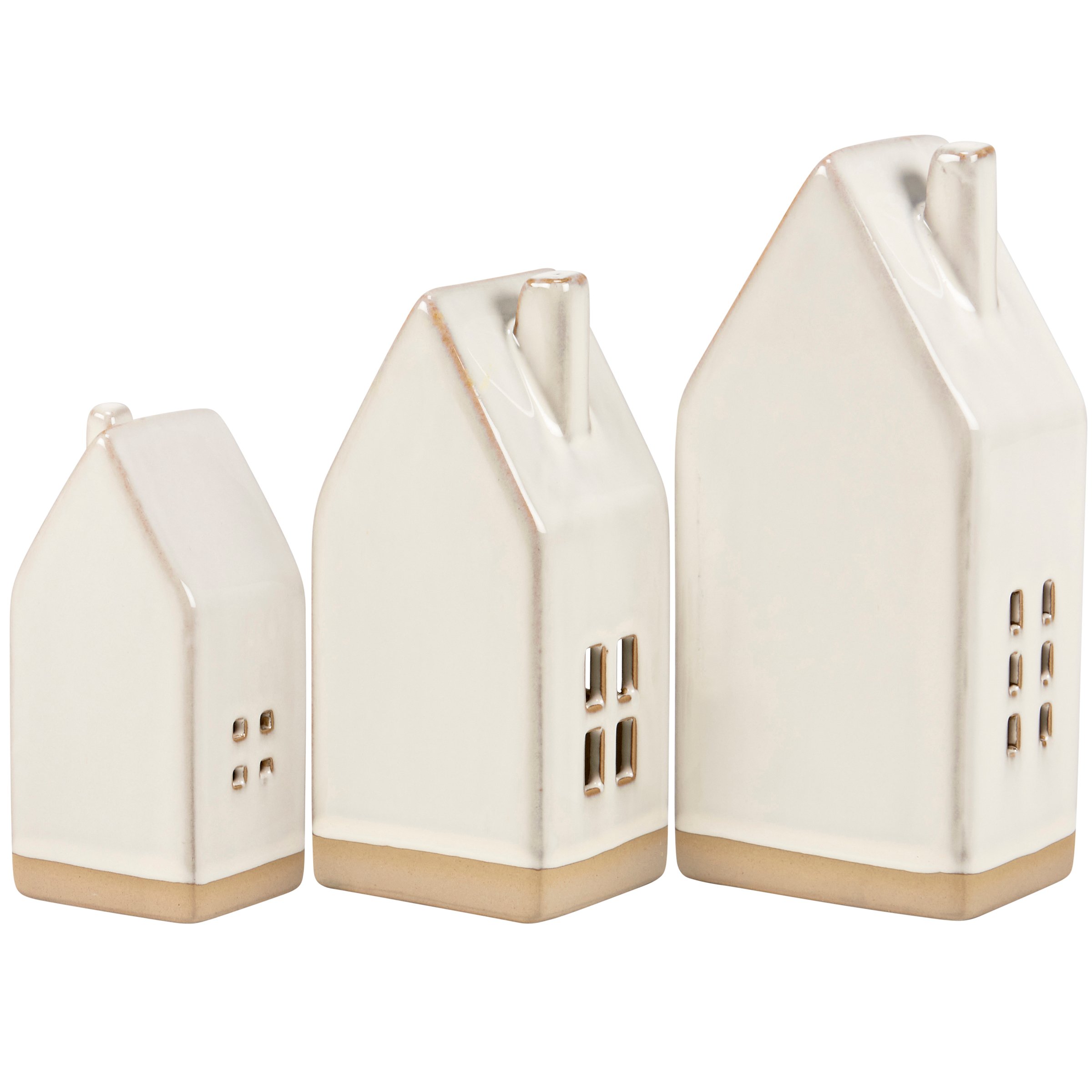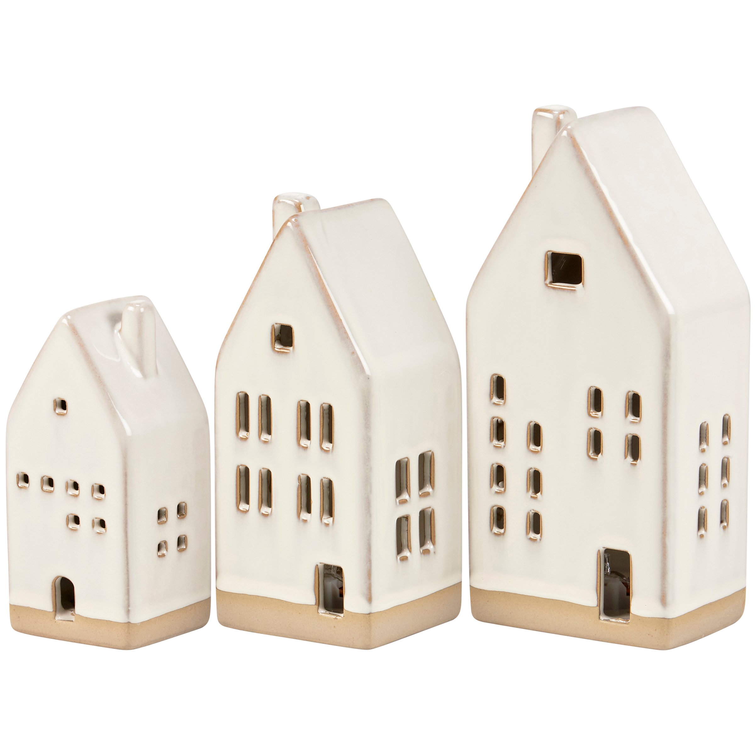 A set of three decorative stoneware figurines from our Christmas Collection displaying winter house designs in different sizes with a cream glaze finish and bare ceramic accents. Each winter house features a light source inside that illuminates the windows powered by 2 included LR44 batteries. Our Lighted Houses figurine set is designed to free-stand on any flat surface. A stylish seasonal home accent with a variety of display options.