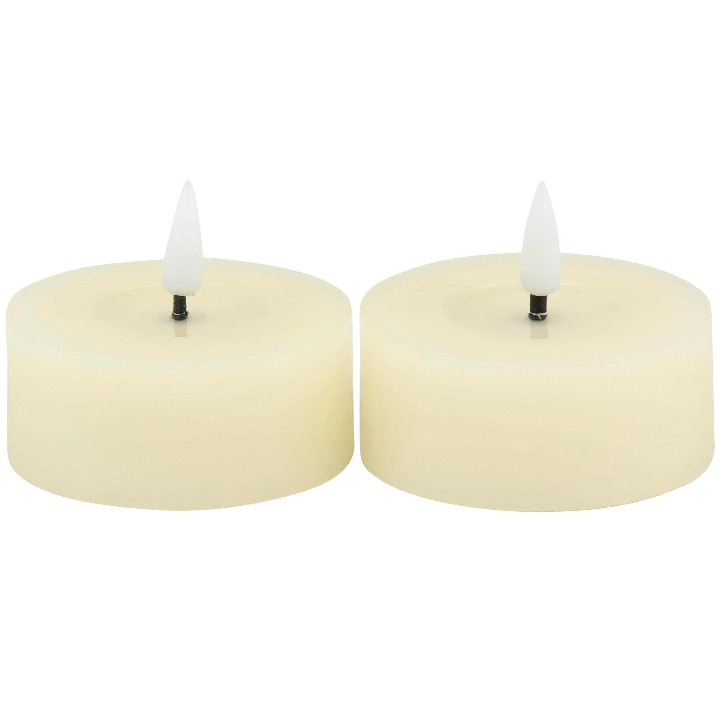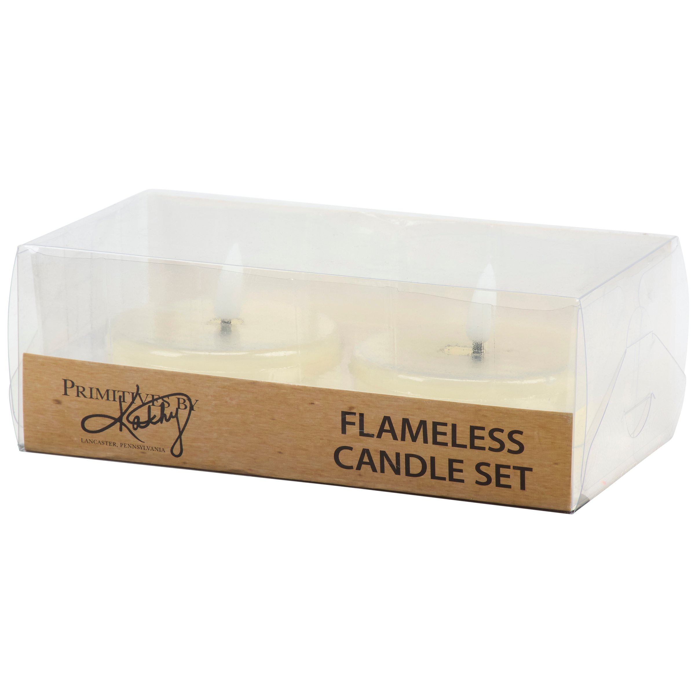 A set of 2 flameless candles from our Home Collection displaying tealight candle designs with melted wax details around the faux wicks. Each flameless candle features a light source resembling a small flame powered by 2 AAA batteries for each candle with convenient 6 hour timers. Batteries are not included. Our Tealight flameless candle set is packaged together in an acrylic box with product information to easily view items inside on store display. A set of candle accessories with a variety of options for adding mood lighting to any space.
