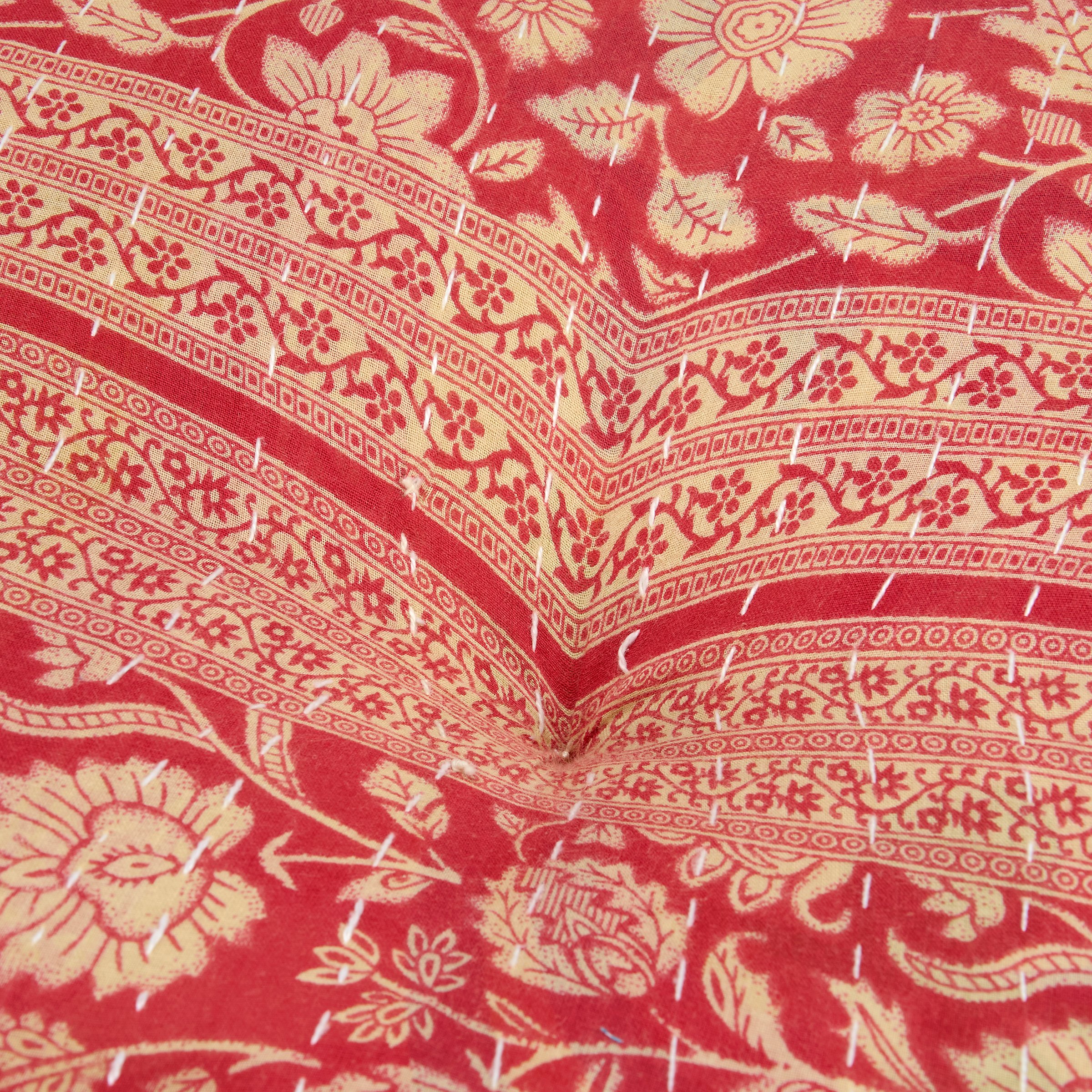 A sturdy cotton floor pillow from our Primitive Collection perfect for adding a fun and comfy seat anywhere in the home. Floor pillow displays a colorful Kantha design made by using various fabrics to give each design a unique combination of vibrant colors and beautiful patterns. While Kantha stitched placement and positioning may vary, patterns remain consistent between each unique pillow. Kantha floor pillow also features recycled cotton filling for a more eco-friendly home accent. Wipe clean with damp cloth. Our Round Kantha floor pillow is a stylish everyday home accent that adds functional style to any room.