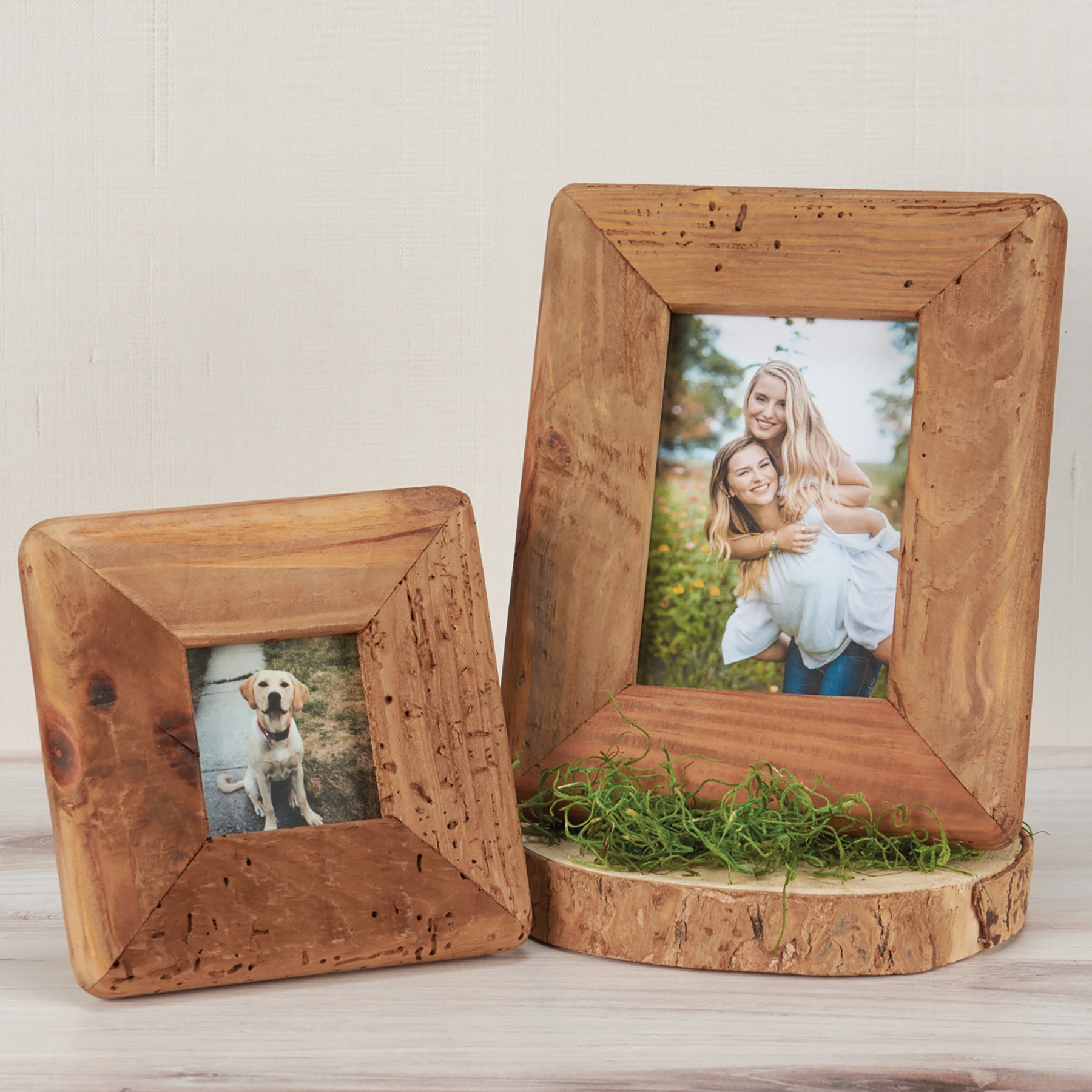 A wooden picture frame from our Rustic Collection displaying a simple wood design with natural details throughout. Frame fits a 4 inch x 6 inch photo and can easily be replaced via clips on back. Our rustic wood picture frame is easy to display using easel back to free-stand. A rustic option for displaying favorite memories as everyday home décor. Neutral design coordinates well with many styles.