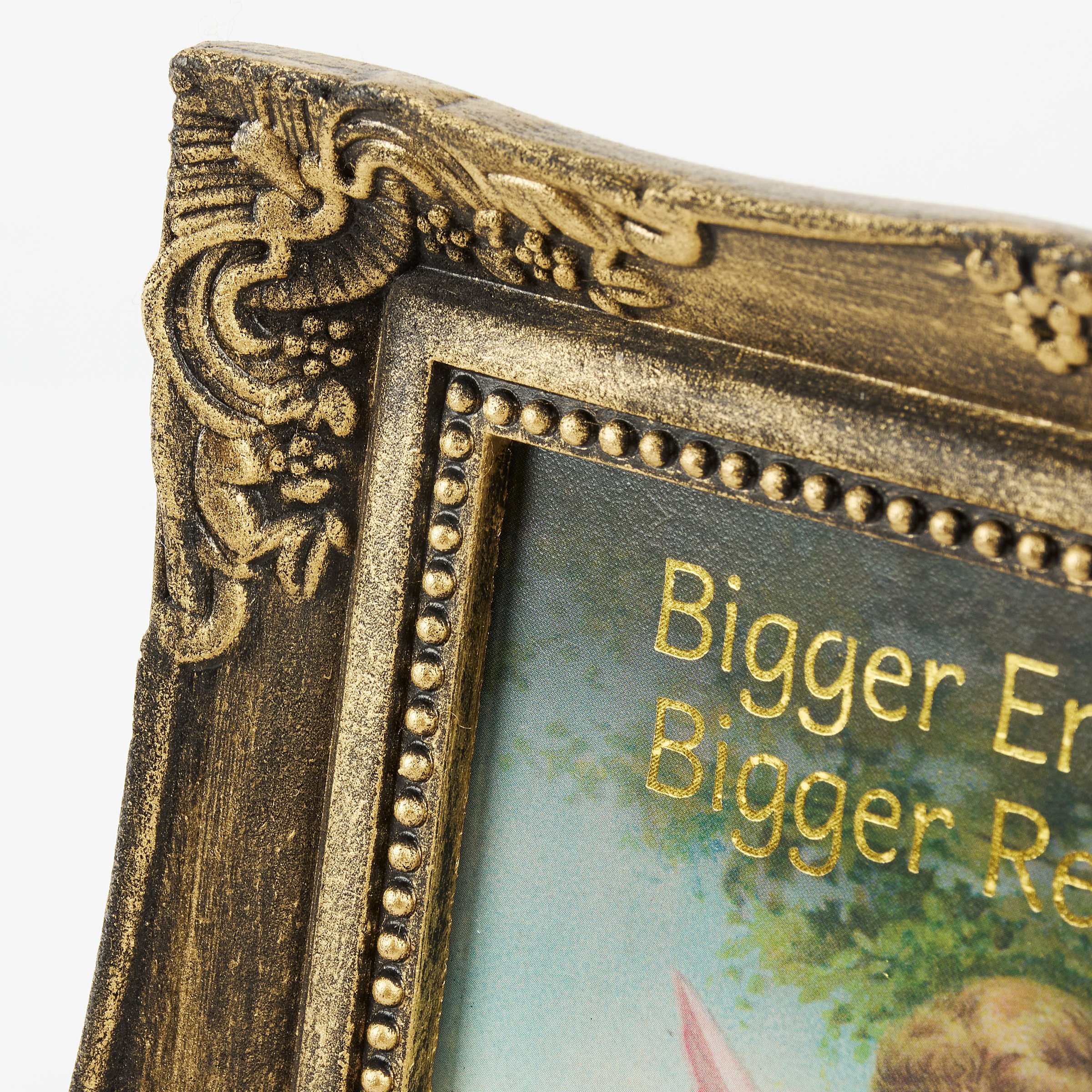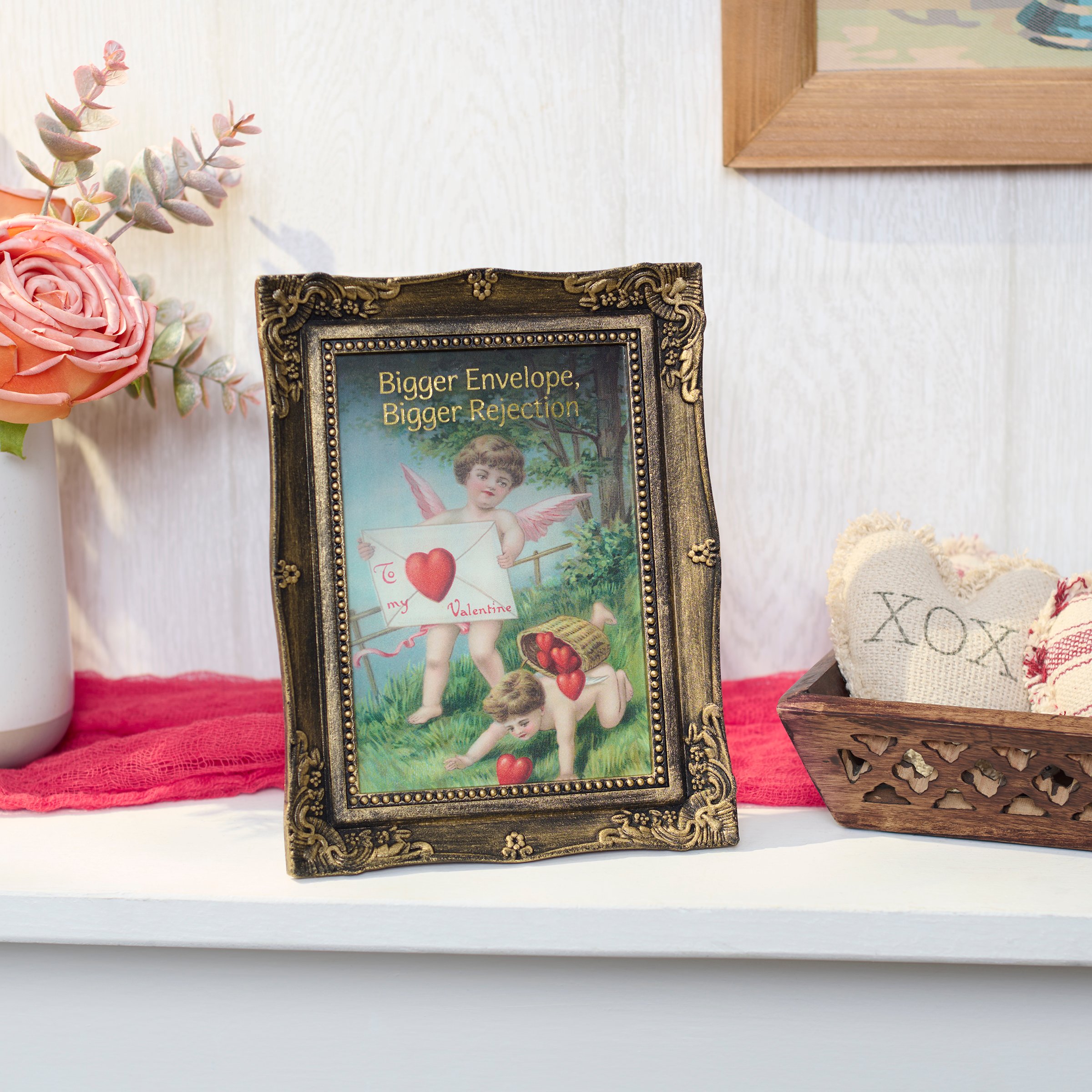 A framed art piece from our Anti Valentine Collection displaying charming vintage art of cupids with a sassy sentiment that offers a fun alternative to Valentine's Day decorating. Anti-valentine inspired design features vintage art of a cupid holding a large valentine below a gold foil sentiment that reads "Bigger Envelope, Bigger Rejection." Cupid art and sentiment is displayed inside a sculpted frame with metallic antique wash to complete the vintage style. Our Bigger Envelope framed art is easy to display using the attached easel to free-stand. A sassy love themed home accent that easily expresses anti-valentine sentiment while fitting in with Valentine's Day decor.