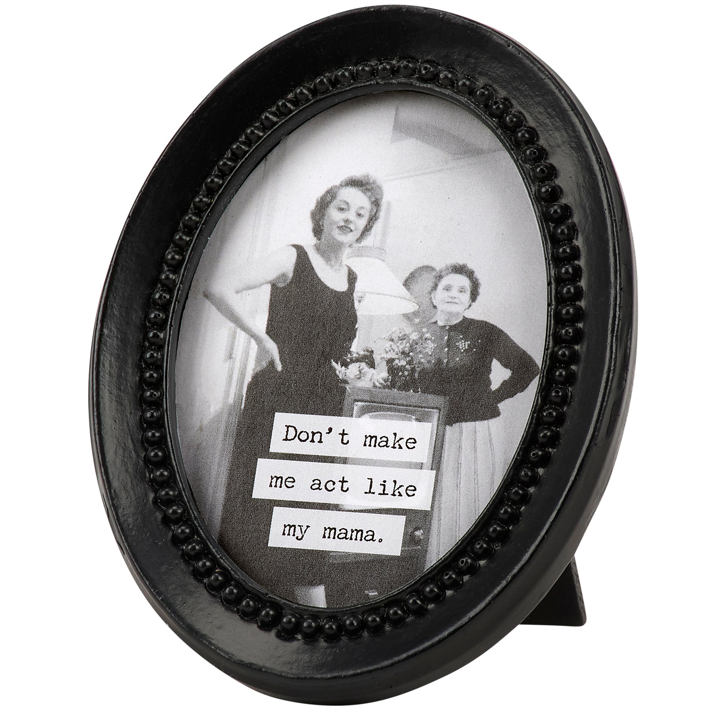 A small framed art piece from our Trash Talk By Annie Collection displaying a fun black and white photograph complemented with a sassy sentiment that reads "Don't Make Me Act Like My Mama." Photo and sentiment is displayed inside a sculpted frame to complete the vintage style. Our Don't Make Me Act Like My Mama framed art is easy to display using the attached easel to free-stand. A sassy vintage home accent that easily blends into a display adding personality to any home or work space.