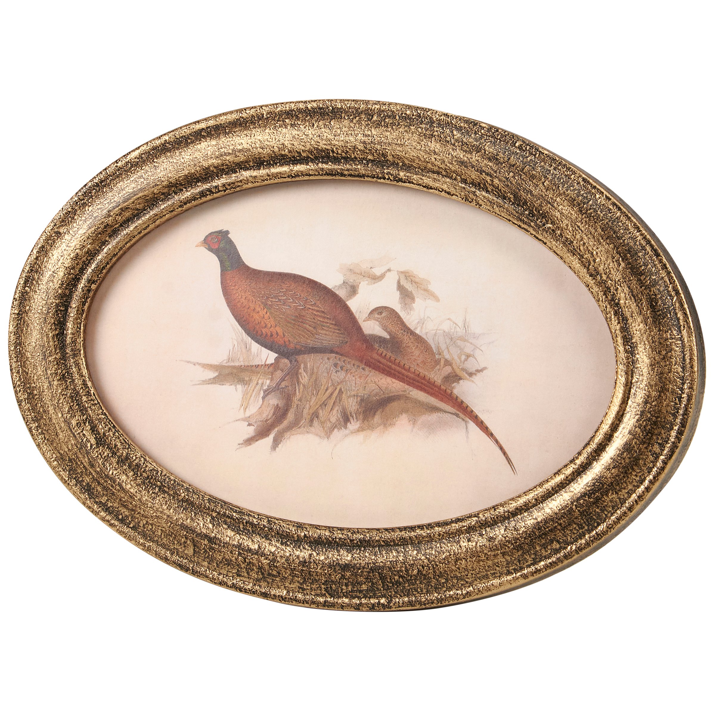 A small framed art piece from our Vintage Collection displaying vintage art of a pheasant inside an oval frame with metallic antique wash for a rustic style. Our Pheasant framed art is easy to display either using the easel to free-stand or hang via the attached sawtooth hanger. A vintage home accent perfect for everyday displays.