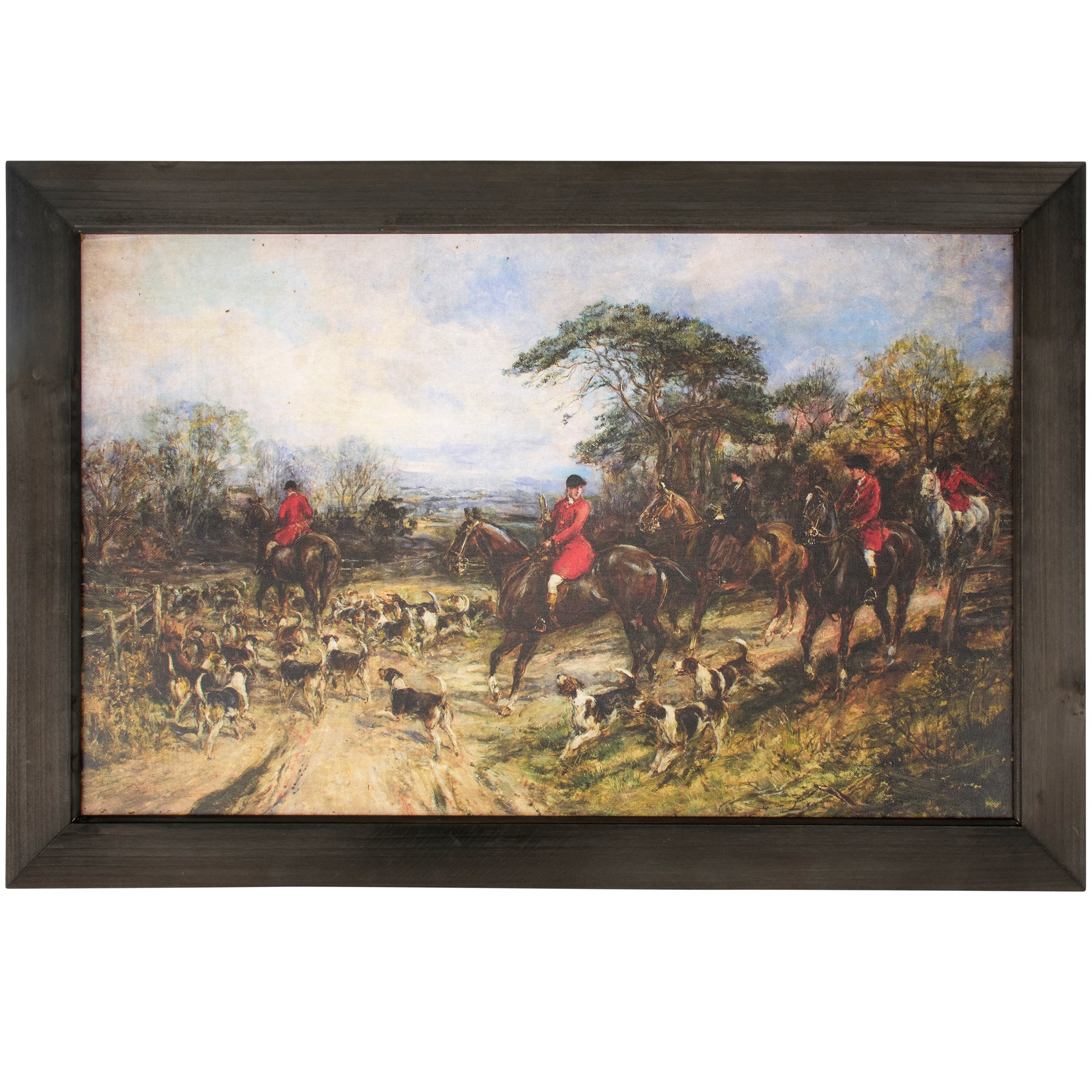 A framed art piece from our Preppy Heritage Collection displaying hand painted art of a hunting party on horseback inside a dark stain wooden frame that coordinates well with vintage home decor styles. Our Fox Hunt framed wall art is ready to hang for display using the attached sawtooth hanger on the back. An equestrian themed home accent perfect for adding vintage style to an everyday display.