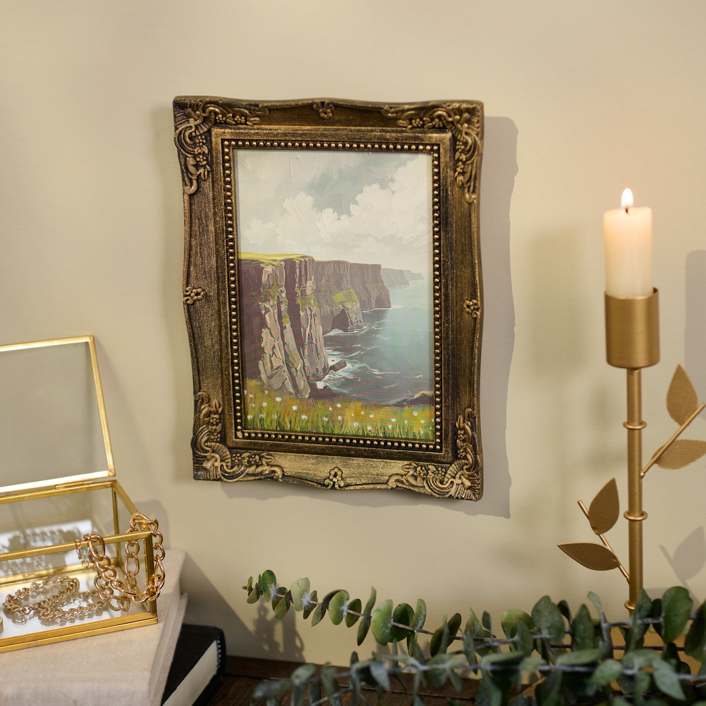 A framed art piece from our St. Patrick's Day Collection displaying vintage are of a coast and cliffs in Ireland. Frame features an ornate design with metallic antique wash for a vintage style. Our framed Irish Coast wall art is ready to hang for display via attached sawtooth hanger on the back. A vintage St. Patrick's Day home accent perfect for seasonal display.