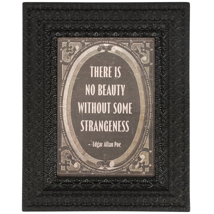 A framed art piece from our Dark Academia Collection displaying a moody literature inspired design featuring an Edgar Allan Poe quote that reads "There Is No Beauty Without Some Strangeness" inside a molded frame with black finish and textured pattern. Our Without Strangeness framed wall art is ready to hang for display using the attached sawtooth hanger on the back. A moody Halloween home accent perfect for adding vintage style to a seasonal display.