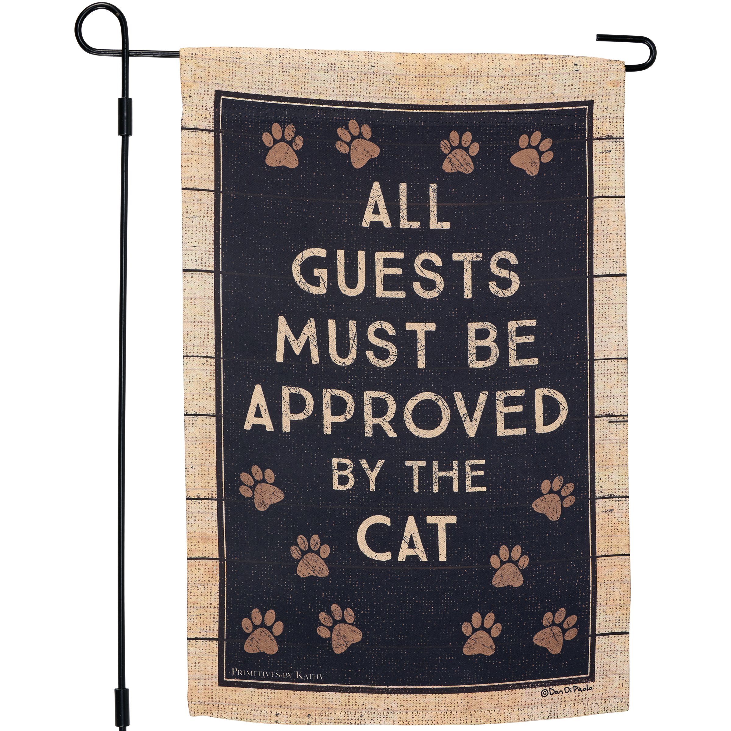 A double-sided polyester garden flag from our Pet Collection displaying a pet-themed design in a rustic style. Design features paw prints and "All Guests Must Be Approved By The Cat" sentiment. Garden flag is weather-resistant and features an opening to hang on our Garden Flag Pole. Hand-wash only. Our Approved By Cat garden flag is packaged with a header card and hook to easily hang on rack. A fun pet-themed home accent perfect for everyday display in any yard or garden.