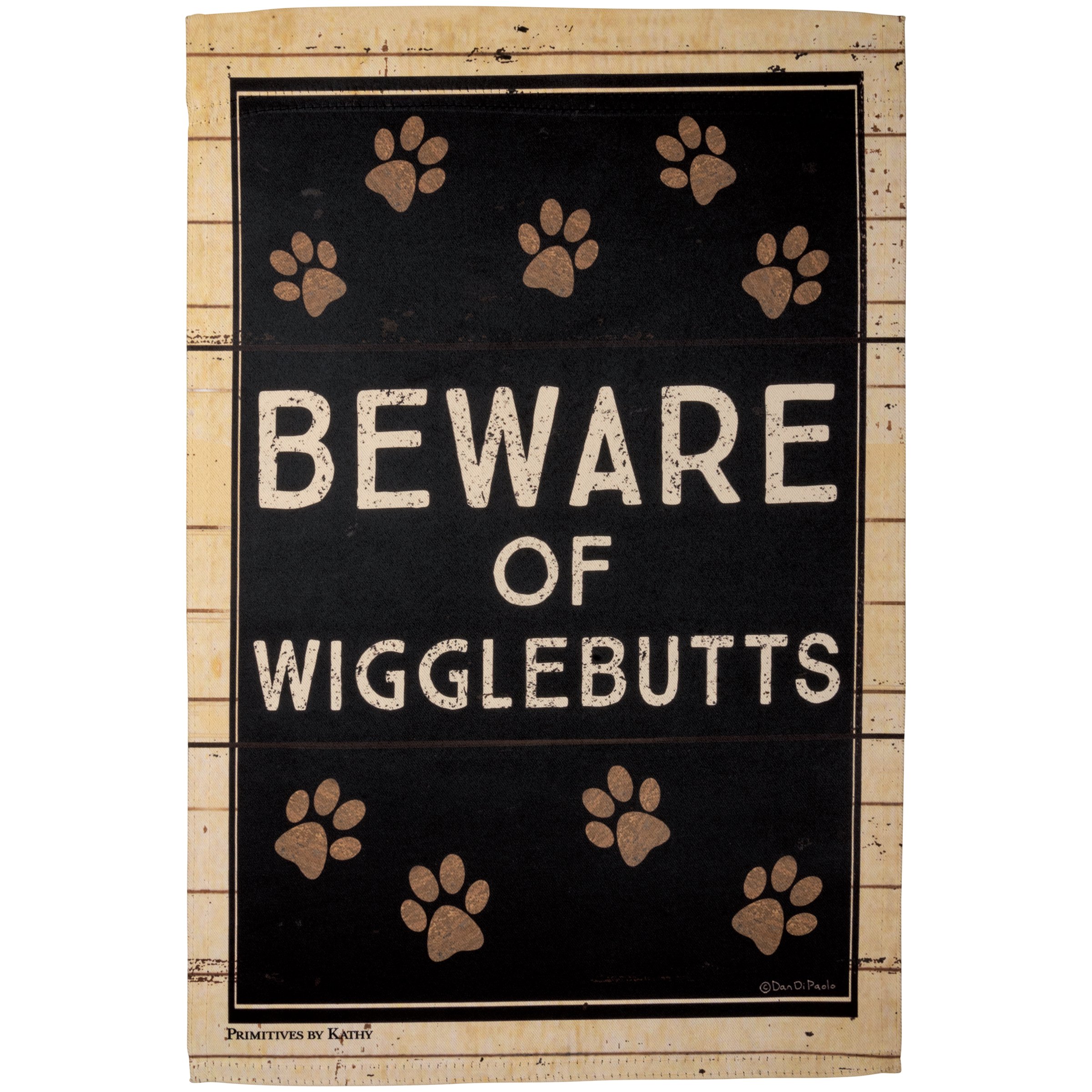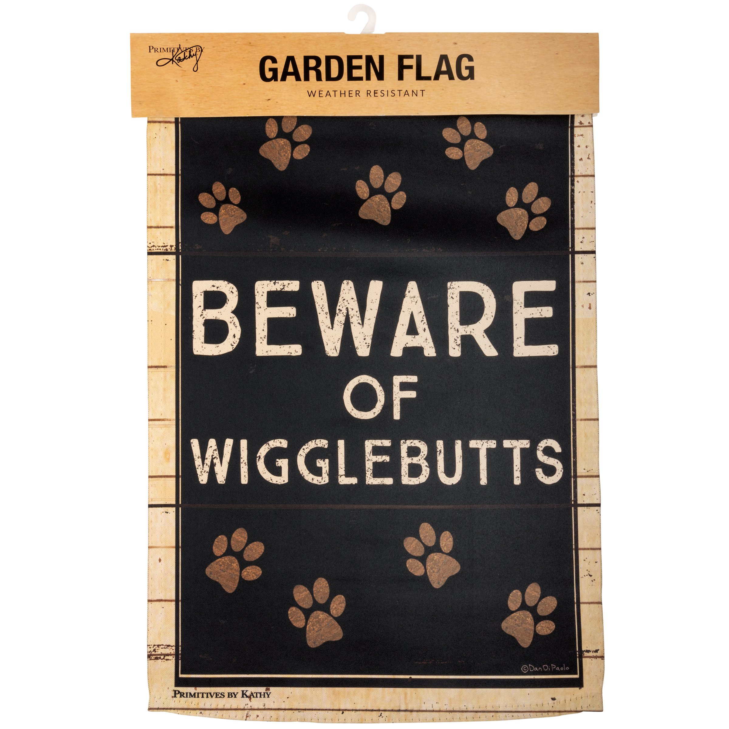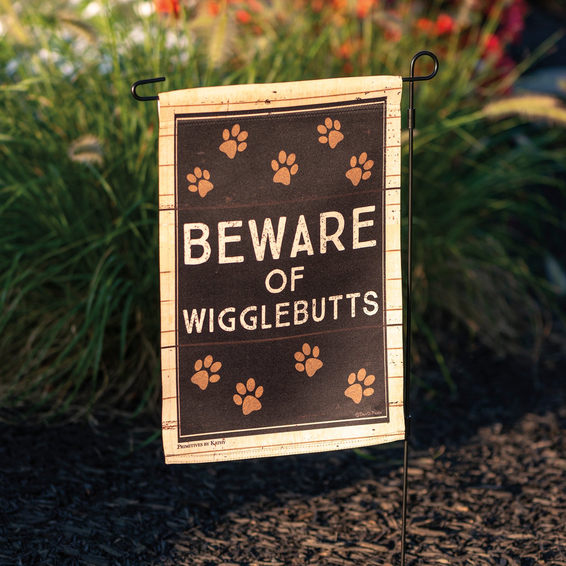A double-sided polyester garden flag featuring a rustic design with paw print icons and "Beware Of Wigglebutts" sentiment. Garden flags are weather-resistant and feature an opening to hang on our Garden Flag Pole. Hand-wash only.