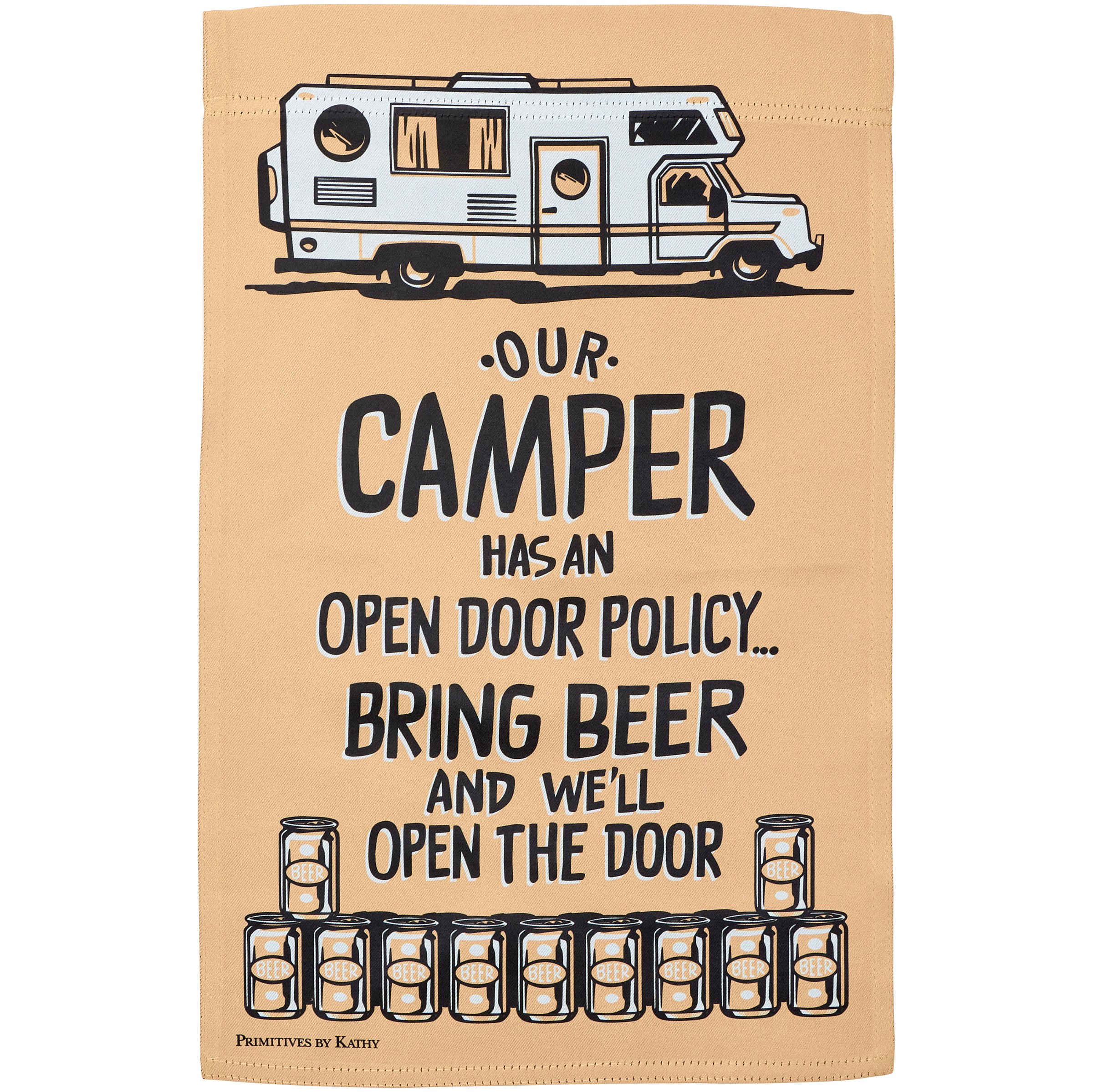 A double-sided polyester garden flag from our Lake & Cabin Collection displaying a hand illustrated design of a camper and stacked beer cans accenting a humorous camping-themed sentiment that reads "Our Camper Has An Open Door Policy... Bring Beer And We'll Open The Door." Garden flag is weather-resistant and features an opening to hang on our Garden Flag Pole. Our Bring Beer garden flag is packaged with a header card and hook to easily hang on rack. Hand wash only. A fun everyday home accent perfect for any yard or campsite.