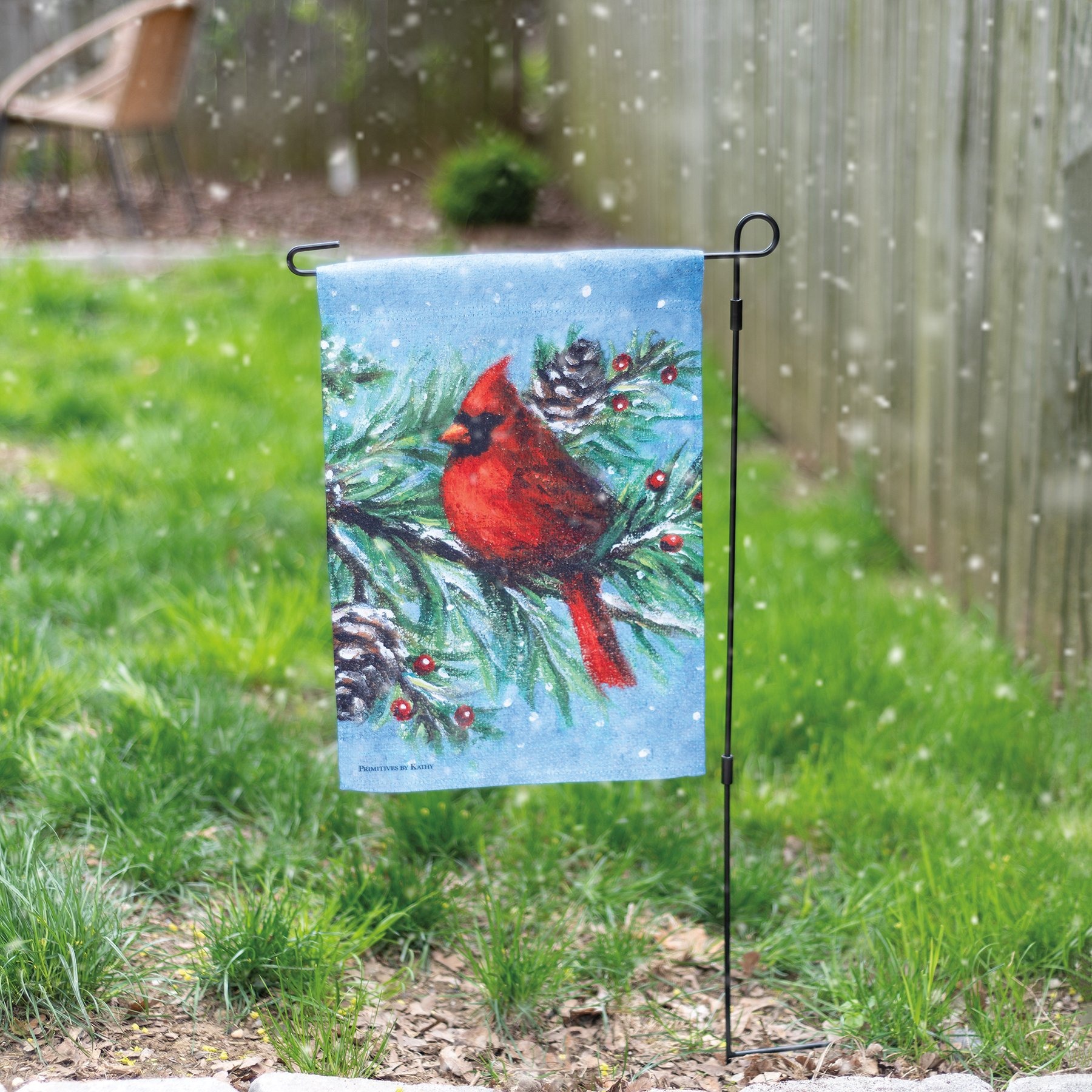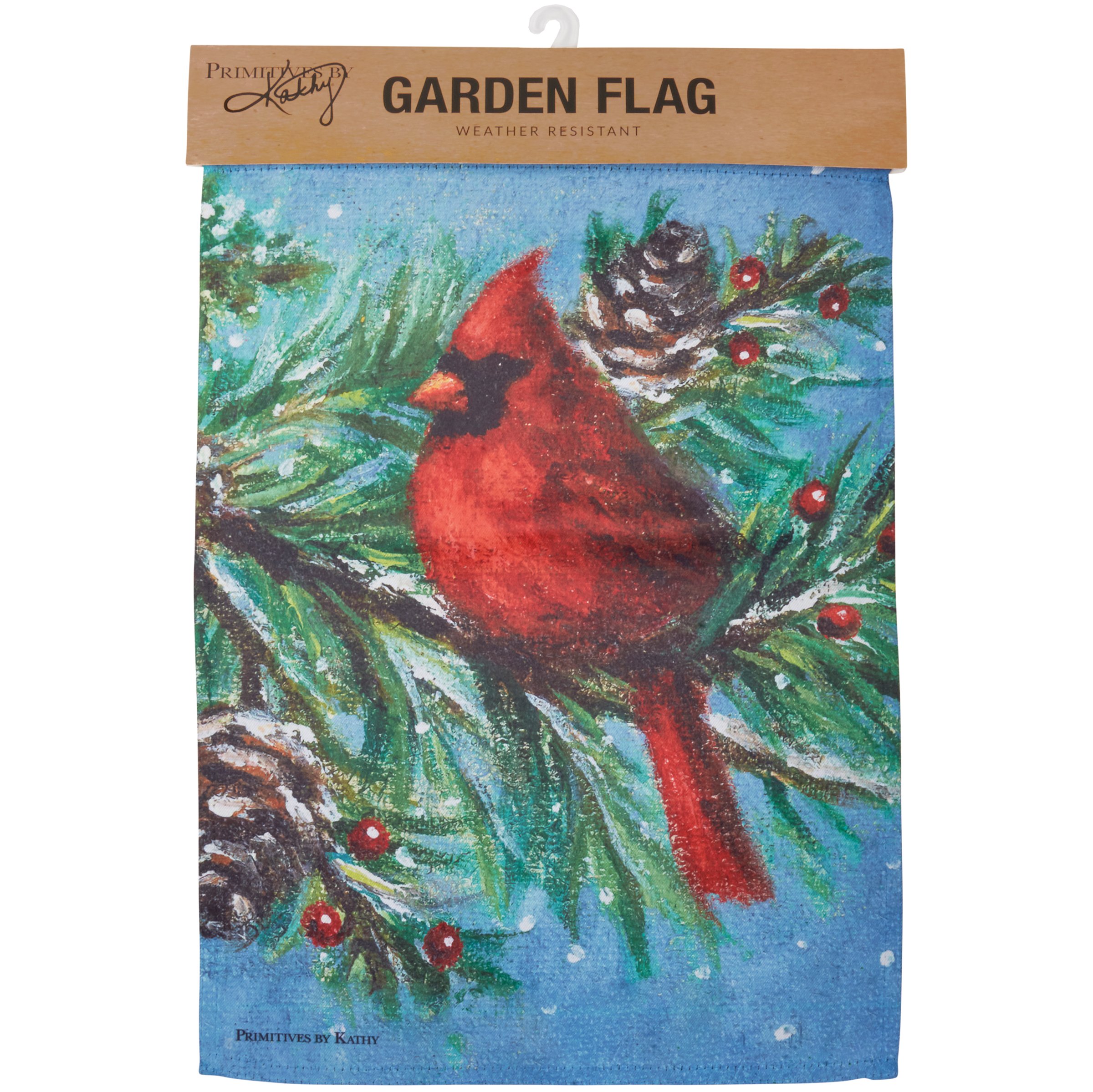 A double-sided polyester garden flag from our Christmas Collection displaying a design of a cardinal with snowy woodland background. Design is replicated from original artwork painted onto burlap canvas, giving the art a unique depth and texture. Our garden flags are weather-resistant and feature an opening to hang on ourĀ Garden Flag Pole. Hand-wash only. The Cardinal garden flag is packaged with a header card and hook to hang on rack.