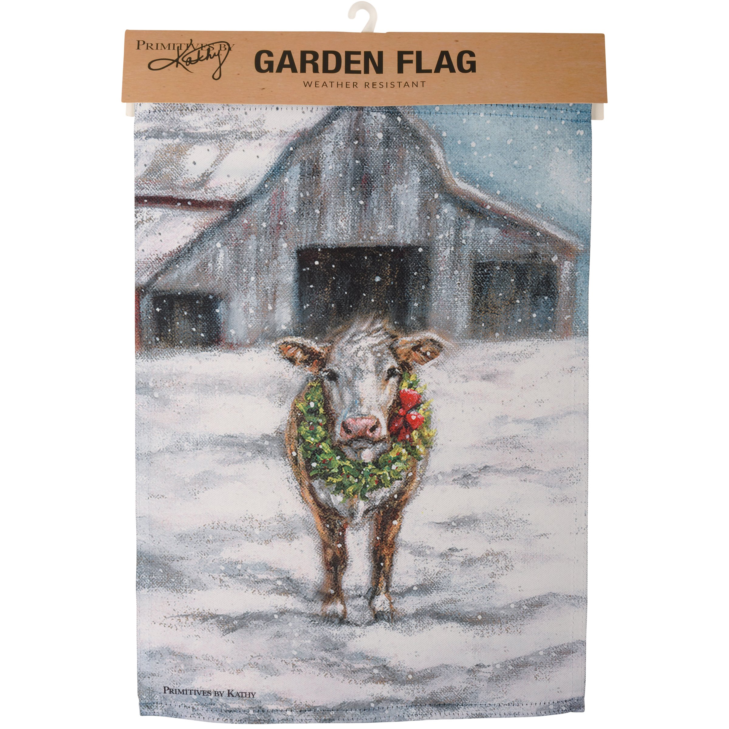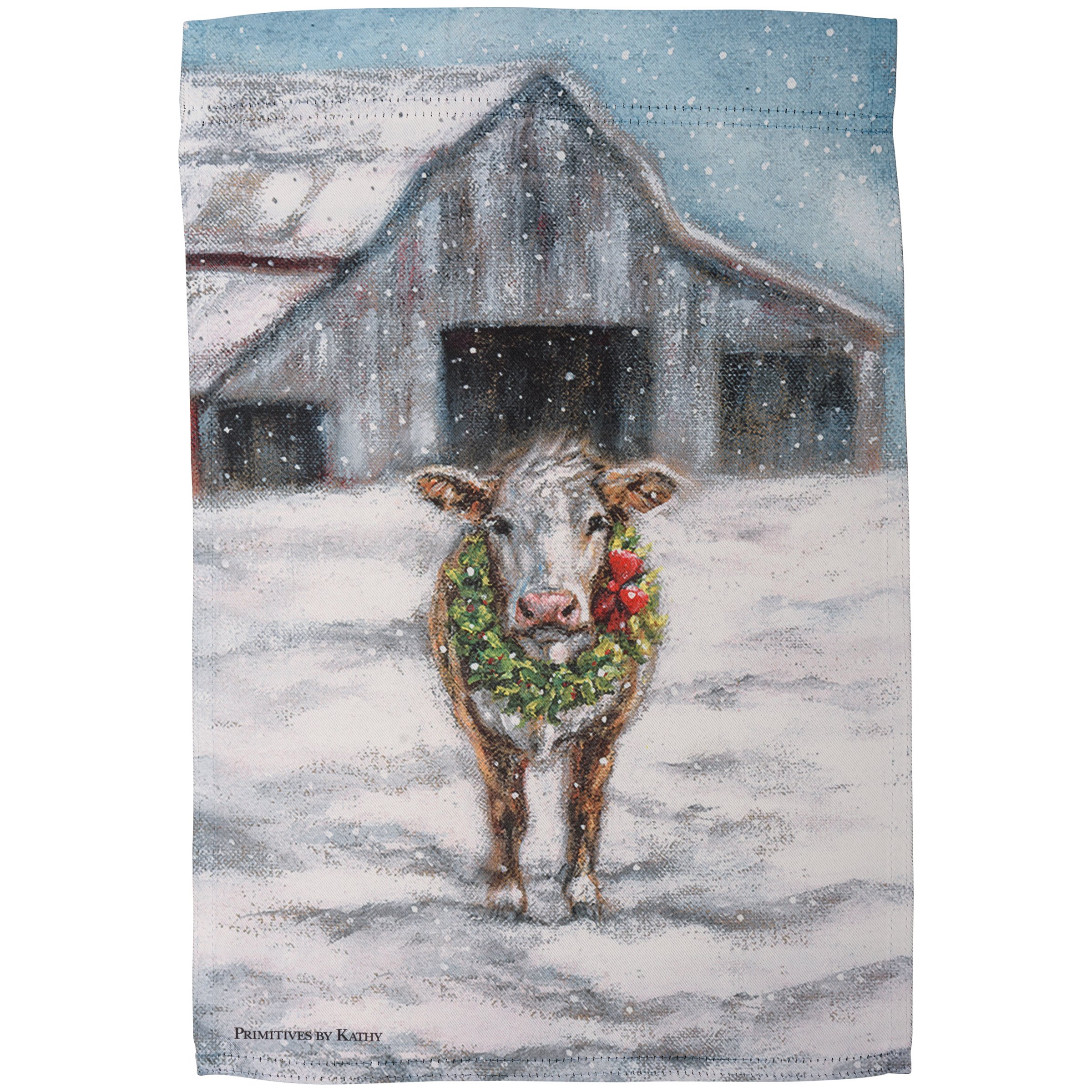 A double-sided polyester garden flag from our Christmas Collection depicting a snowy design featuring a cow with a wreath in front of a barn. Design is replicated from original artwork painted onto burlap canvas, giving the art a unique depth and texture. Garden flags are weather-resistant and feature an opening to hang on our Garden Flag Pole. Hand-wash only.