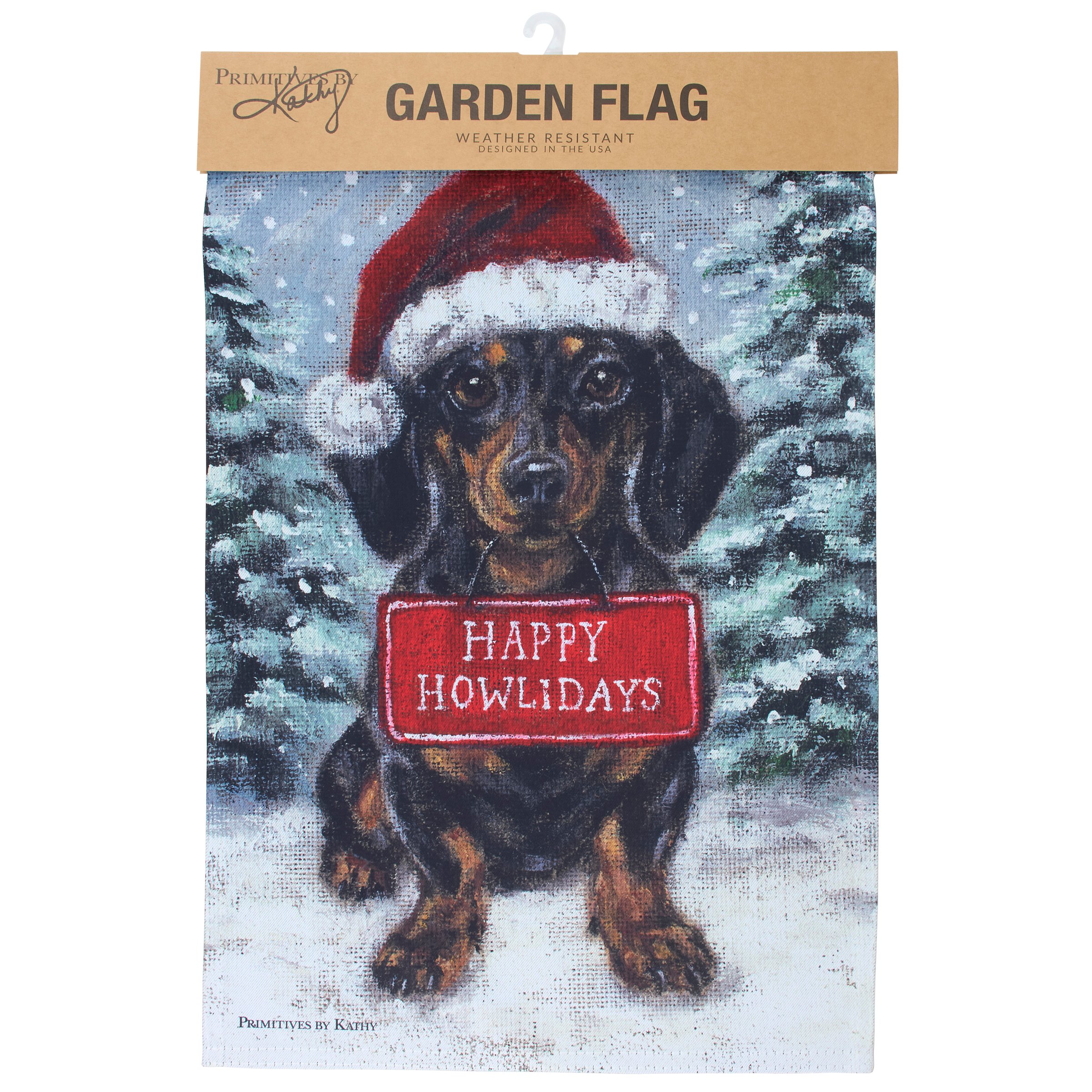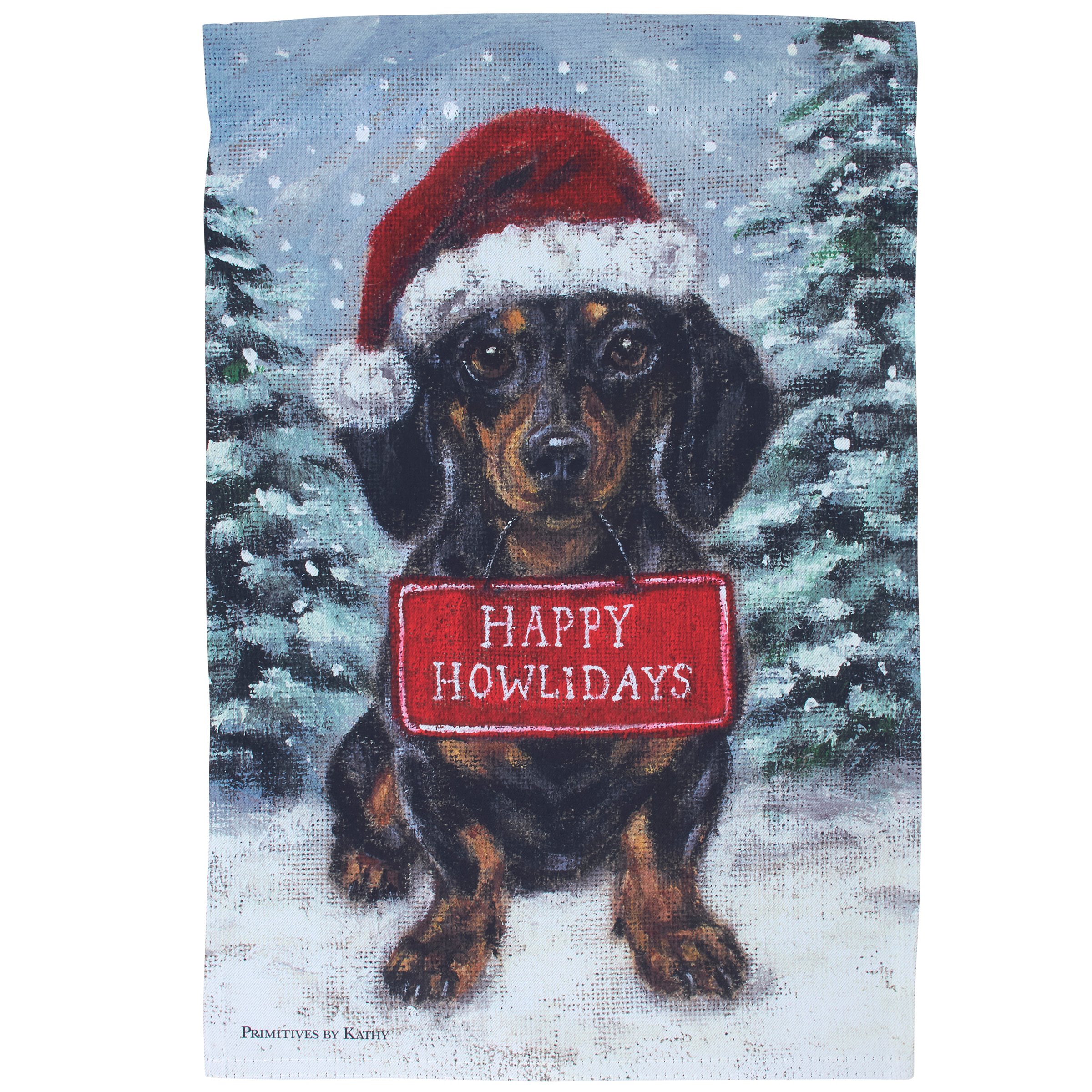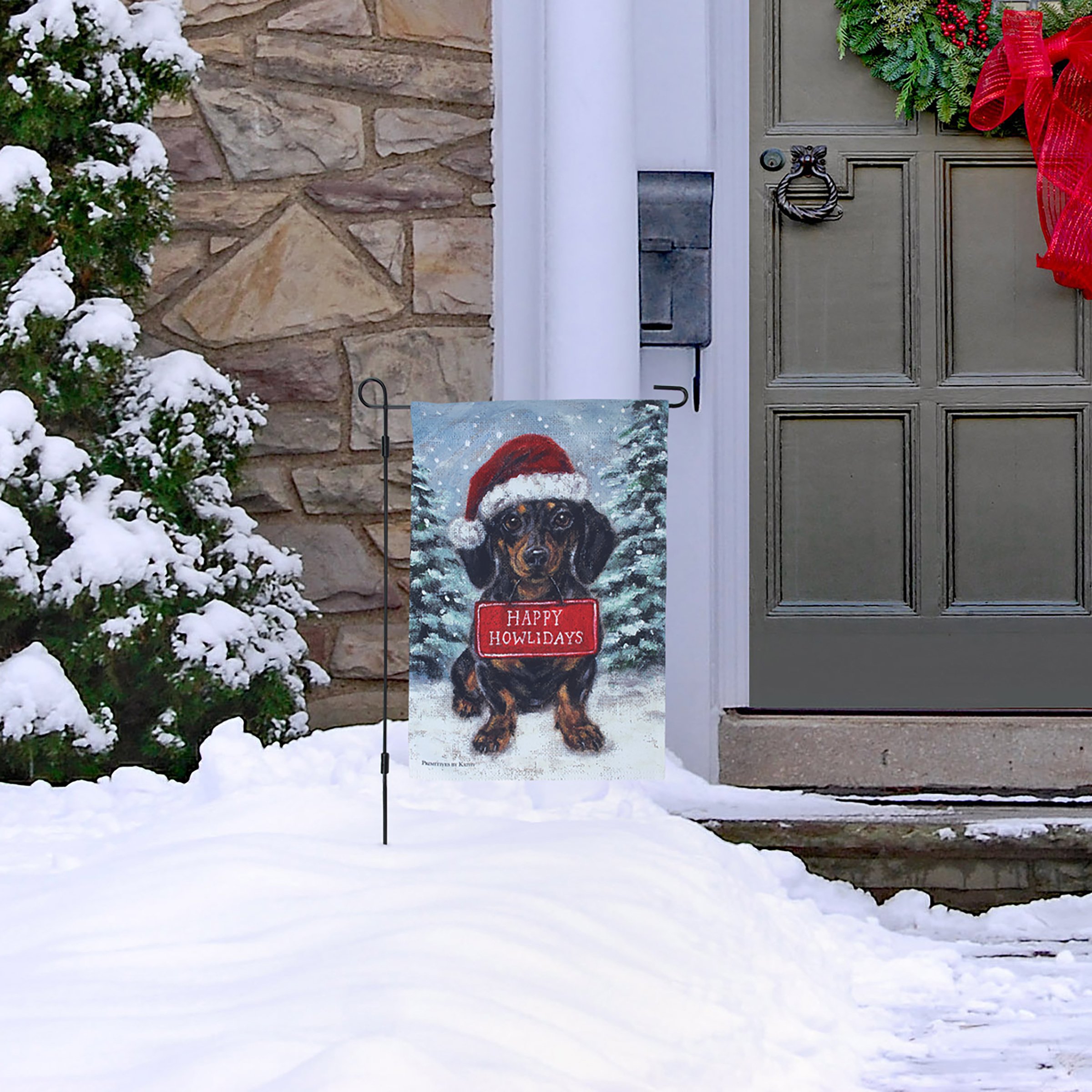 A polyester garden flag from our Holiday Pet Collection/ featuring a double-sided design displaying a charming winter scene of a Dachshund dog wearing a Santa hat and holding a sign that reads "Happy Howlidays" for a fun combination of a love for Christmas and pets. Christmas Dachshund design is replicated from original artwork painted onto burlap canvas, giving the art a unique depth and texture. Seasonal garden flag is weather-resistant and features an opening to hang on our Garden Flag Pole. Hand-wash only. Our Dachshund Happy Howlidays garden flag is packaged with a header card and hook to easily hang on rack for store display. A fun dog themed home accent perfect for seasonal display in any yard or garden.