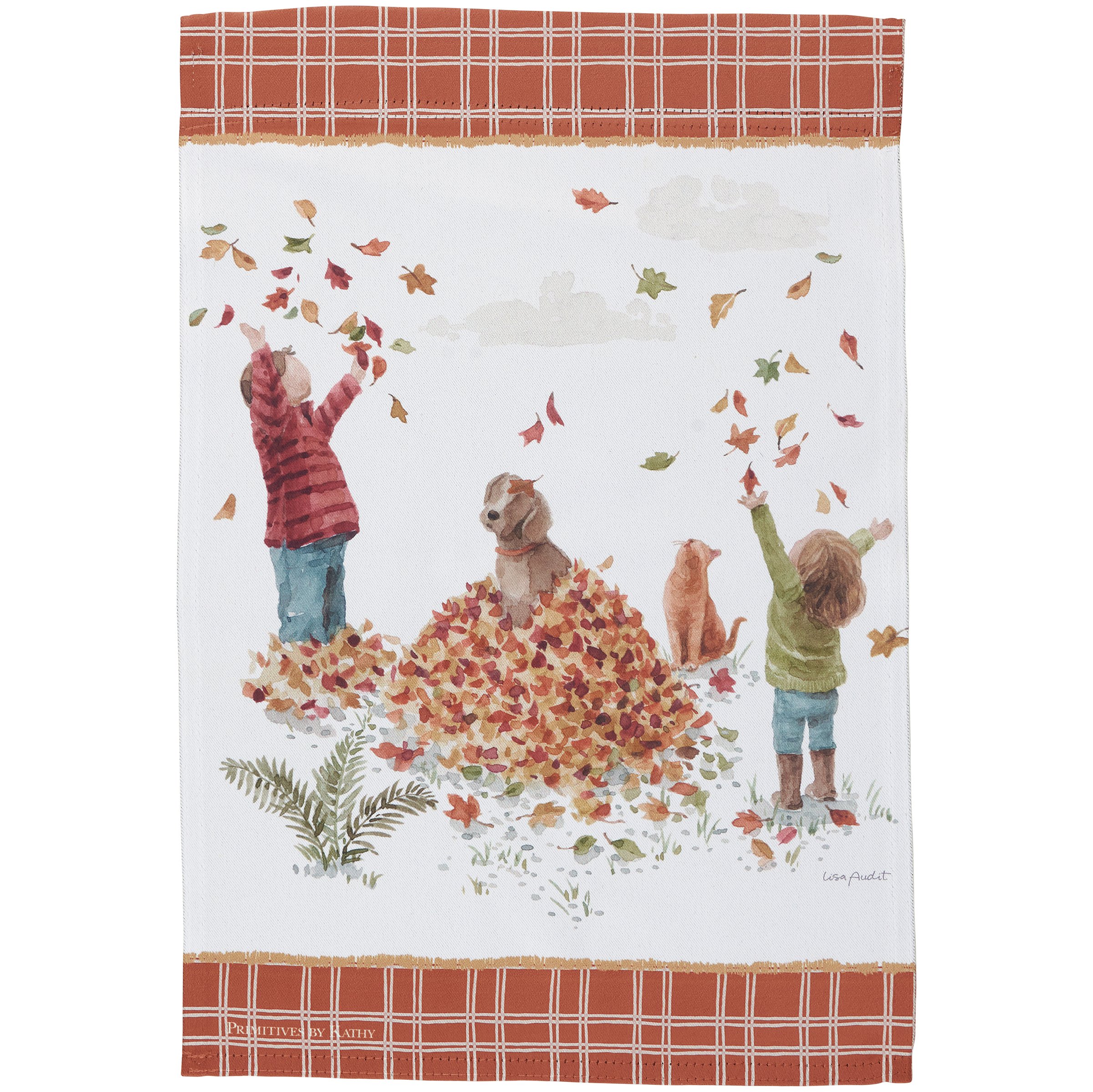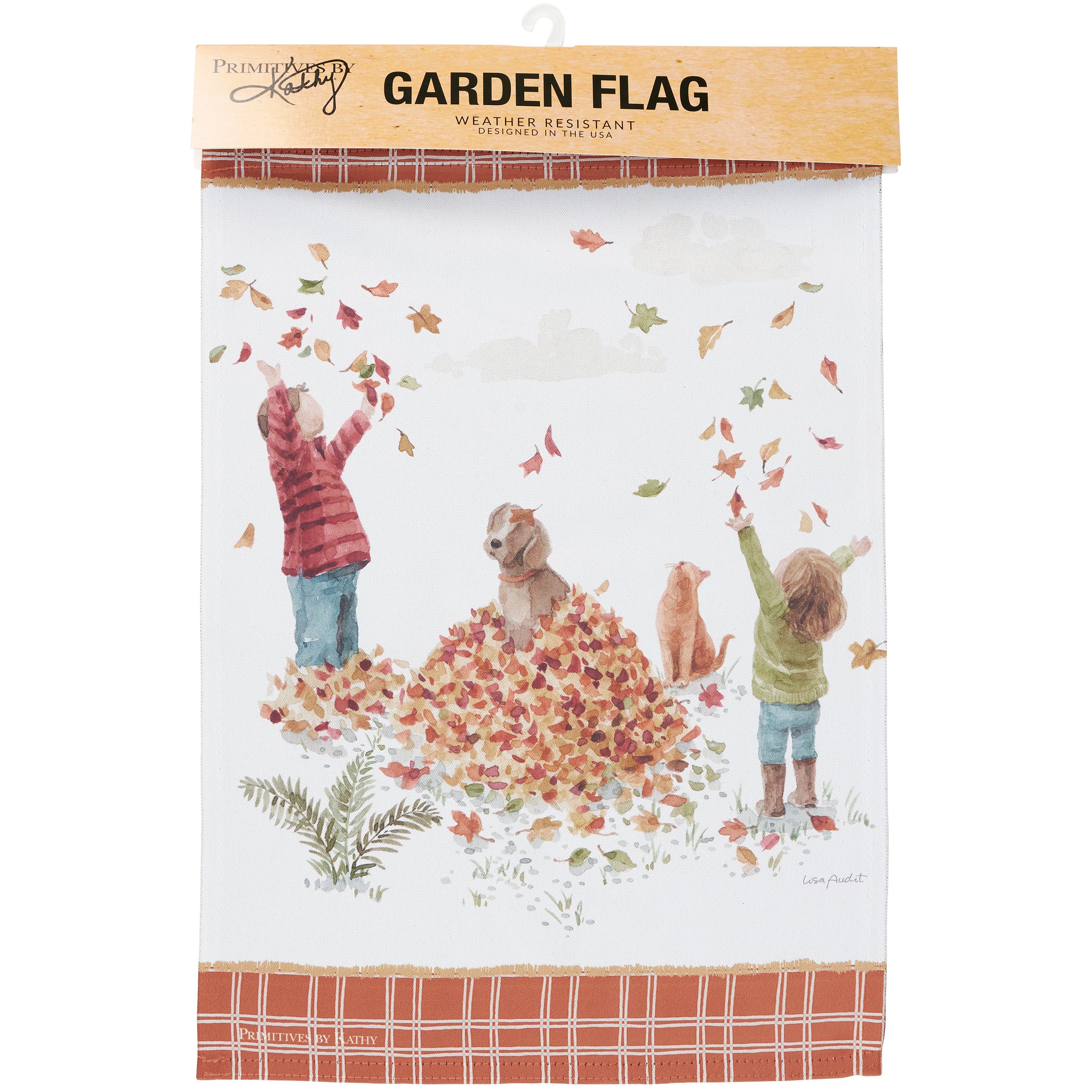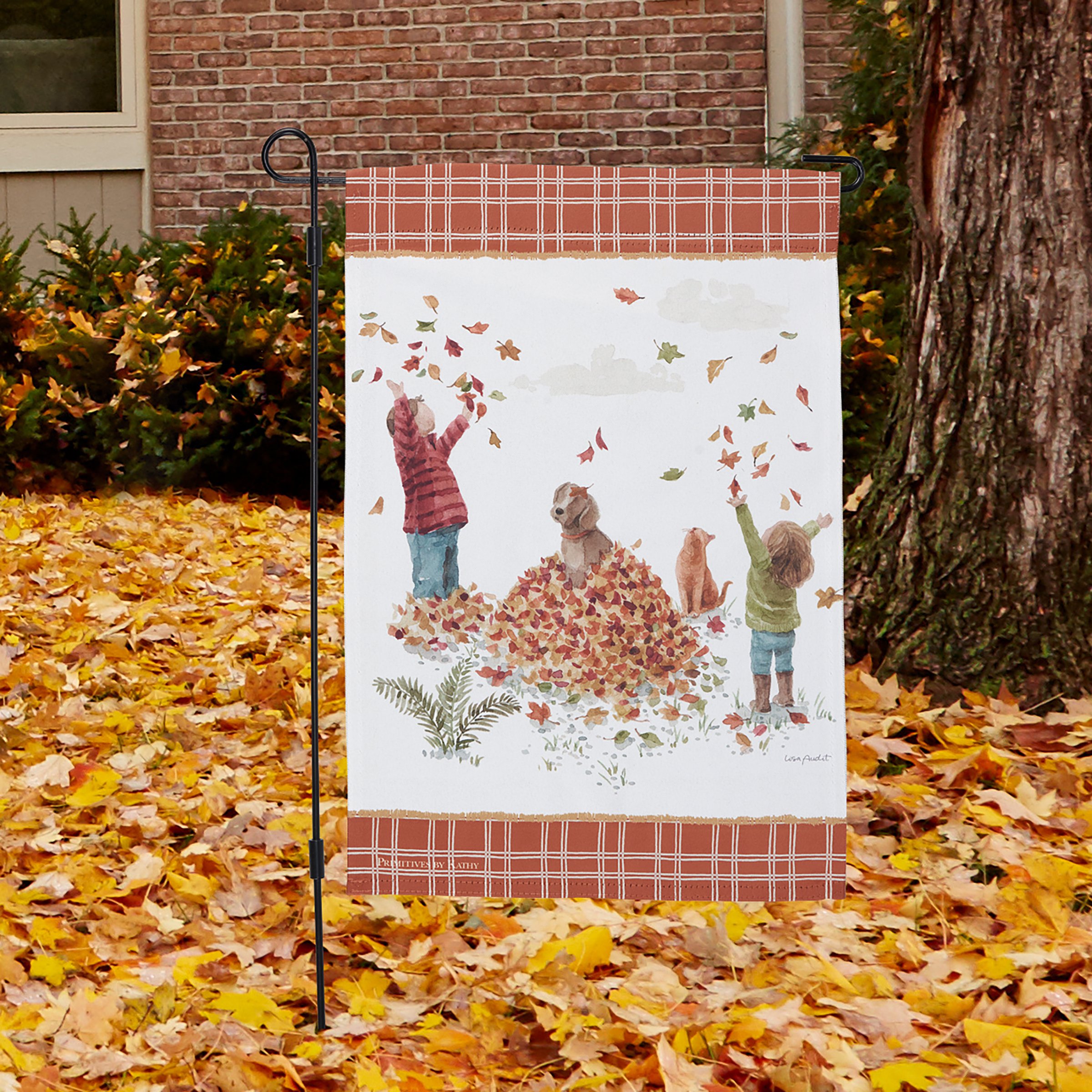 A double-sided polyester garden flag from our Fall & Harvest Collection displaying a charming scene of children and pets playing in autumn leaves. Design also features coordinating fall inspired patterns at the top and bottom. Flag design is replicated from original art hand painted in a delicate watercolor style. Seasonal garden flag is weather-resistant and features an opening to hang on our Garden Flag Pole. Our Fall Days garden flag is packaged with a header card and hook to easily hang on rack. Hand wash only. A charming fall-themed home accent perfect for seasonal display in any yard or garden.