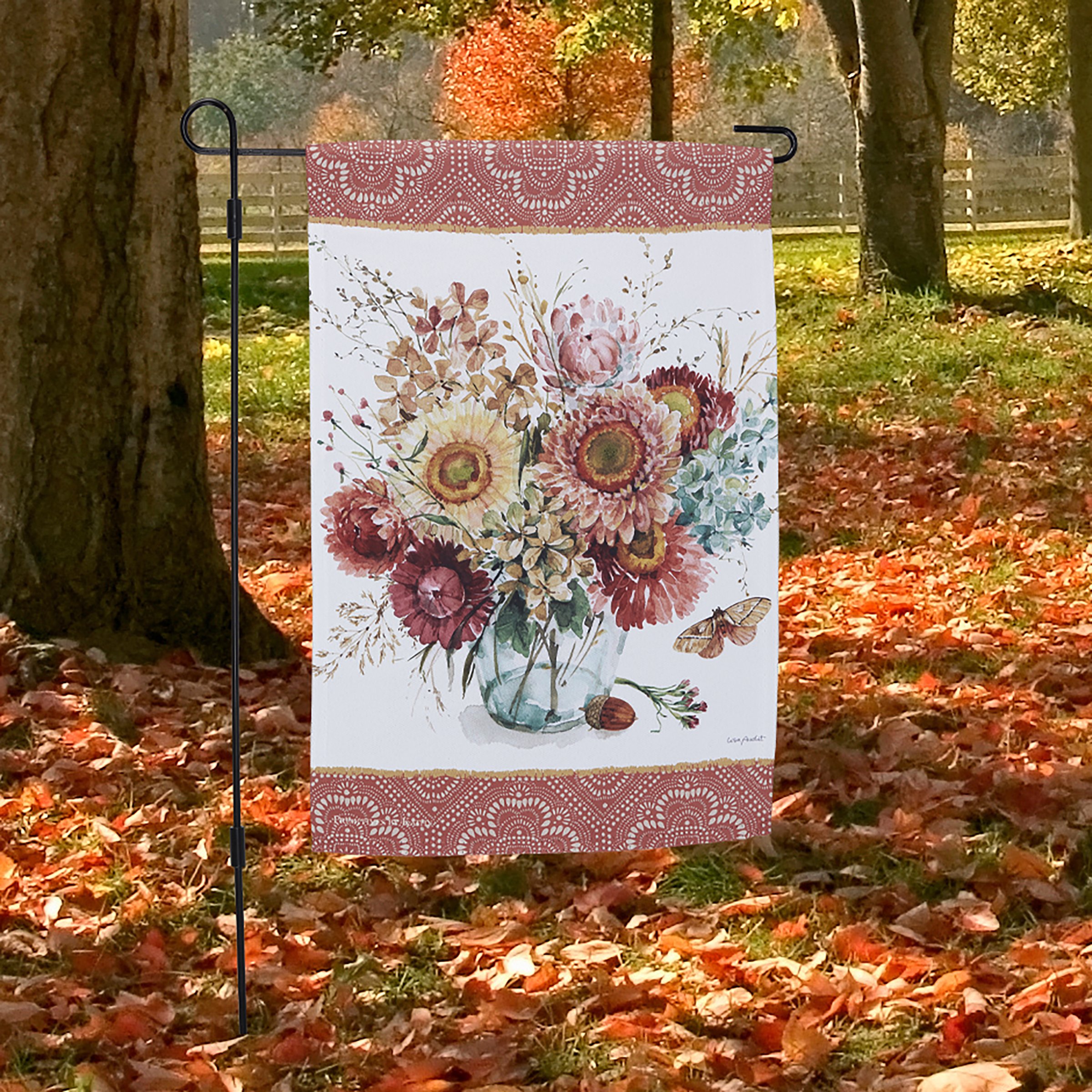 A double-sided polyester garden flag from our Fall & Harvest Collection displaying a vase full of fall florals. Design also features coordinating fall inspired patterns at the top and bottom. Flag design is replicated from original art hand painted in a delicate watercolor style. Seasonal garden flag is weather-resistant and features an opening to hang on our Garden Flag Pole. Our Fall Floral Vase garden flag is packaged with a header card and hook to easily hang on rack. Hand wash only. A charming fall-themed home accent perfect for seasonal display in any yard or garden.