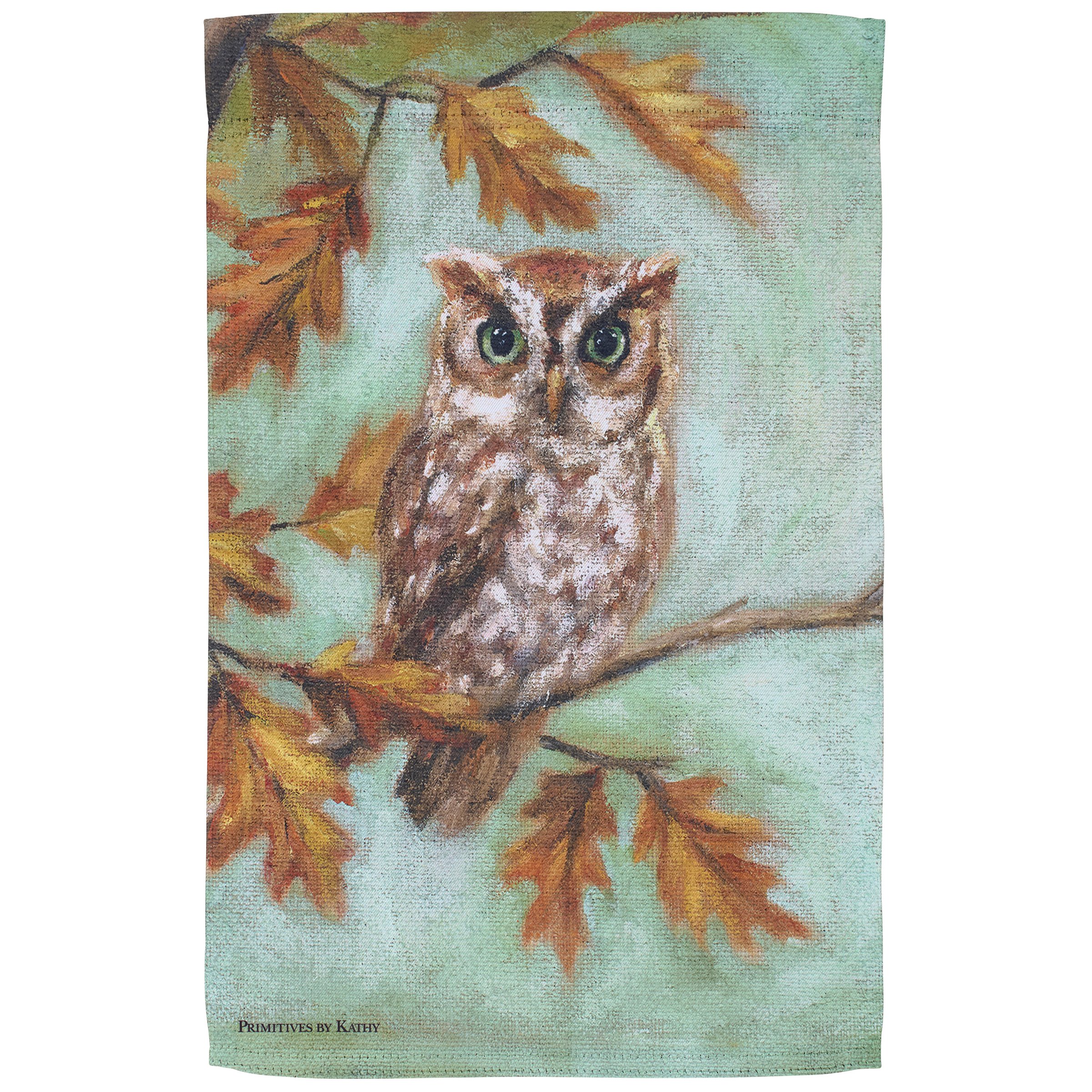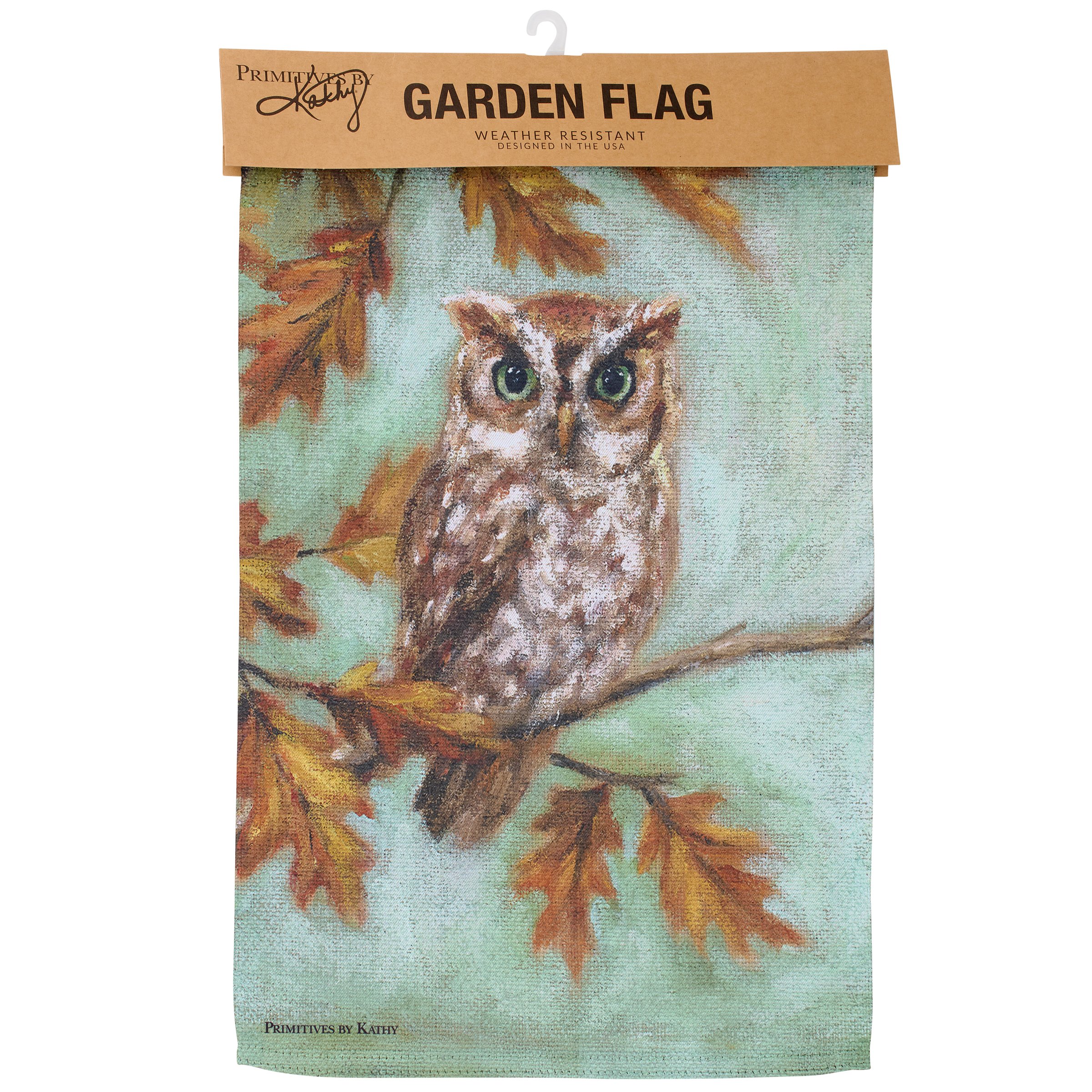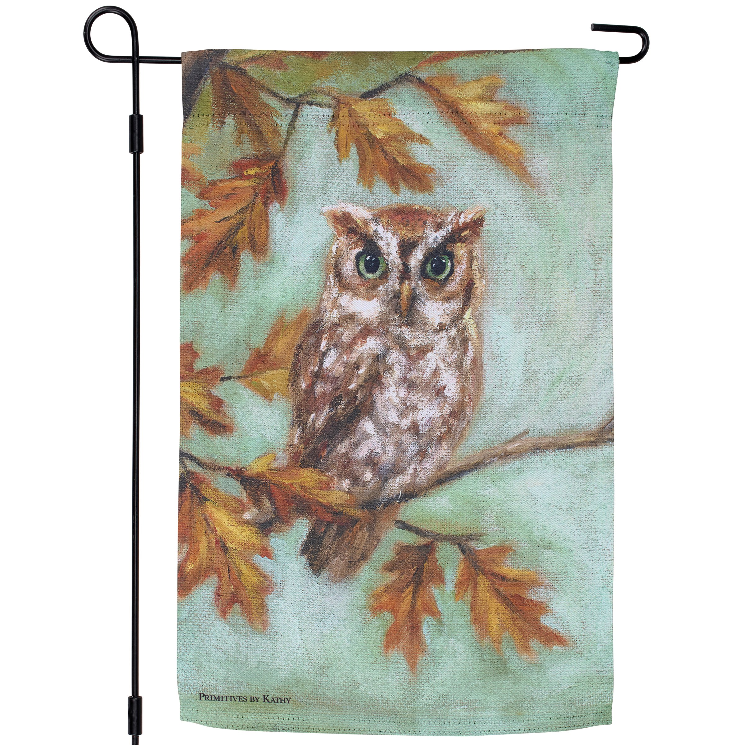 A polyester garden flag from our Fall & Harvest Collection featuring a double-sided design displaying a charming fall scene of an owl perched on a branch of autumn leaves. Fall owl design is replicated from original artwork painted onto burlap canvas, giving the art a unique depth and texture. Seasonal garden flag is weather-resistant and features an opening to hang on our Garden Flag Pole. Hand wash only. Our Fall Owl garden flag is packaged with a header card and hook to easily hang on rack for store display. A fall home accent perfect for seasonal display in any yard or garden.