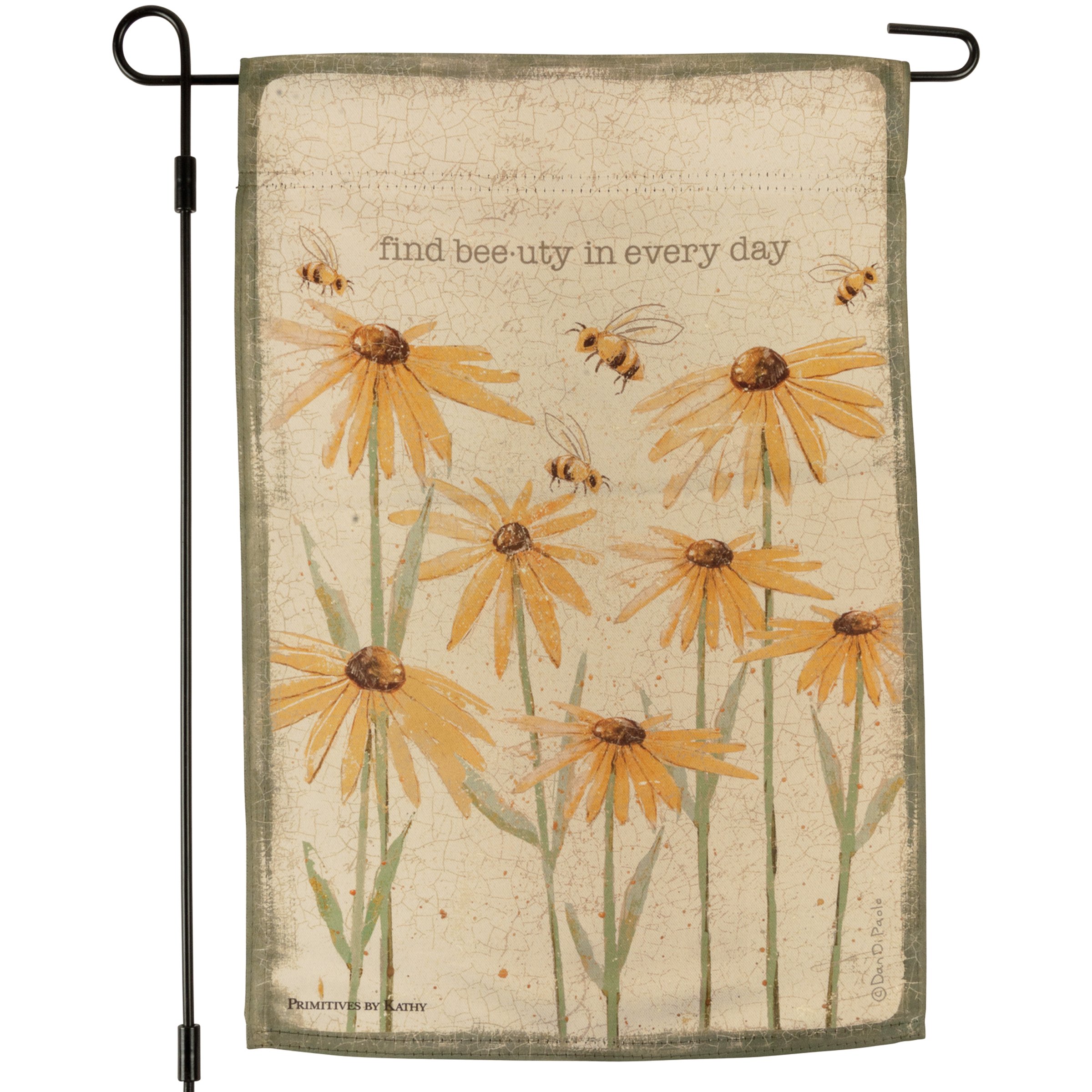 A double-sided polyester garden flag from our Garden Collection featuring rustic bee and coneflower designs with "Find Beeuty In Every Day" sentiment. Our Find Beeuty garden flag is weather-resistant and features an opening to hang on a garden flag pole. Hand-wash only.